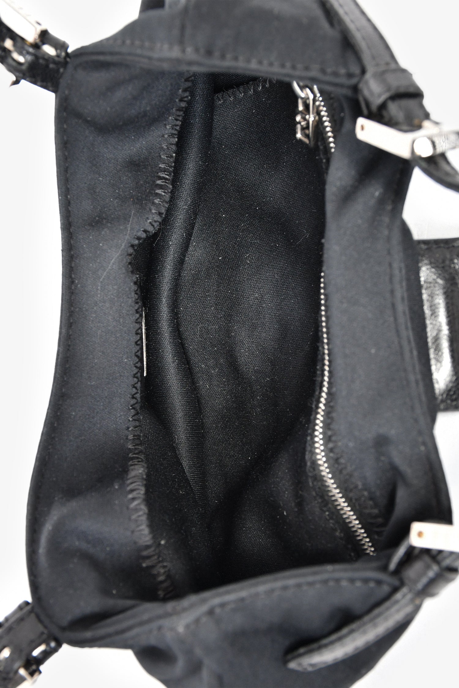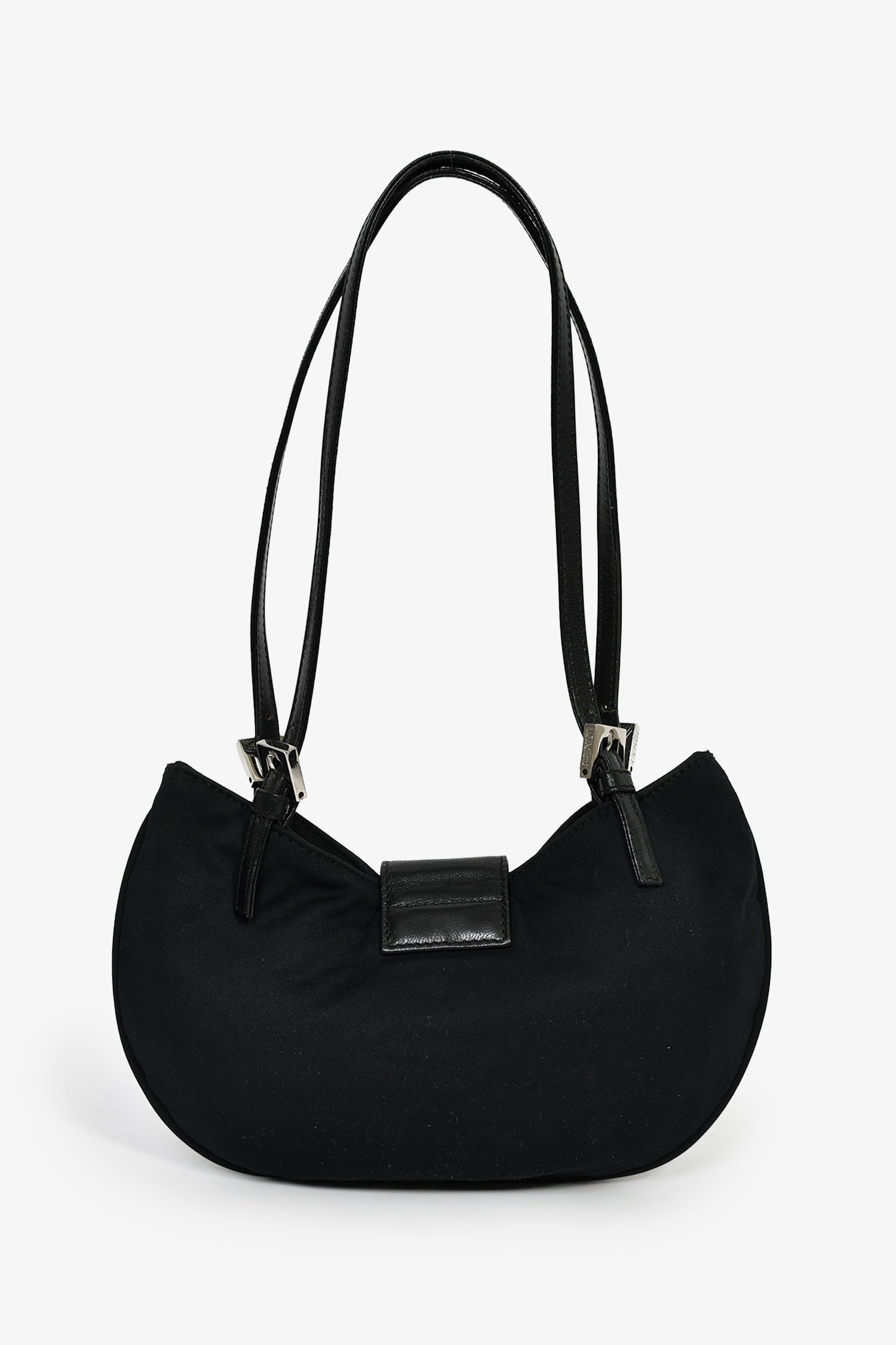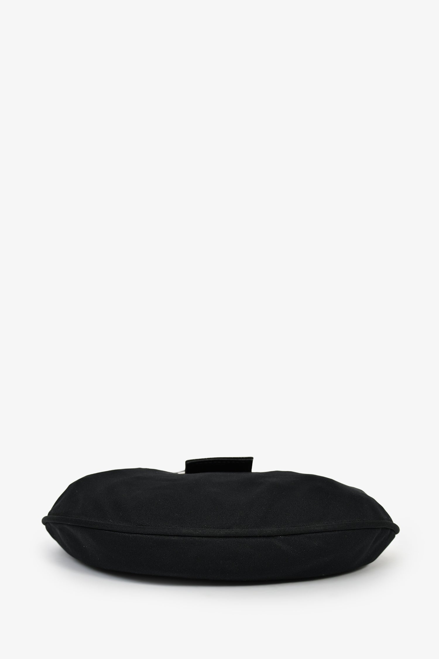Fendi Black Fabric Mamma Half Moon Shoulder Bag. Front-fold-over-flap with snap-button-up closure. Twin shoulder straps with adjustable pull-through buckle closure. Lined interior with rear zip-up pocket. Silver-tone hardware. Tonal stitching.