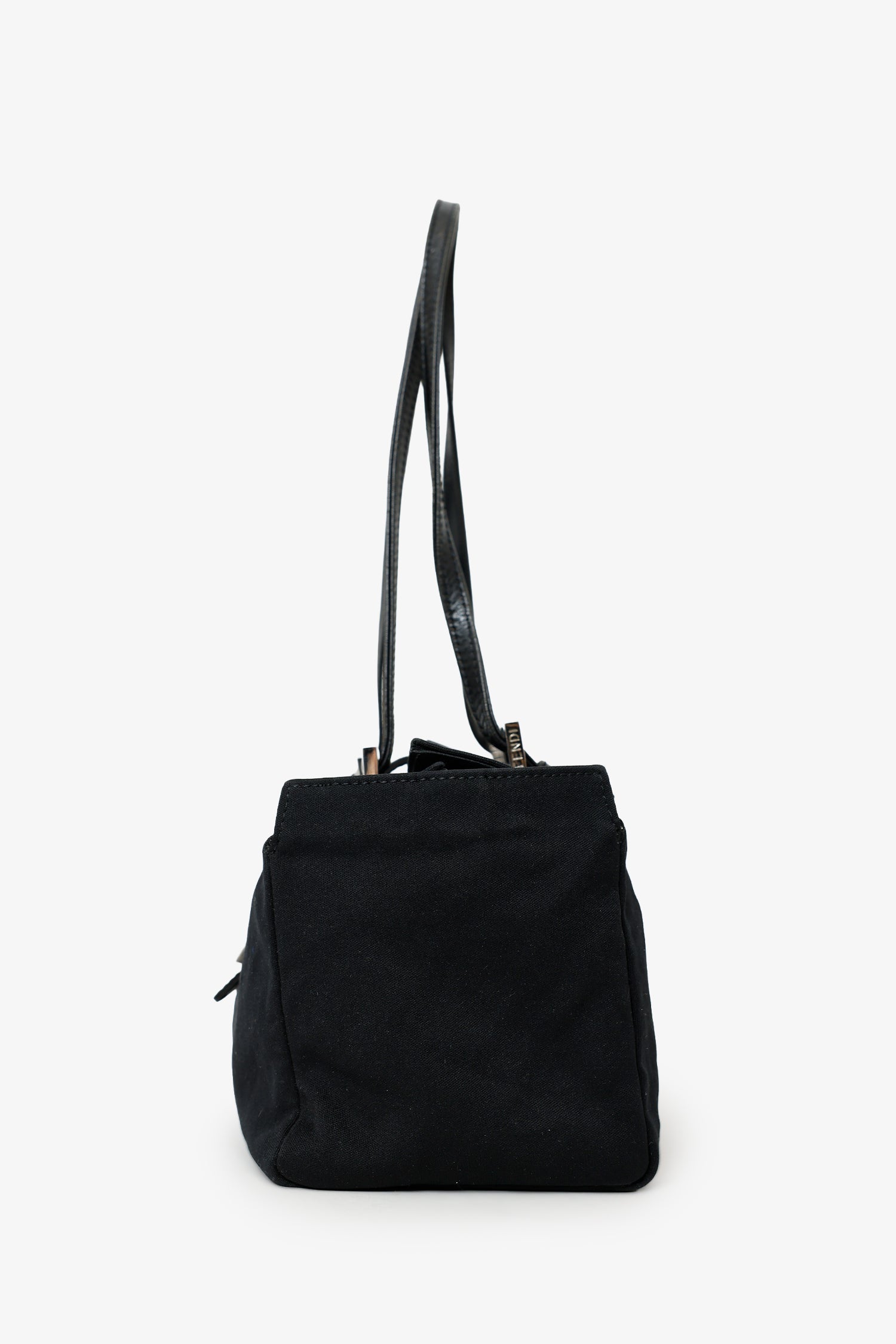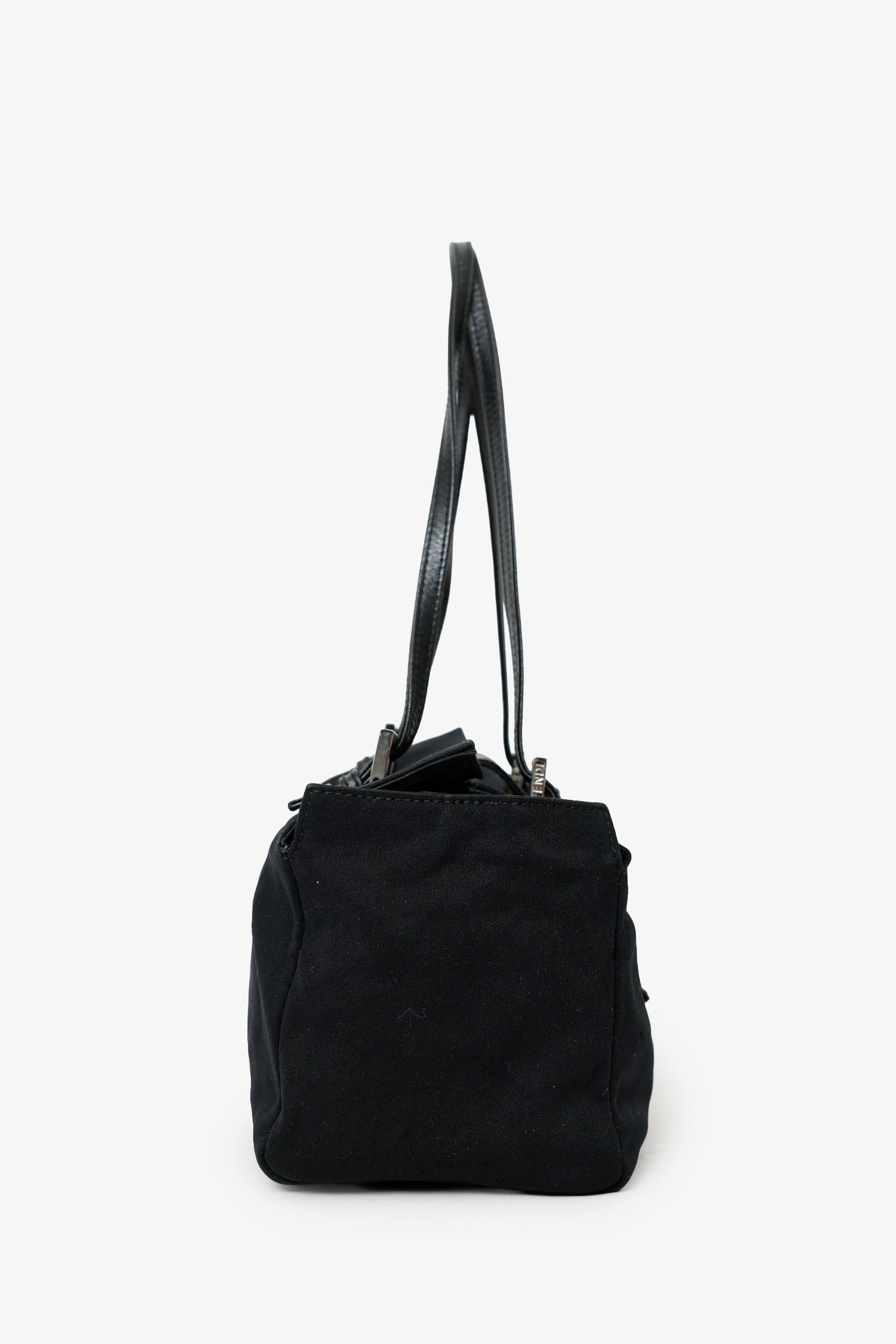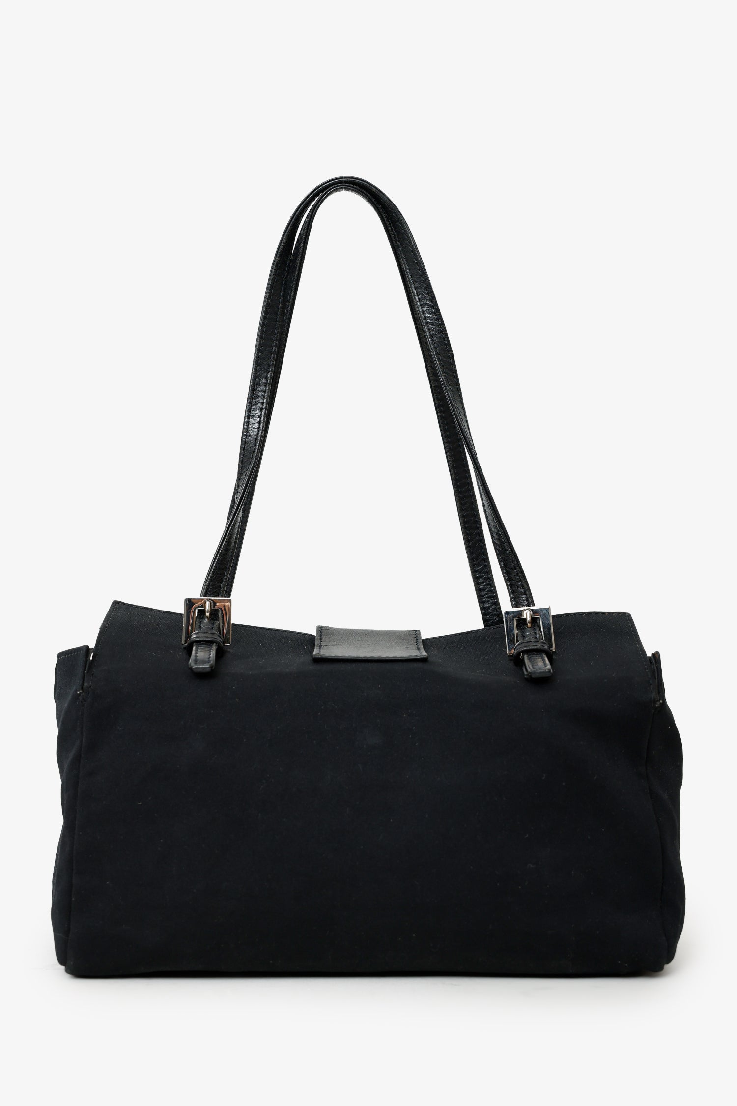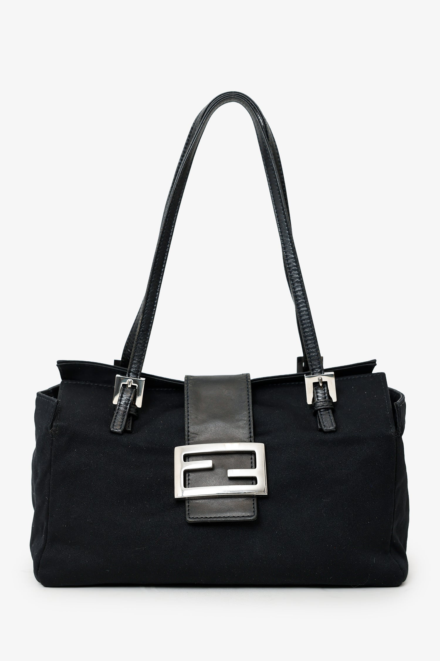 Fendi Black Fabric Neoprene Baguette Shoulder Bag. Front fold-over flap with snap-button-up closure. Twin shoulder straps with pull-through buckle closure. Lined interior with single rear slip pocket. Removable cherry pins. Silver-tone hardware. Tonal stitching.