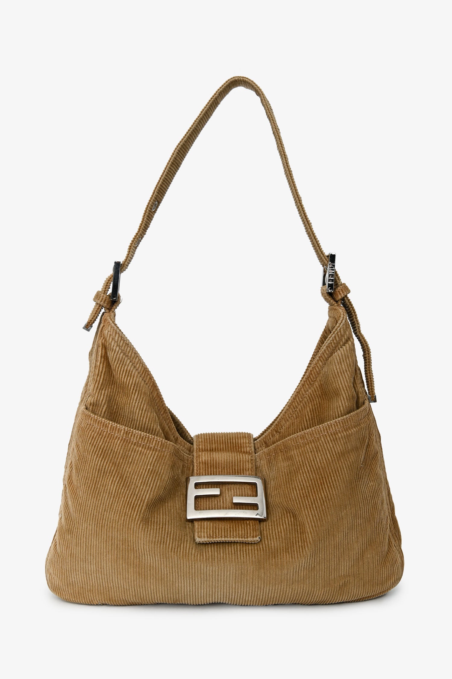 Fendi Brown Corduroy Baguette Hobo Shoulder Bag. Fold-over strap with a snap closure. Adjustable shoulder strap. 2 interior compartments and 1 wall zipper. Silver-tone hardware. Tonal stitching.