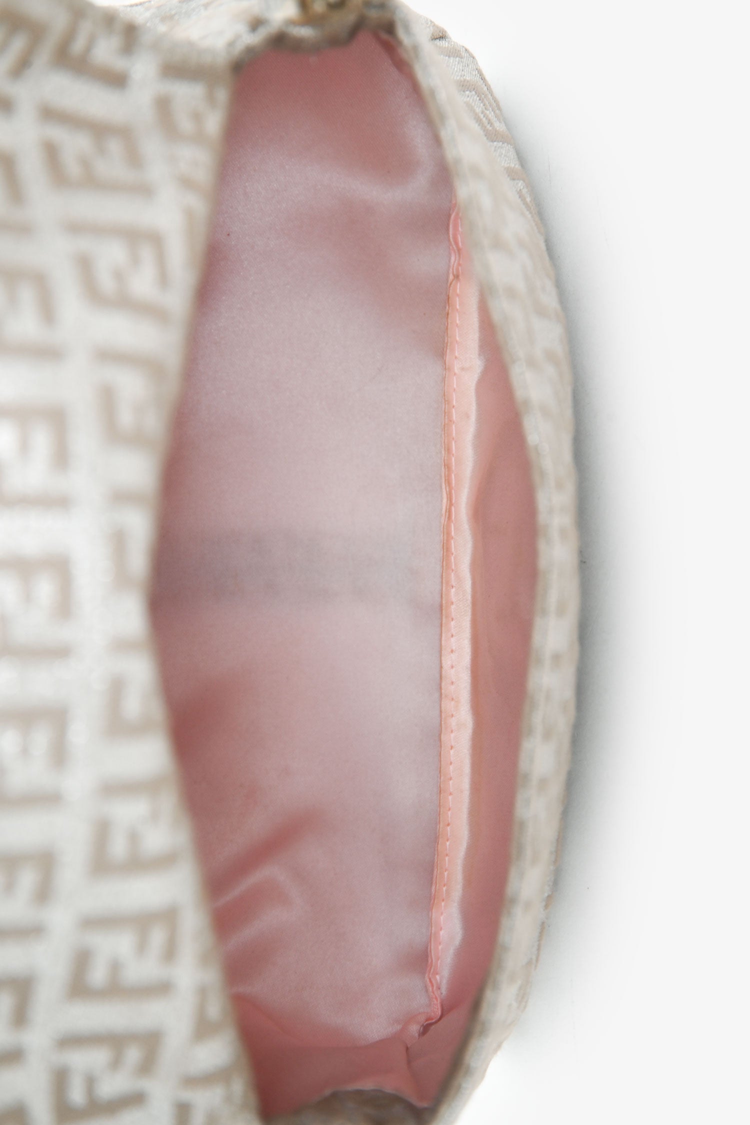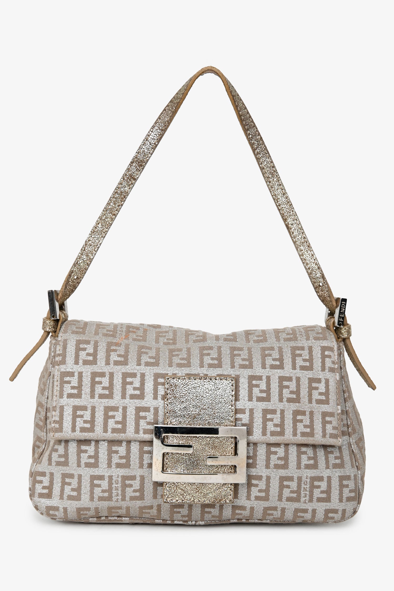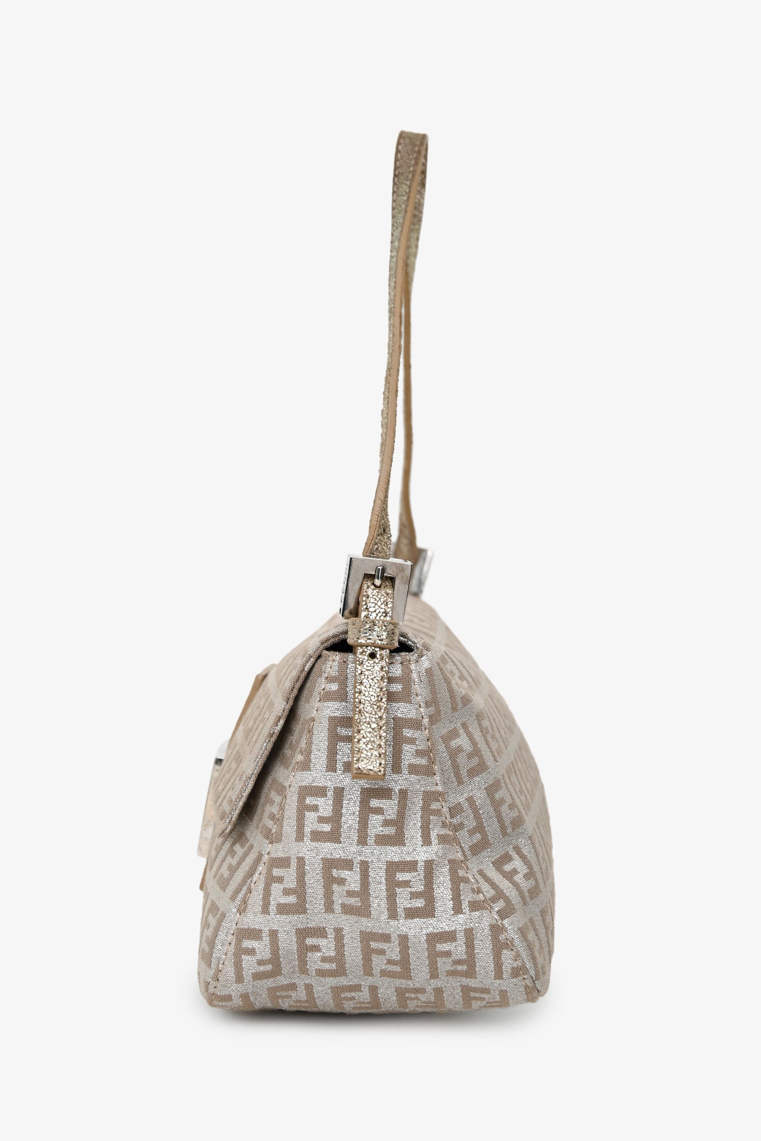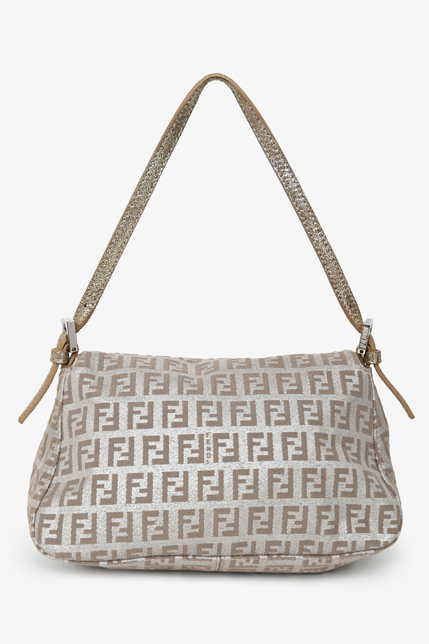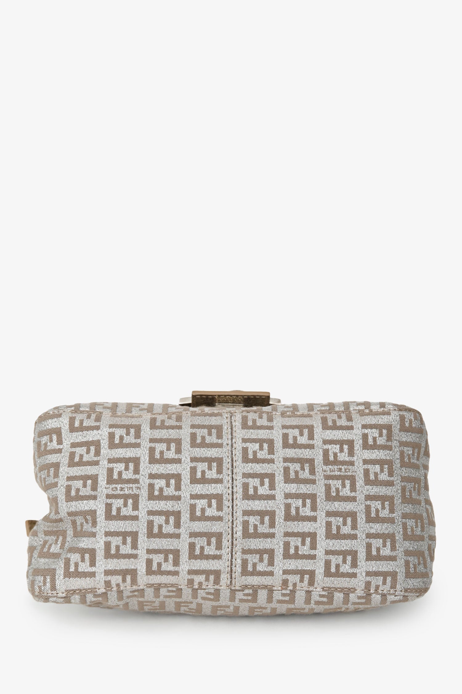 Fendi Silver/Beige FF Zucca Baguette Shoulder Bag. Fold-over flap with a snap closure. Single adjustable shoulder strap. Lined interior with 1 card slip. Silver-tone hardware. Tonal stitching.