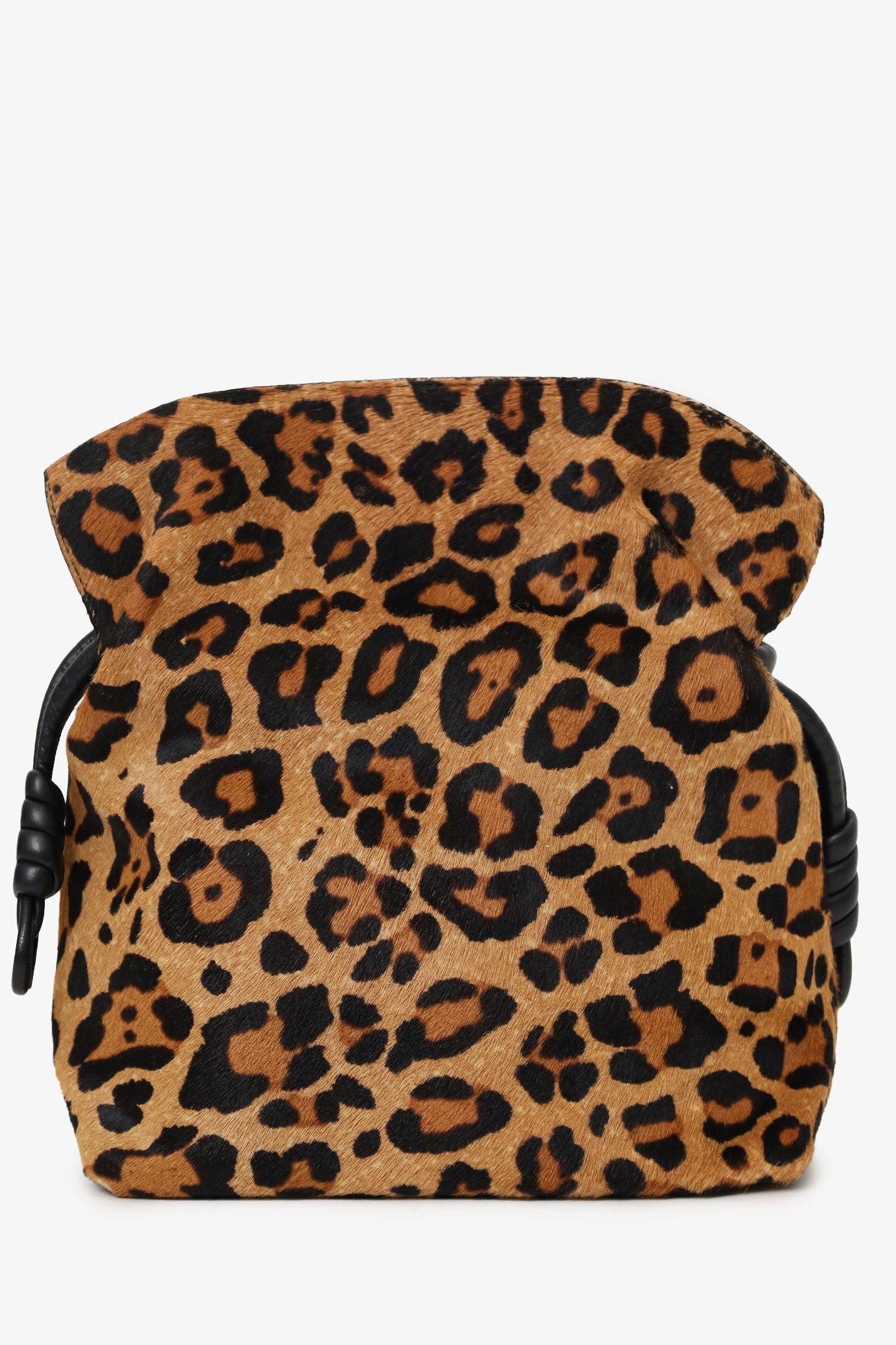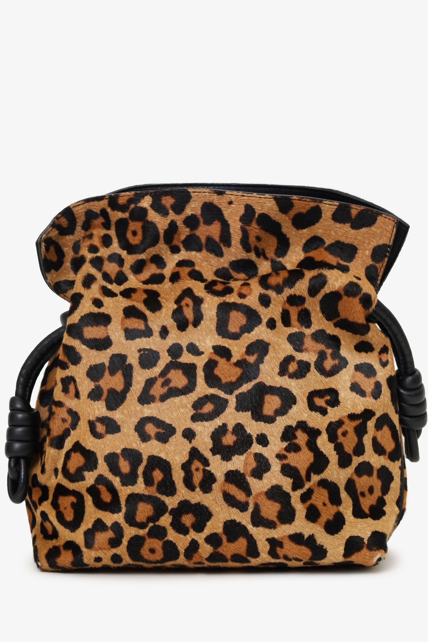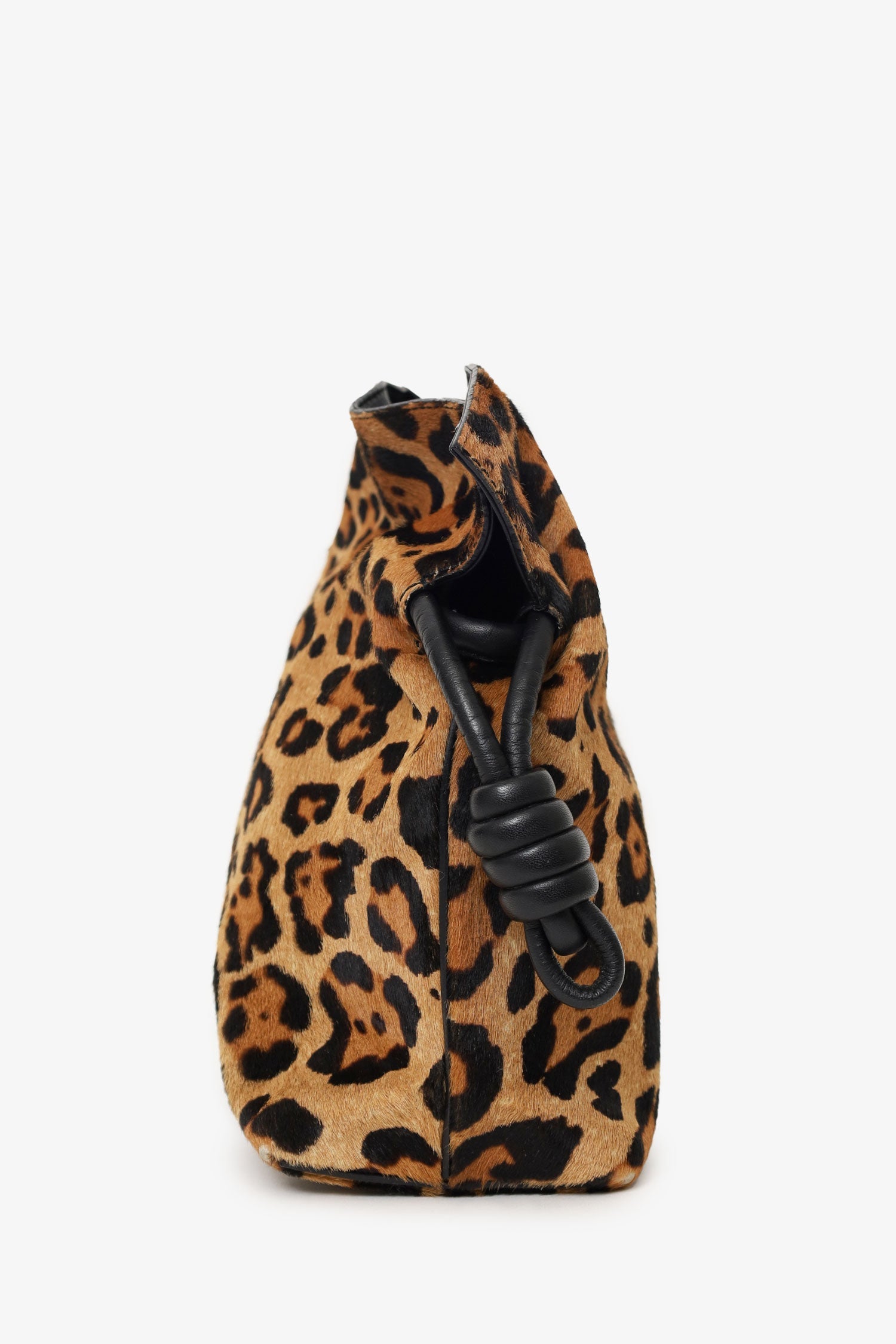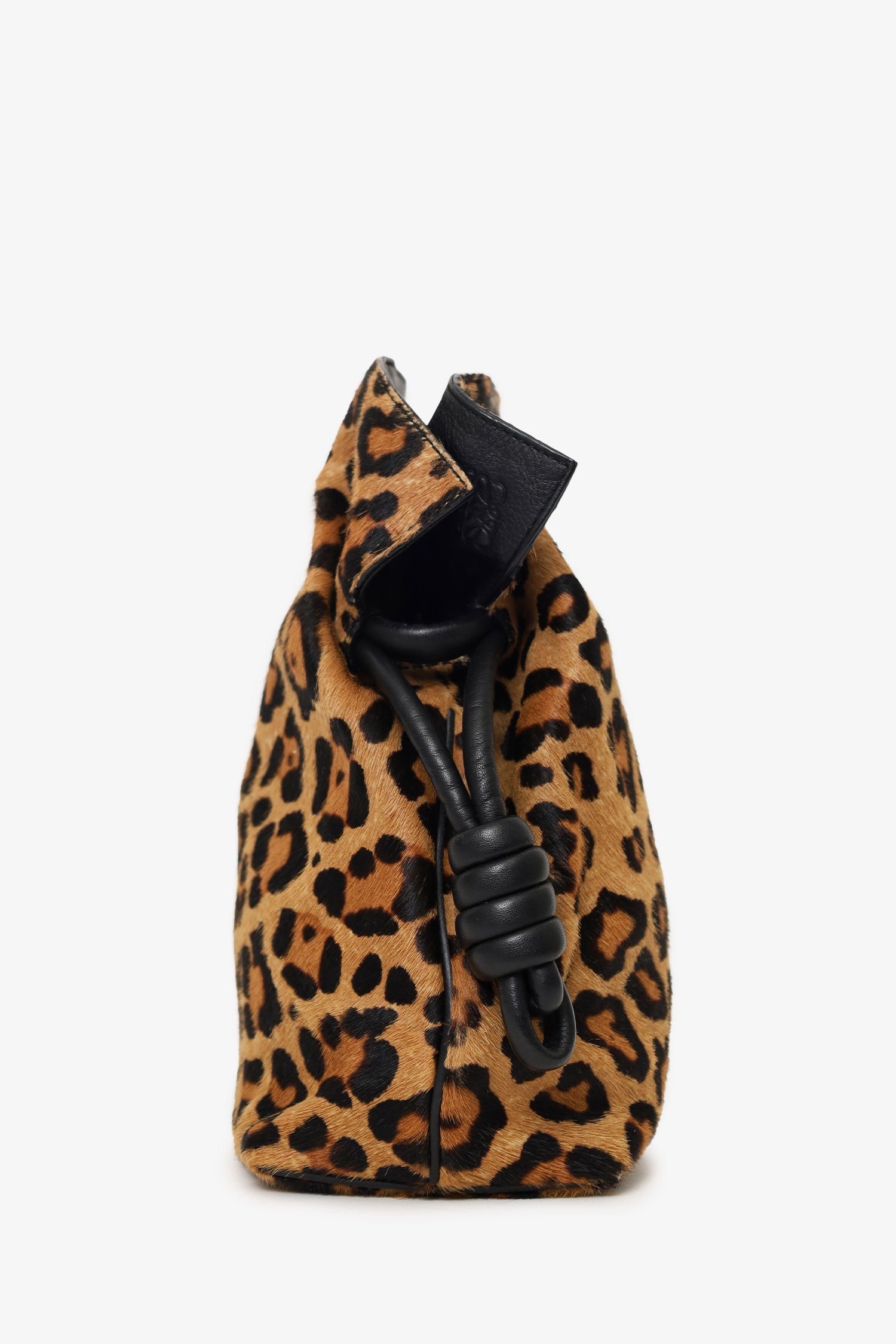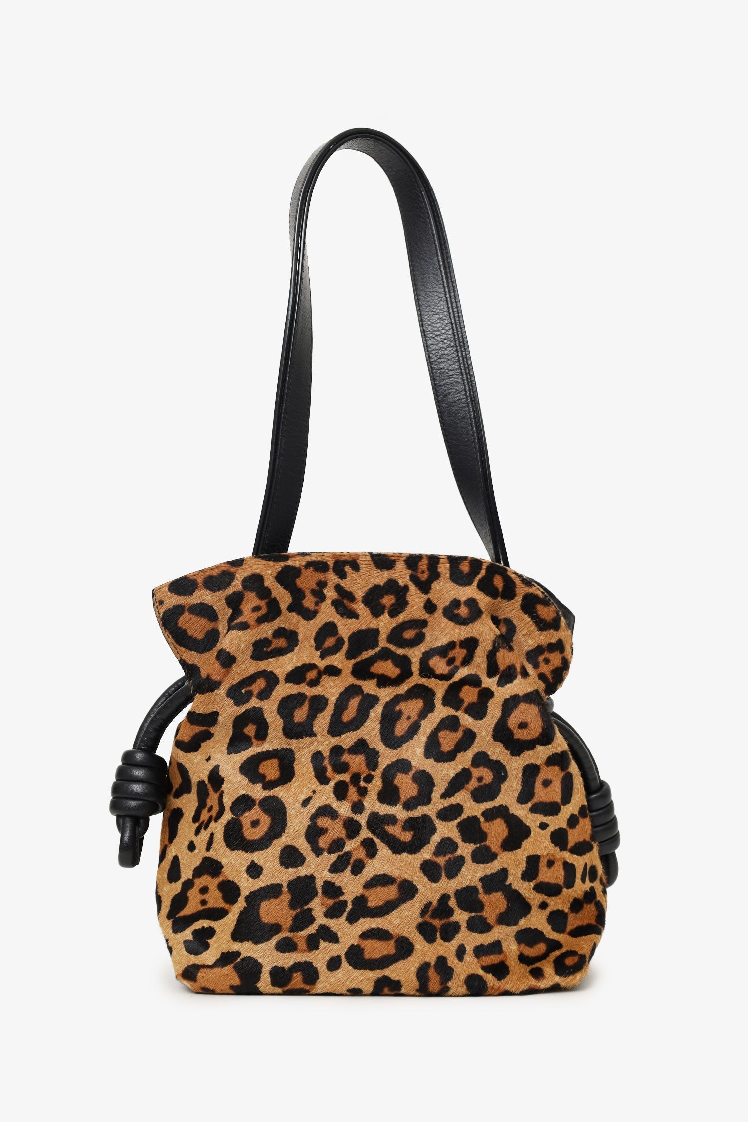 Loewe Leopard Pony Hair Flamenco Knot Bag. Top interior magnetic closure. Side knotted cinching closure. Twin shoulder straps with adjustable push-pin closure. Lined interior. Single interior pocket with snap-button closure. Gold-tone hardware. Tonal stitching.
