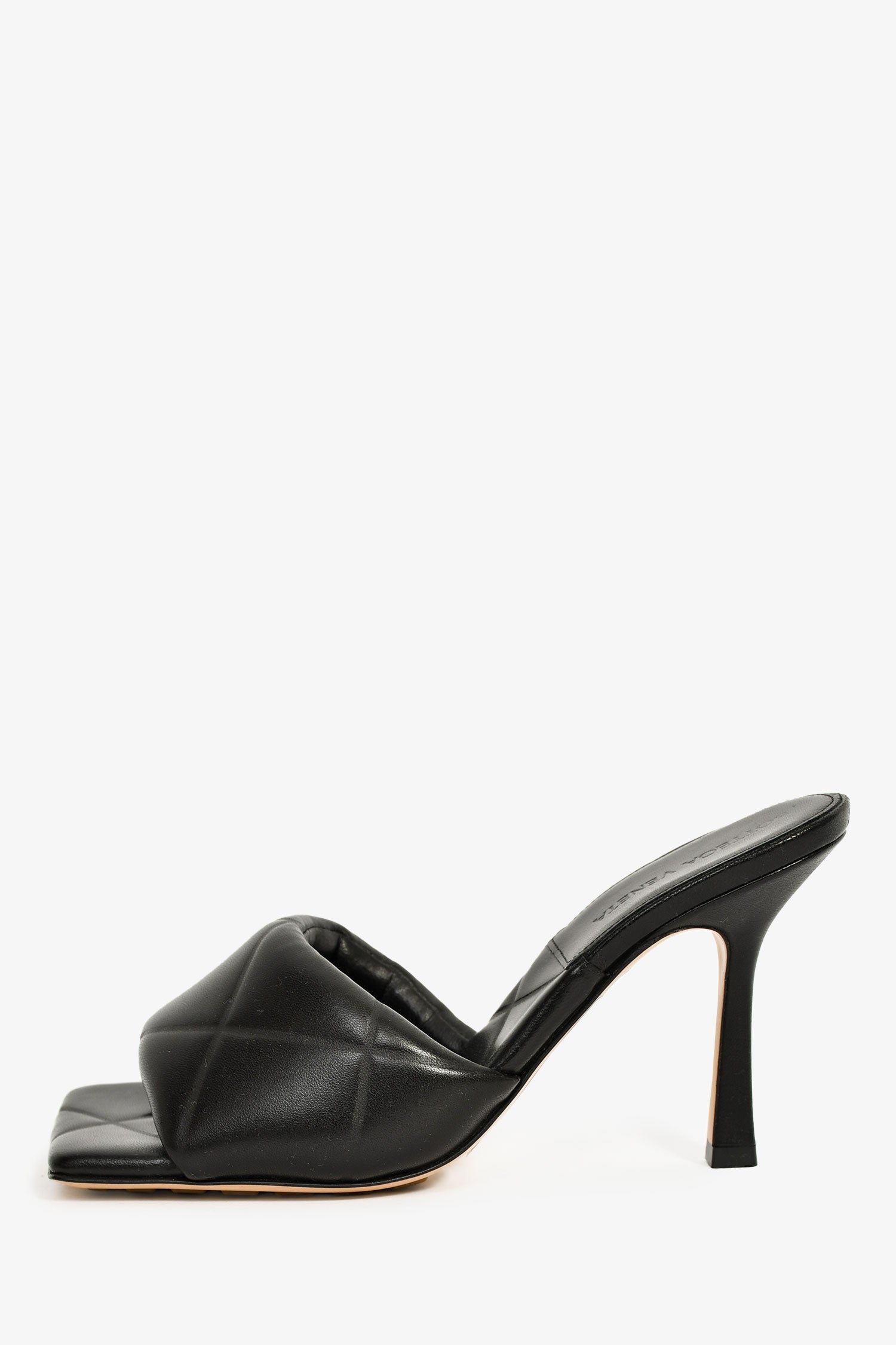 Bottega Veneta Black Intrecciato Padded Heeled Sandals. Slip-on. Open-square toe. Leather insole. Tonal stitching.