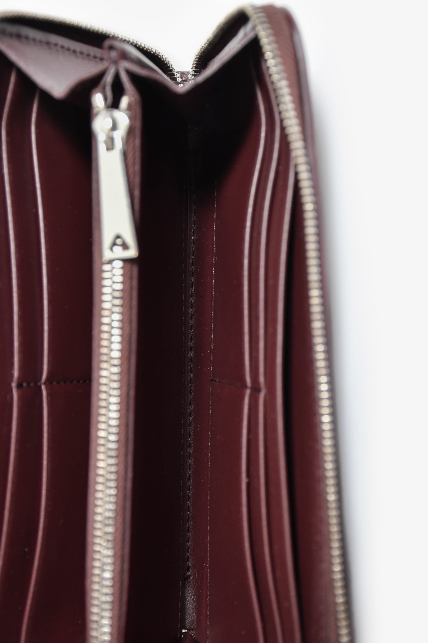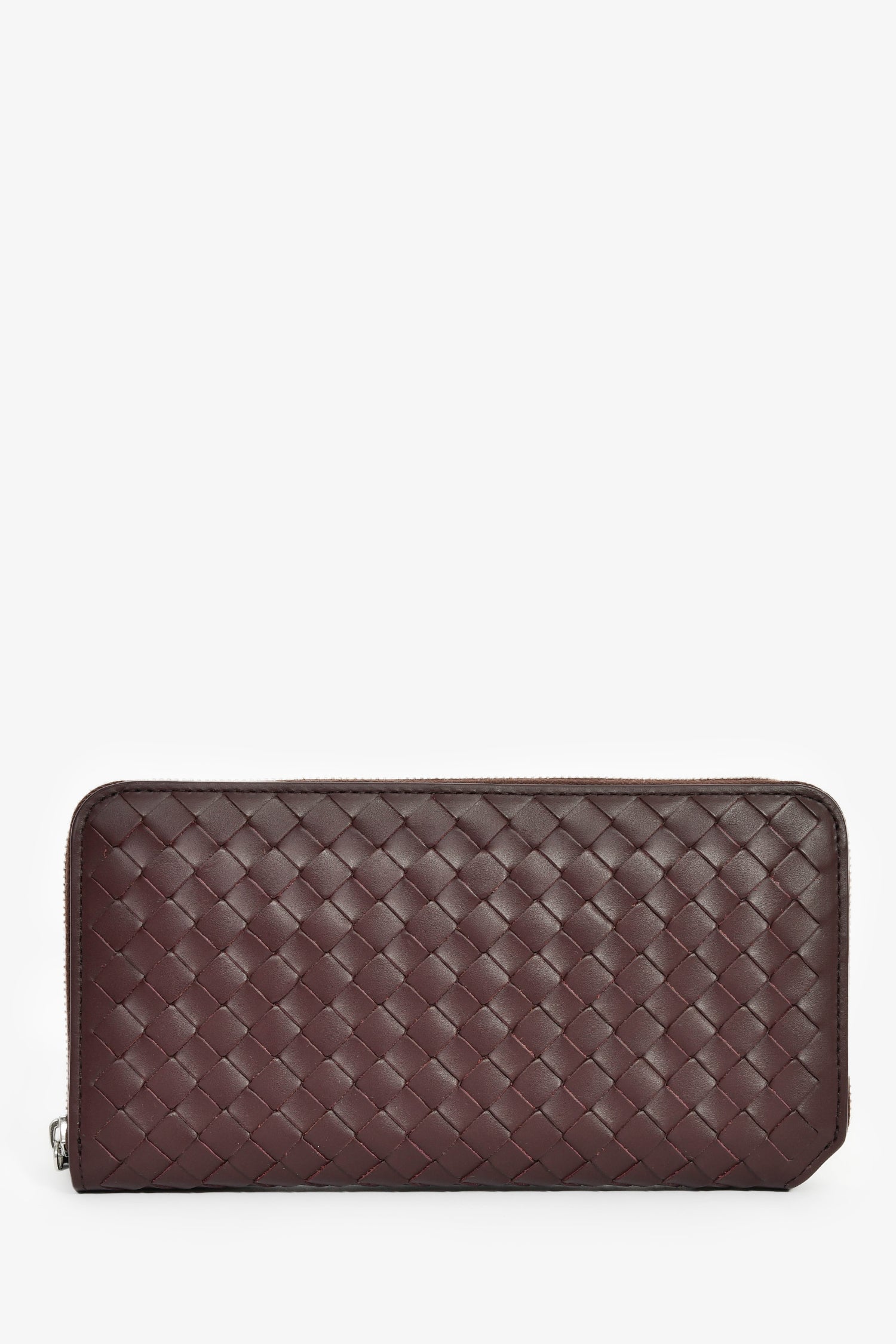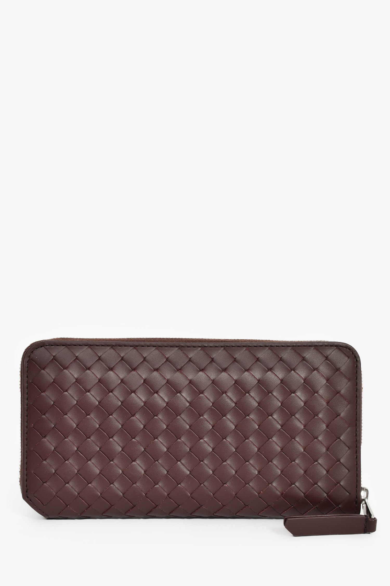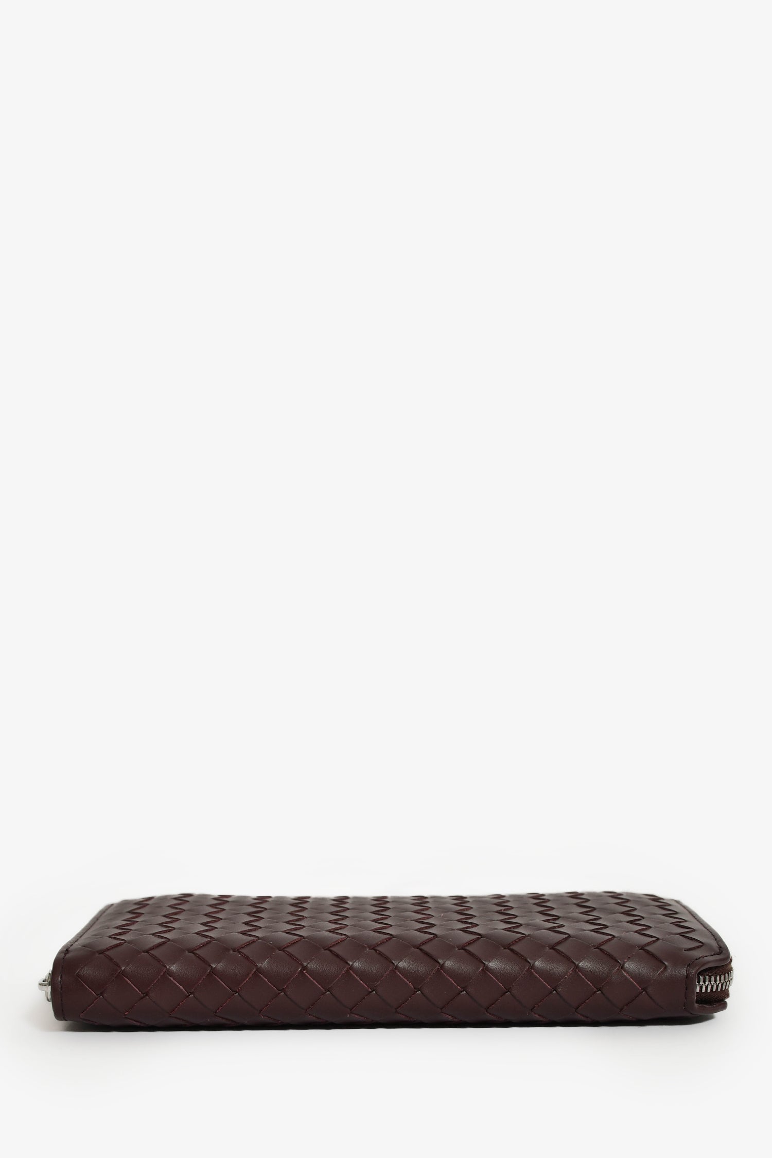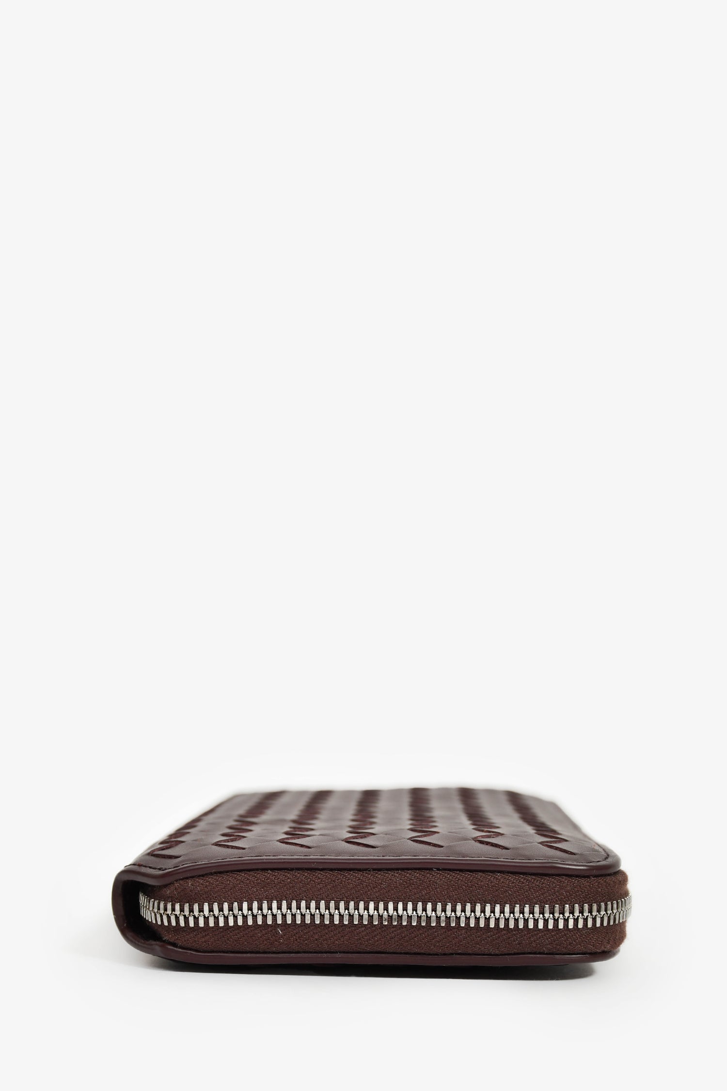 Bottega Veneta Dark Barolo Intrecciato Leather Piccolo Zip Around Wallet. Top zip closure. 2 interior compartments separated by zip pocket. 4 interior card slots in each compartment. 2 interior bill fold pockets on either side. Silver-tone hardware. Tonal stitching.