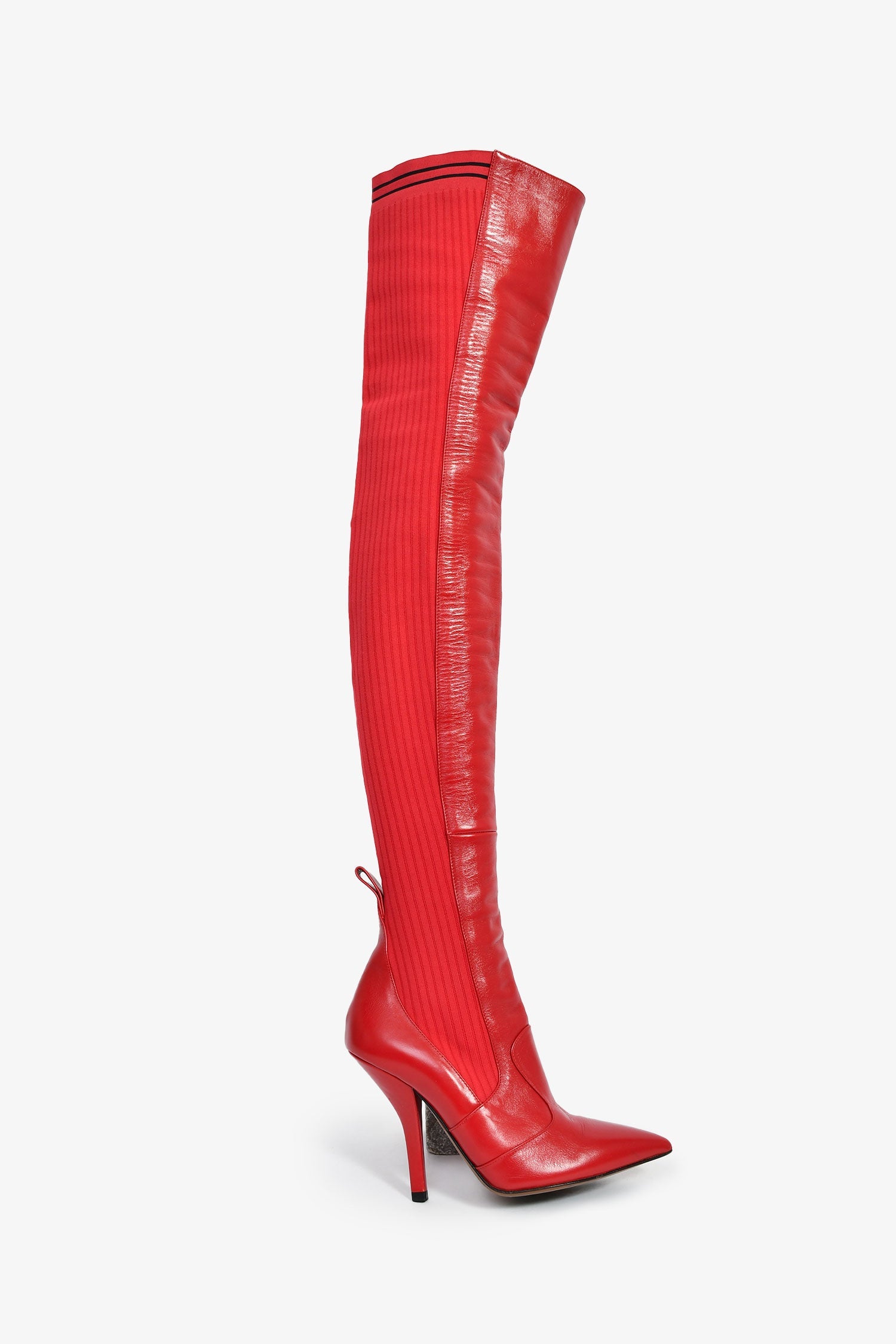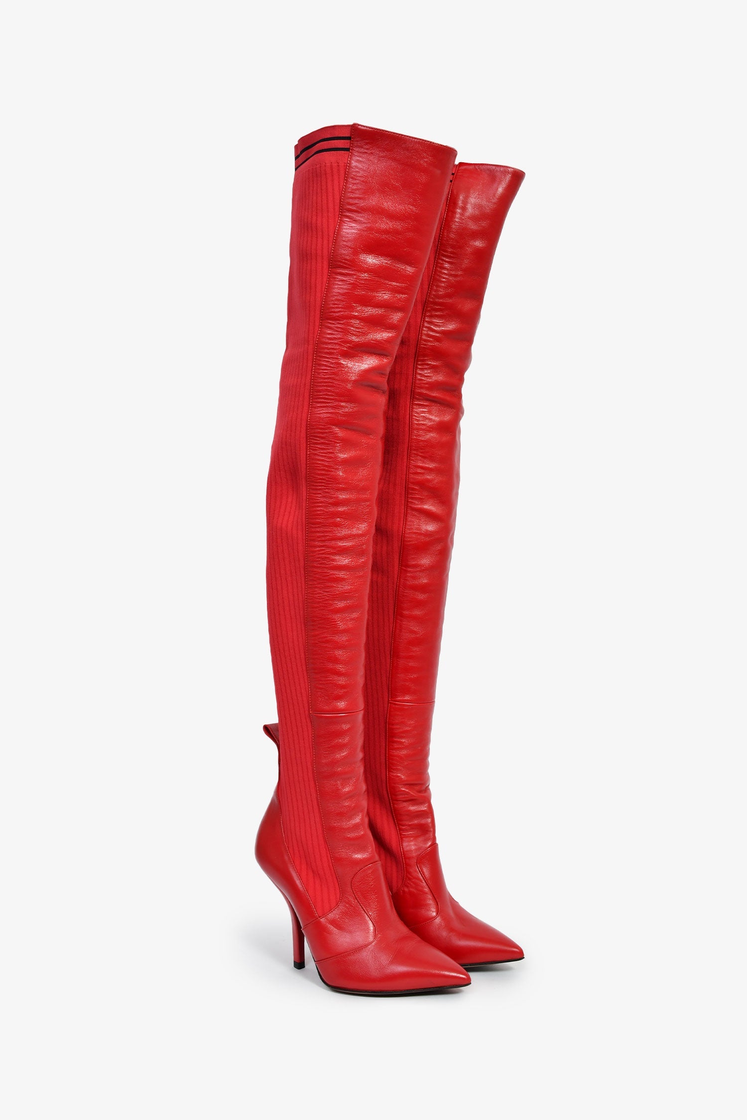 Fendi Red Leather/Knit Over The Knee 'Rockoko' Heeled Boots. Pull-on. Pointed toe. Leather interior. Tonal stitching.