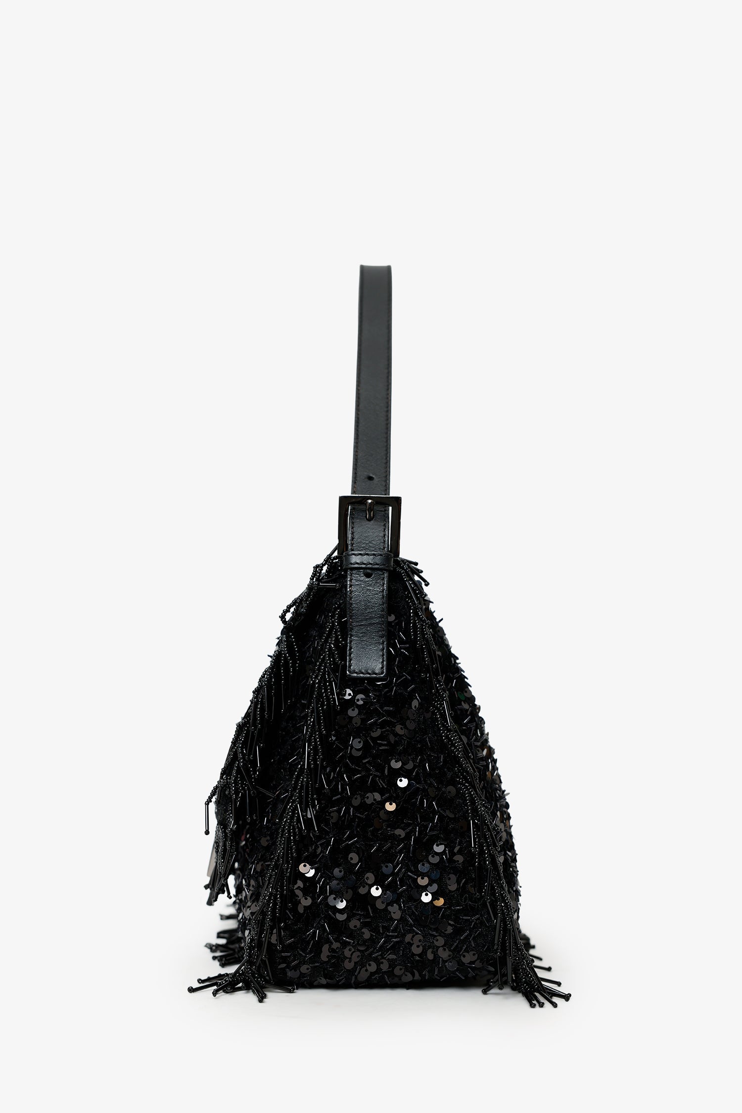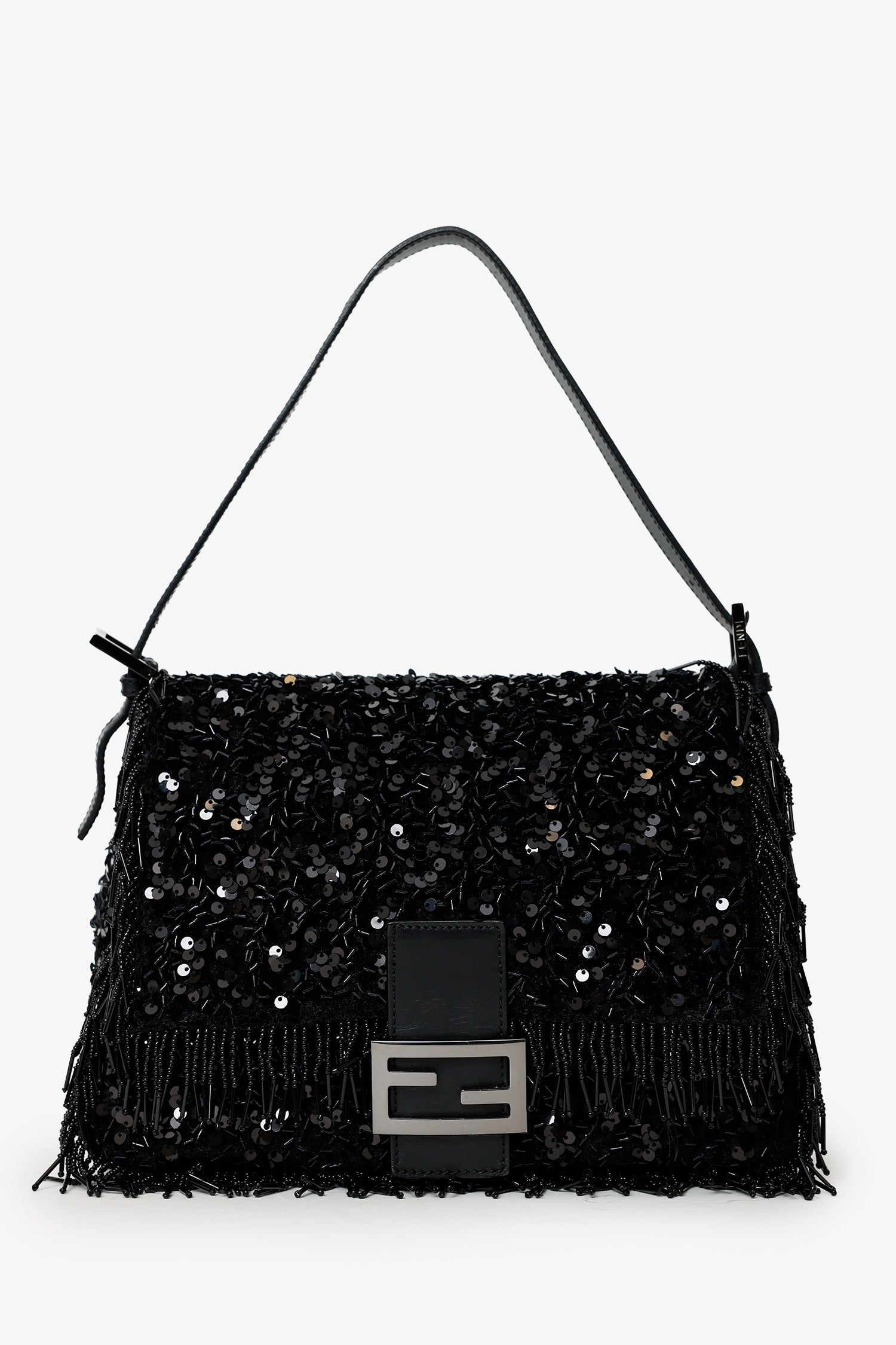 Fendi Limited Edition (1/30) Black Sequin Beaded Fringed Mama Baguette Shoulder Bag. Front-fold-over-flap with snap-button-up closure. Shoulder strap with adjustable pull-through buckle closure. Lined interior with single rear zip-up pocket. Gunmetal-tone hardware. Tonal stitching.