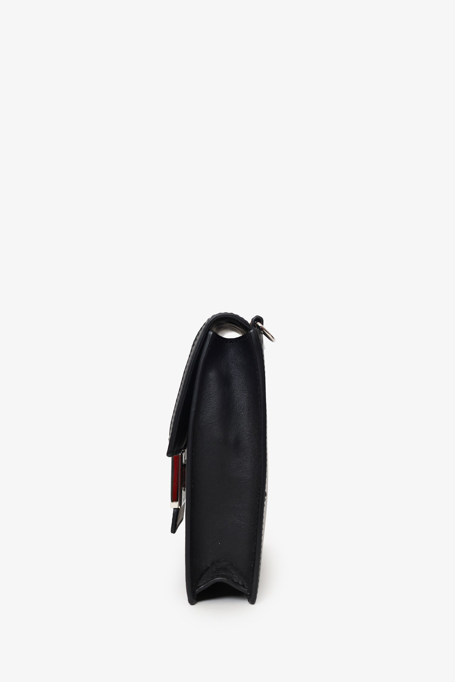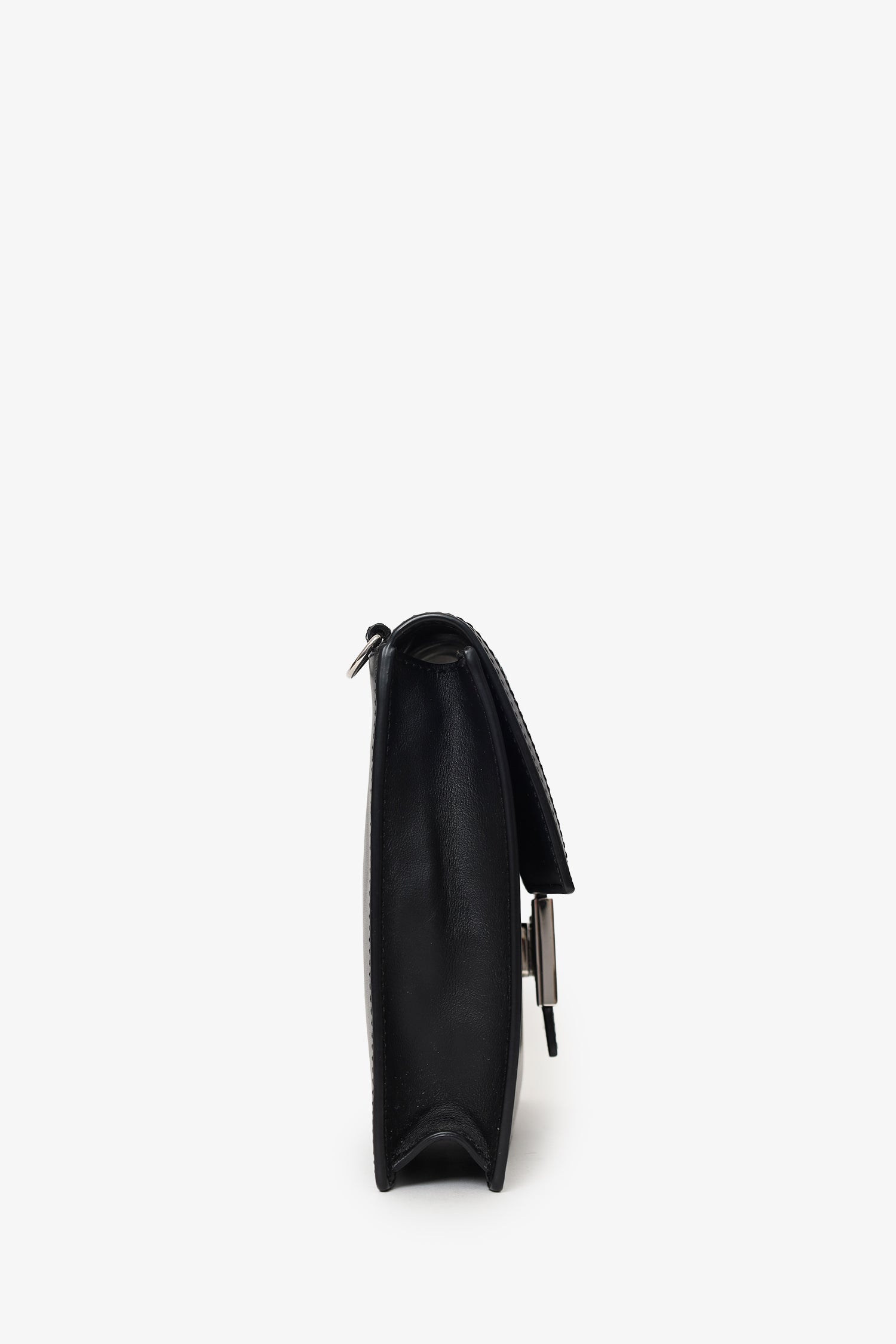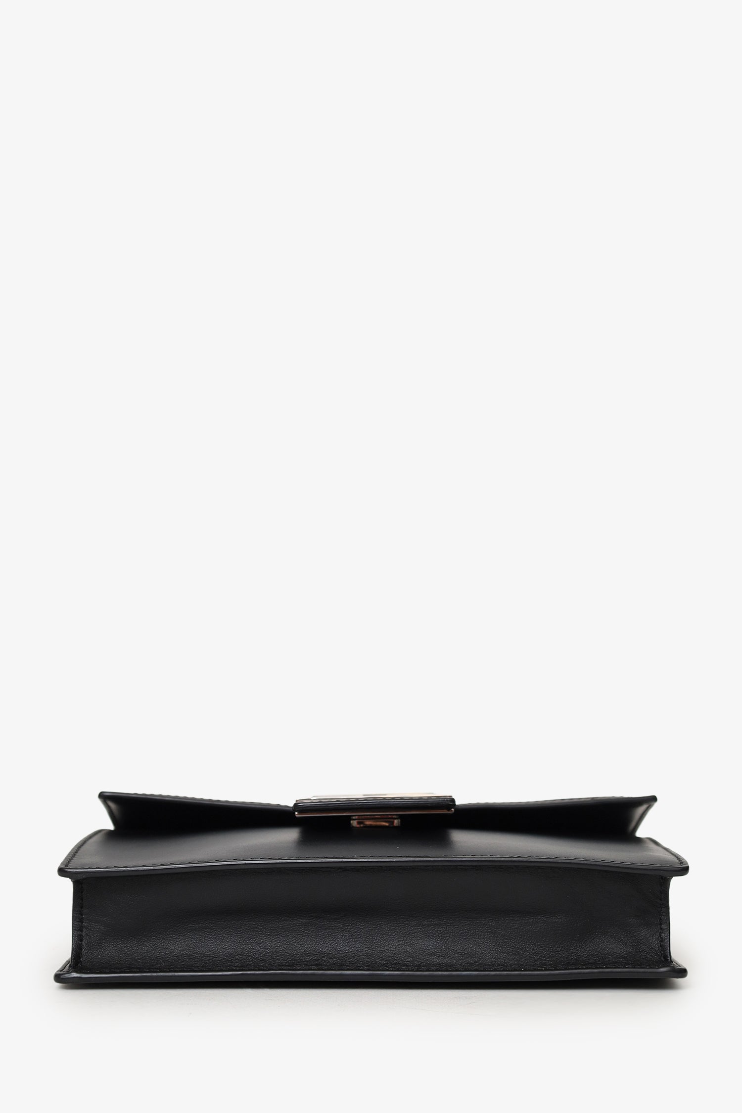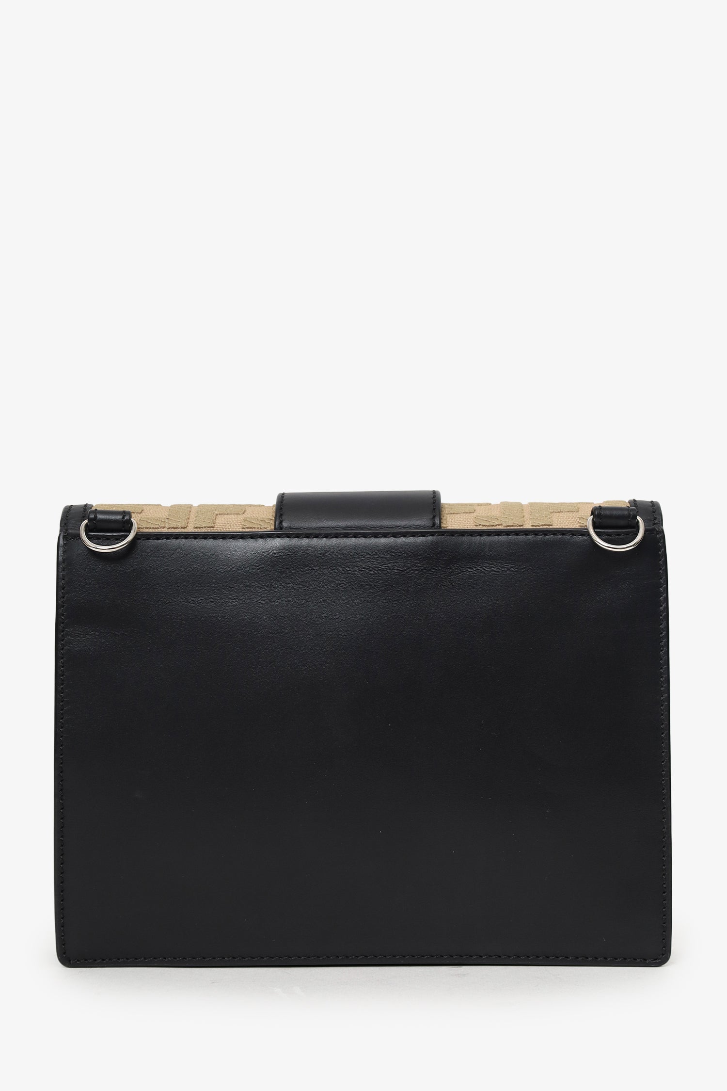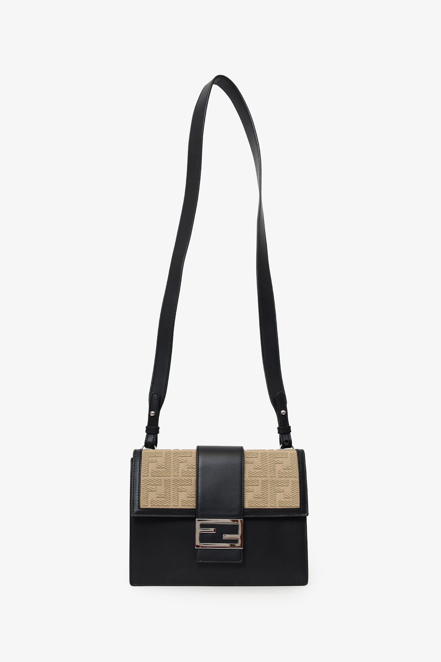 Fendi Black/Beige Calfskin/Canvas FF 1974 Flat Baguette Crossbody. Front fold-over flap with magnetic closure. Removable leather strap with adjustable push-pin closure. Lined interior. Single interior zip pocket. Silver-tone hardware. Tonal stitching.