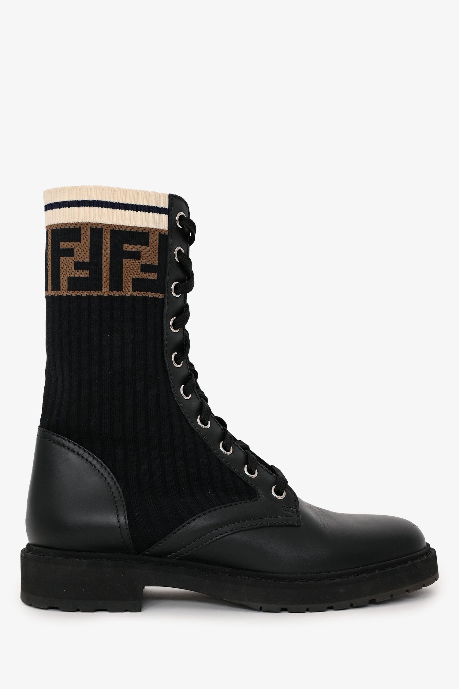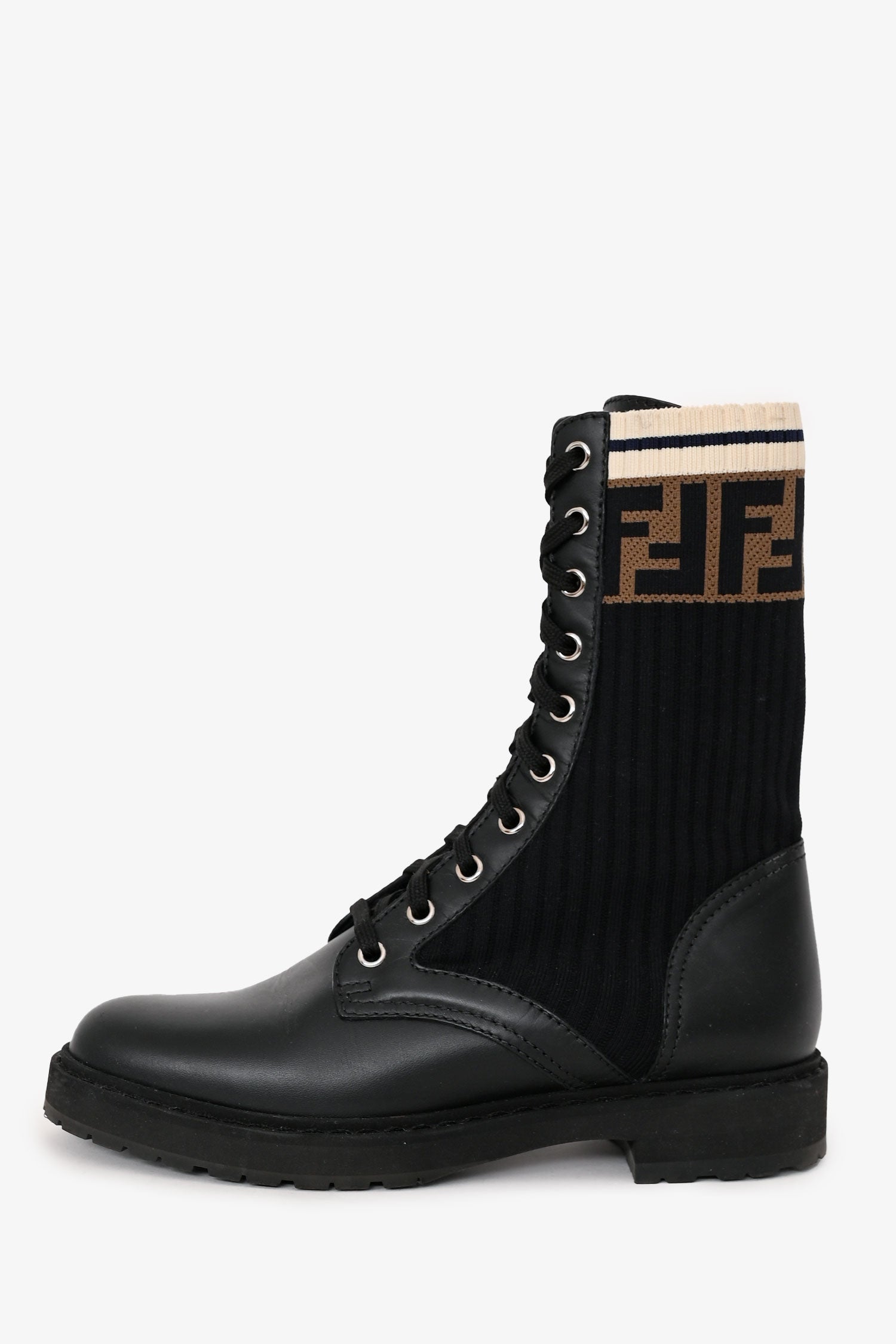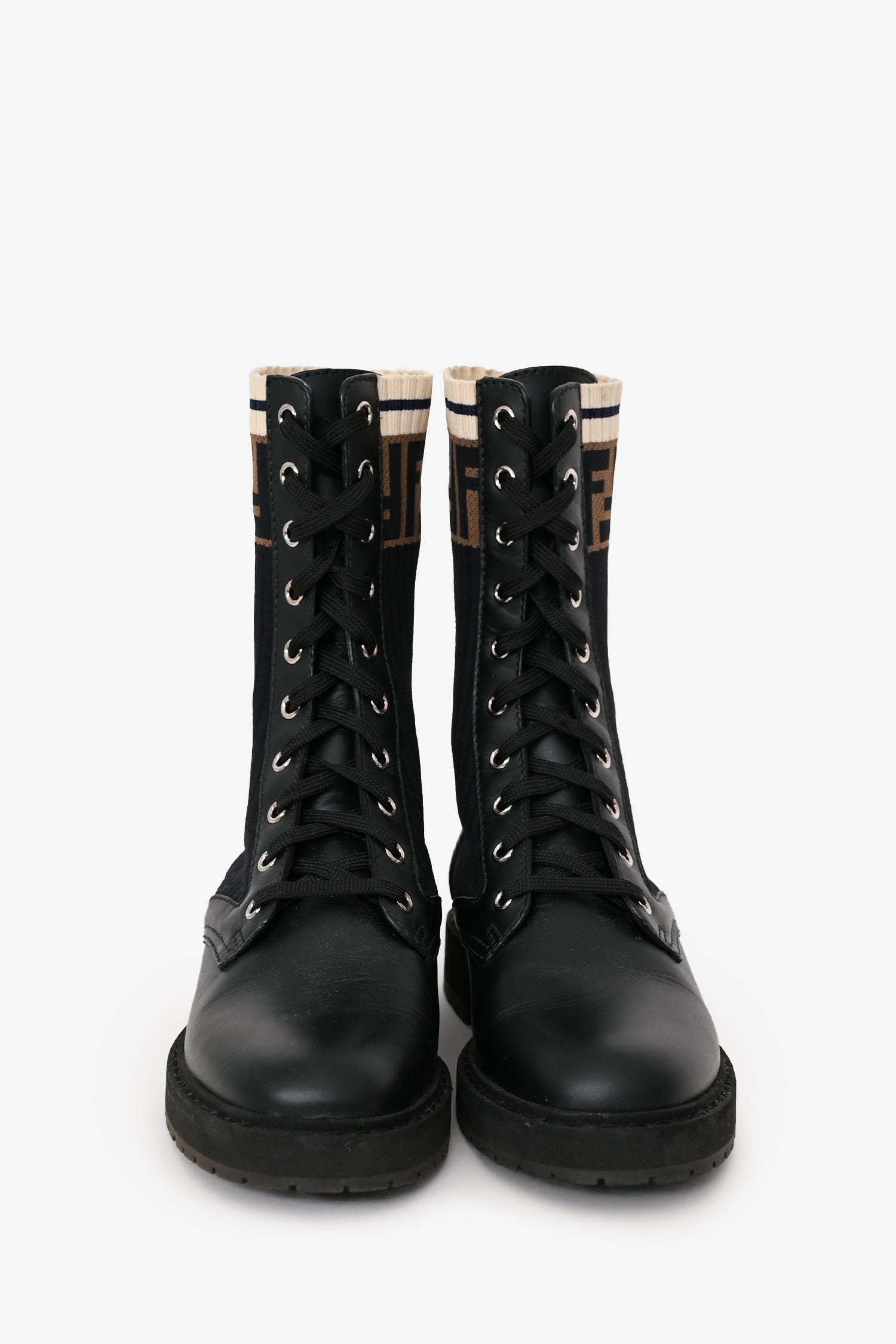 Fendi Black Leather Zucca Stretch Knit Combat Boots Size 37
