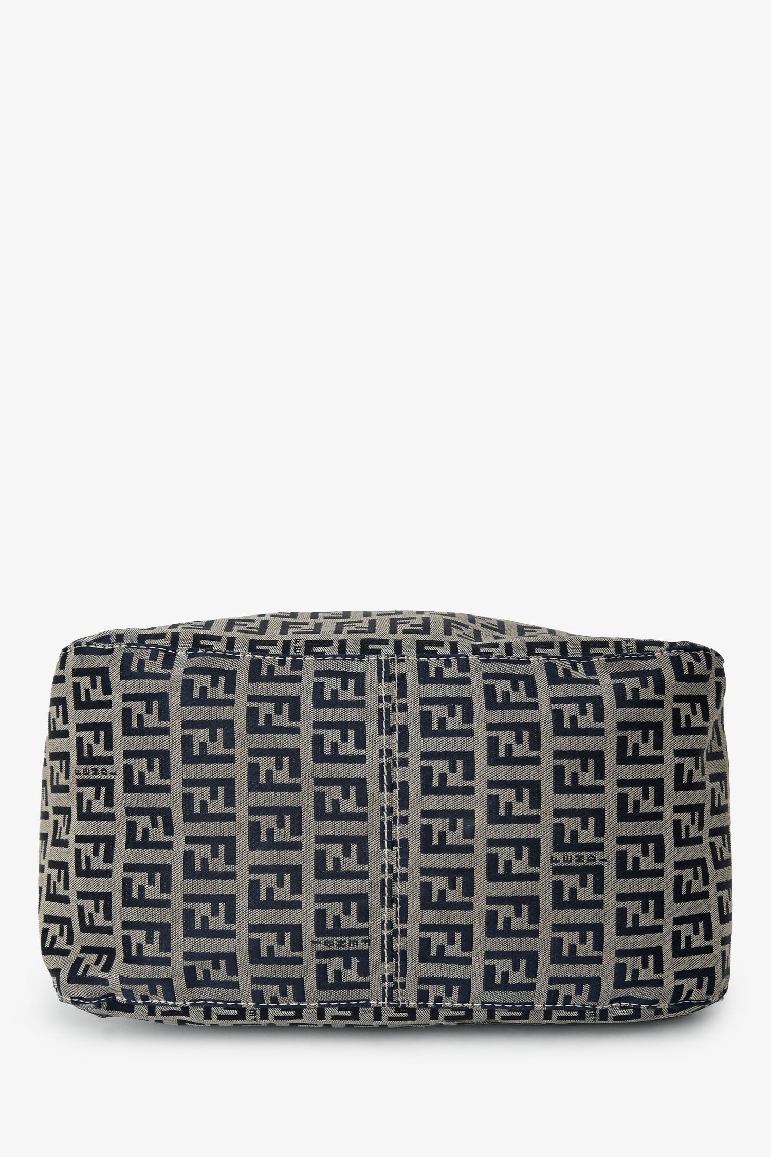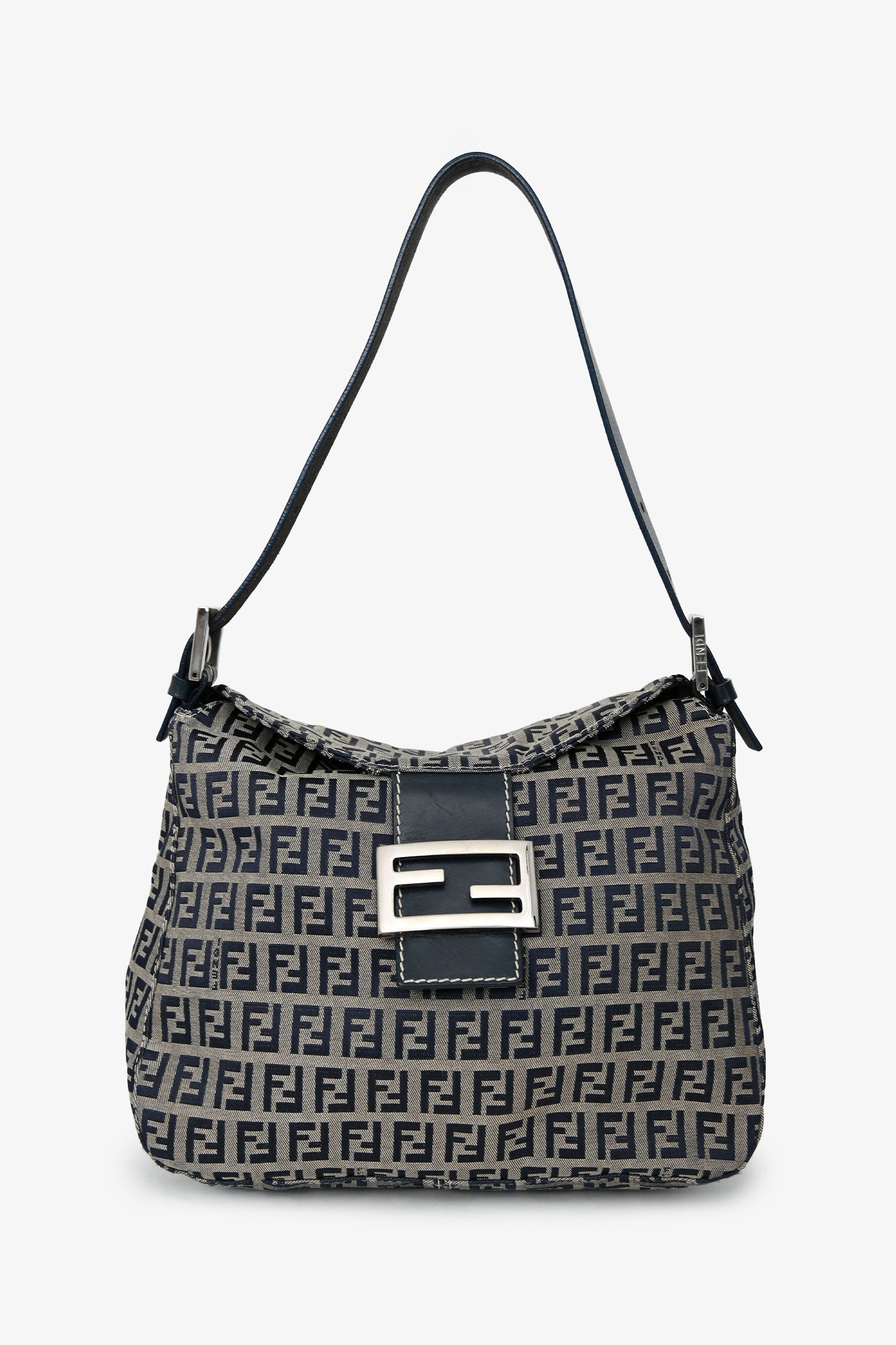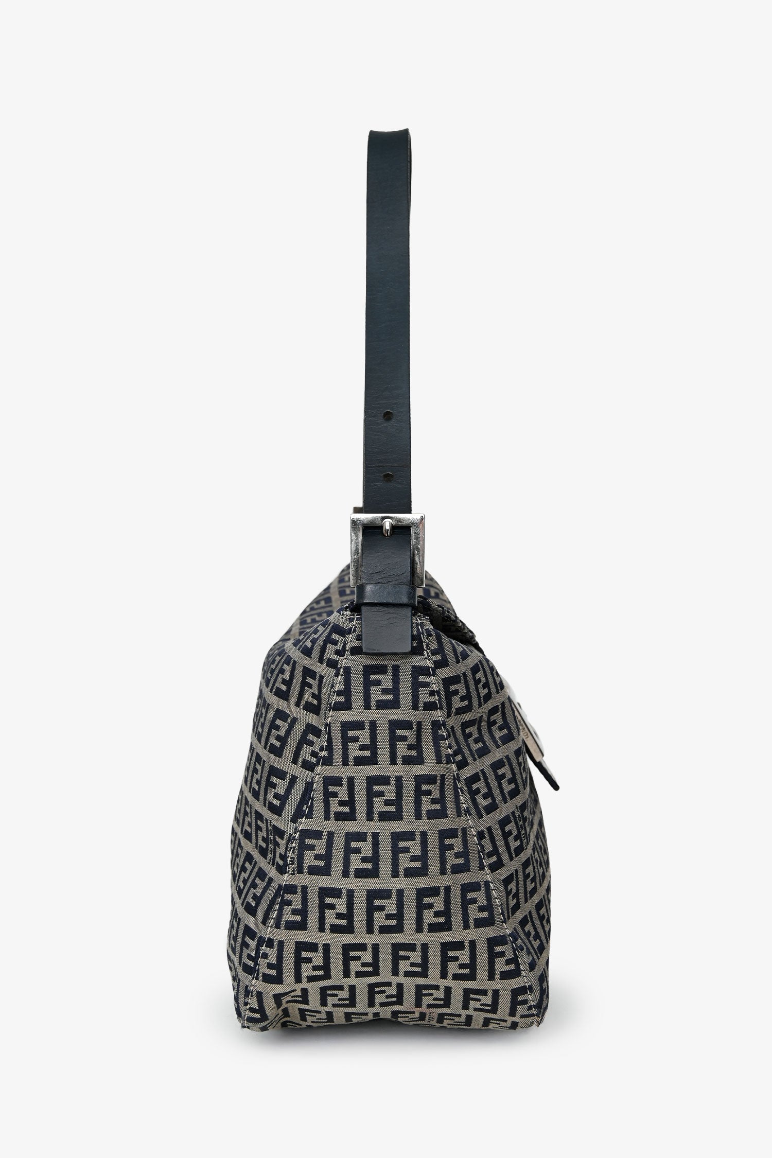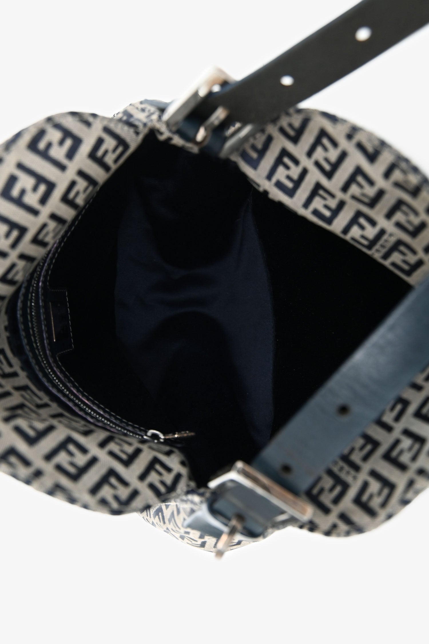 Fendi Blue/Grey FF Zucca Square Baguette Shoulder Bag. Dual fold-over flaps. Single adjustable shoulder strap. Lined interior with 1 zip. Silver-tone hardware. Contrast stitching.