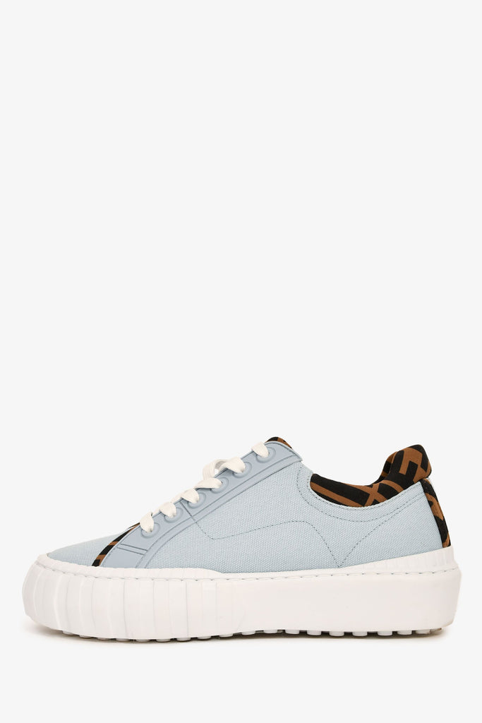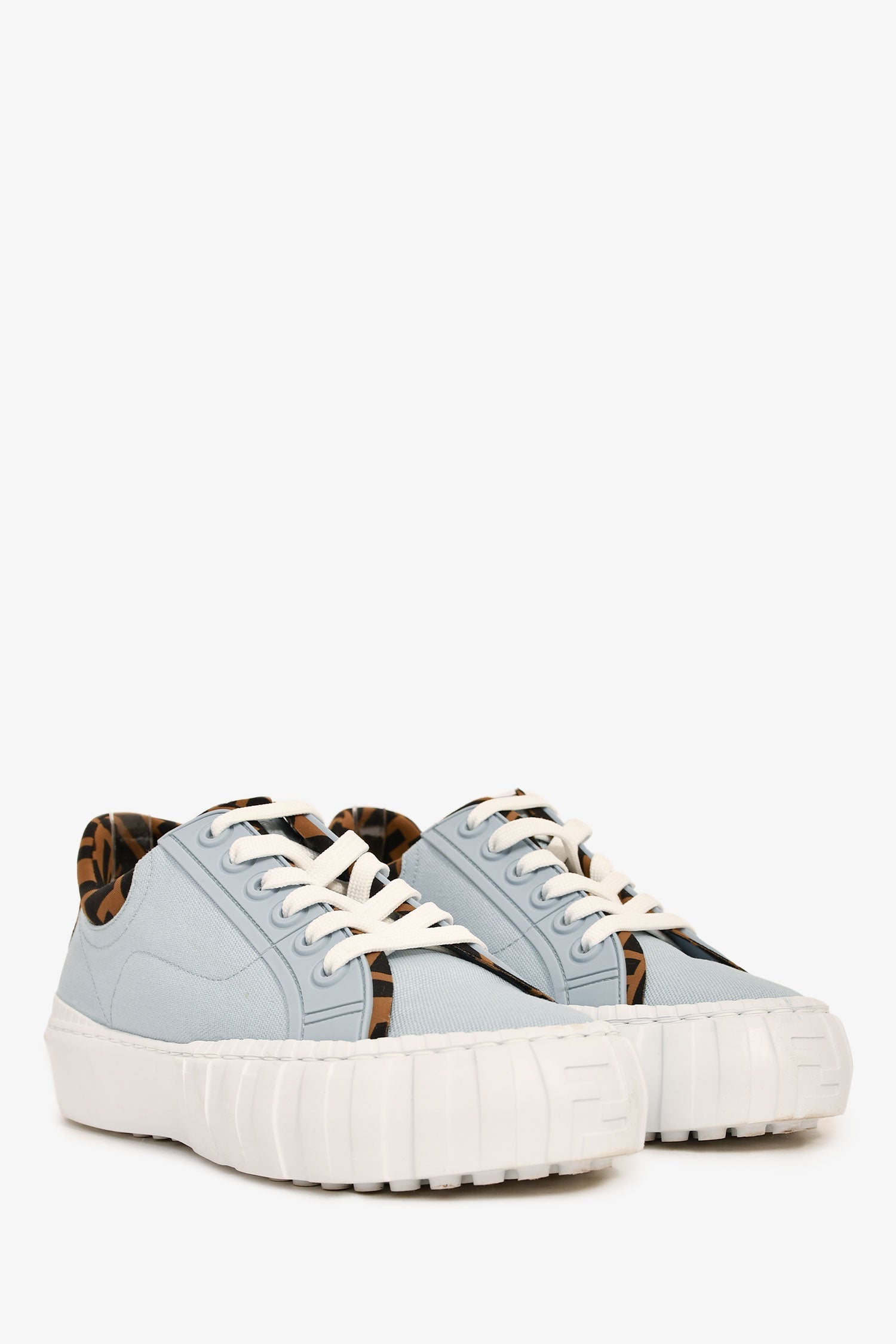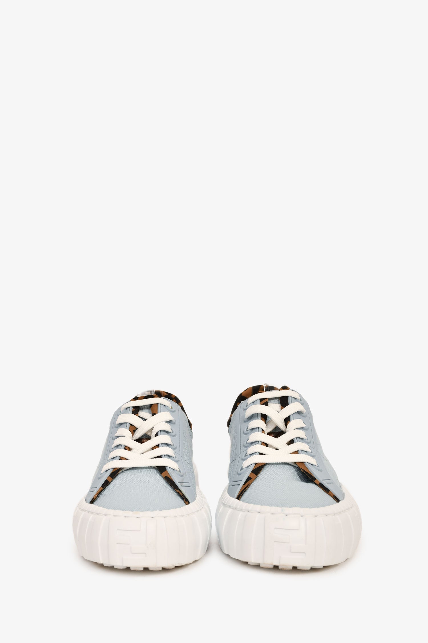 Fendi Blue Zucca FF Logo Canvas Sneakers, Round toe. Lace-up closure.