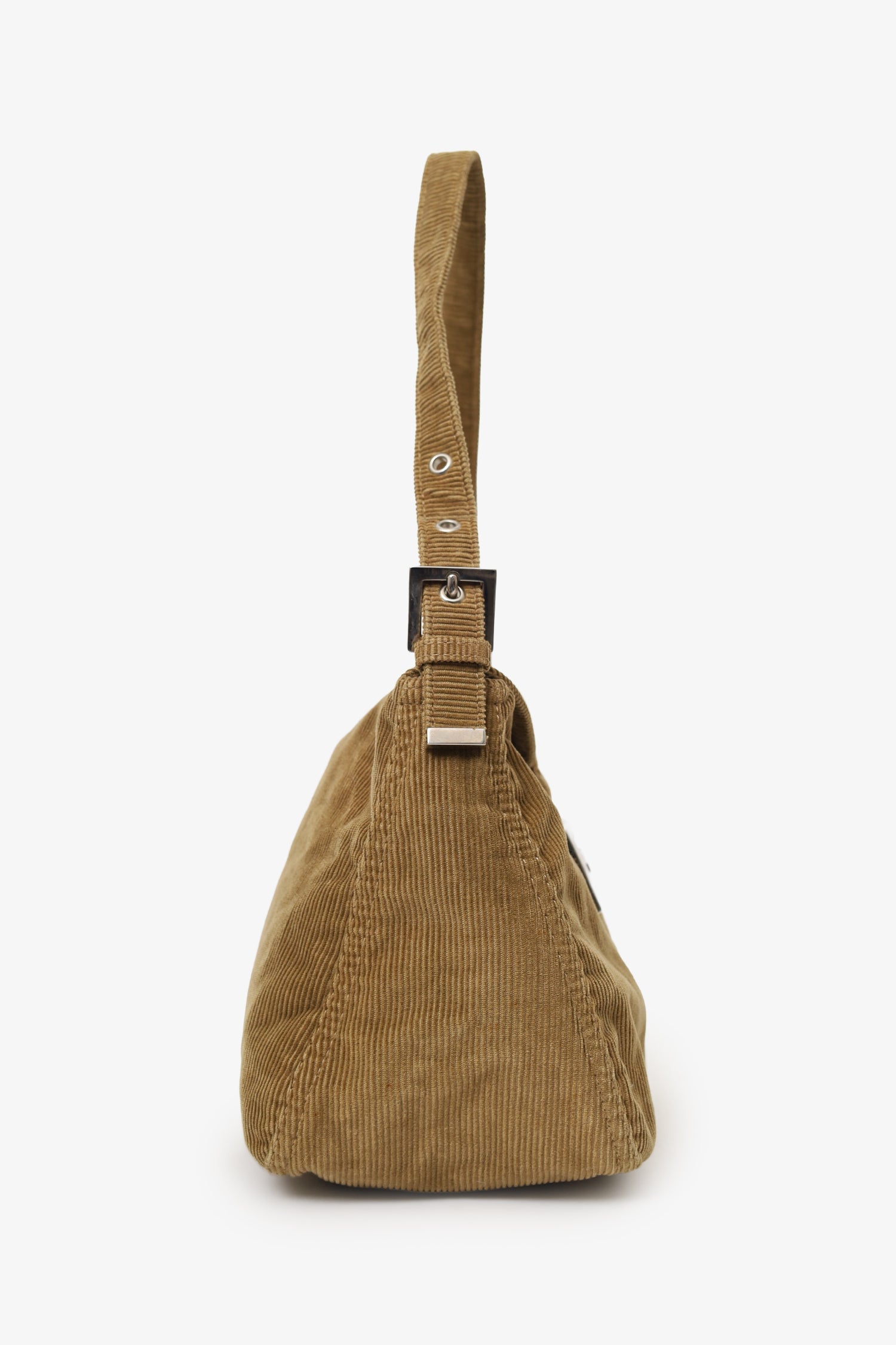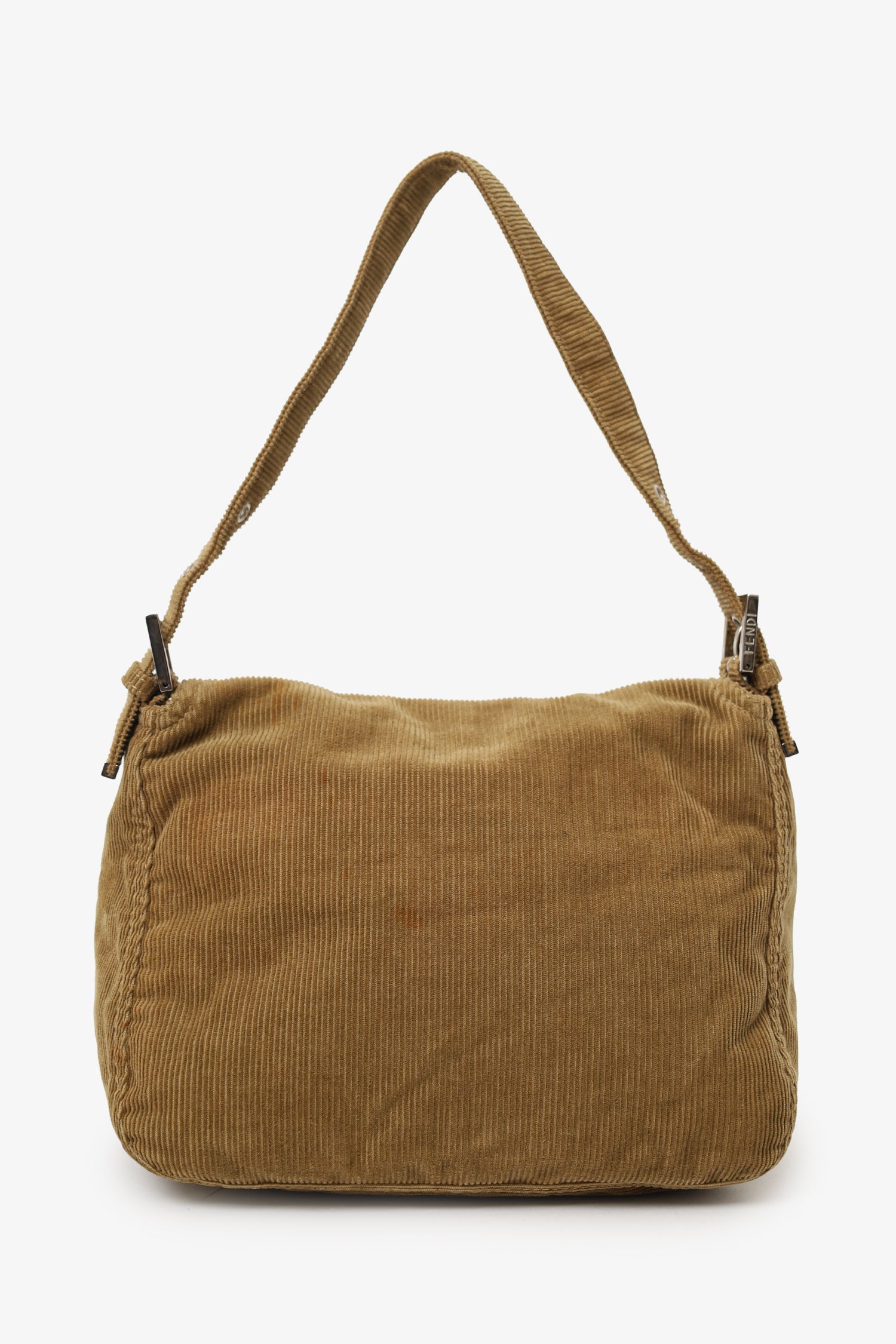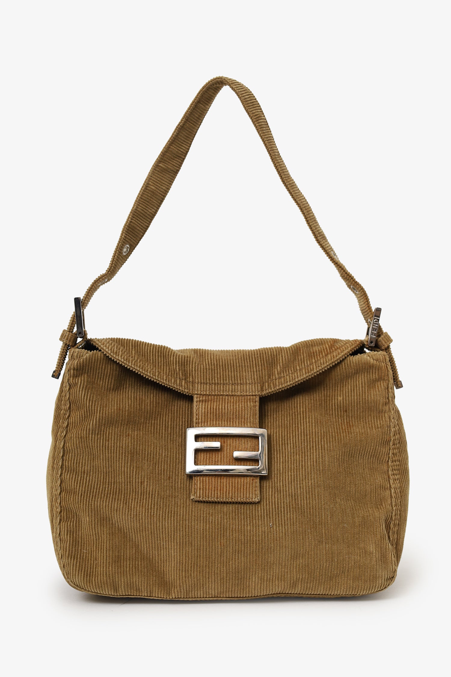 Fendi Brown Corduroy Double Flap Baguette Shoulder Bag. Front-fold-over-flap. Adjustable shoulder strap with pull-through buckle closure. Lined interior with single rear zip-up pocket. Silver-tone hardware. Tonal stitching.