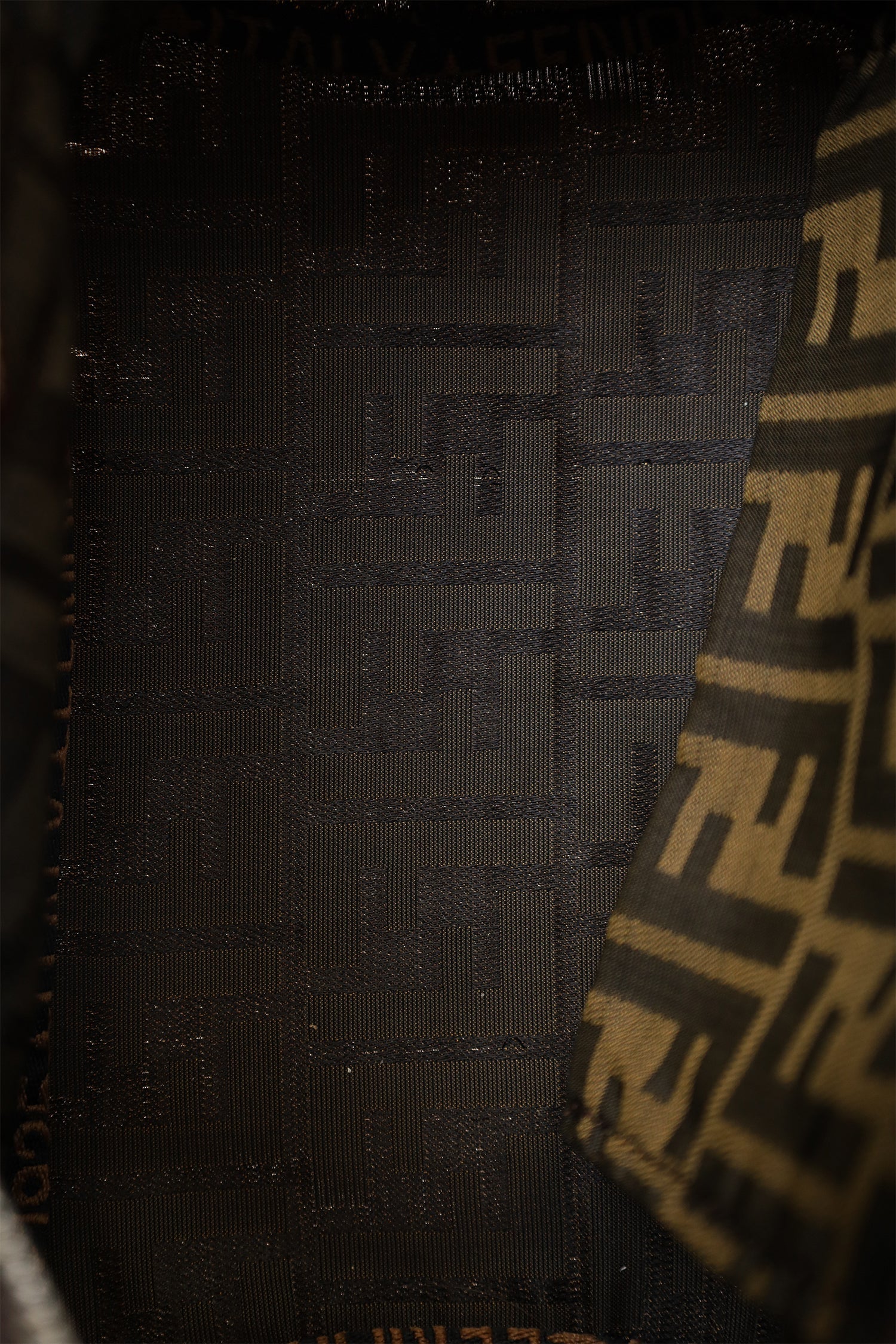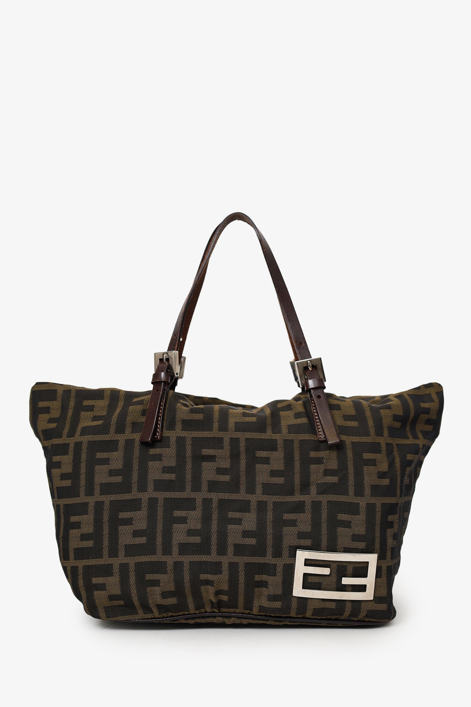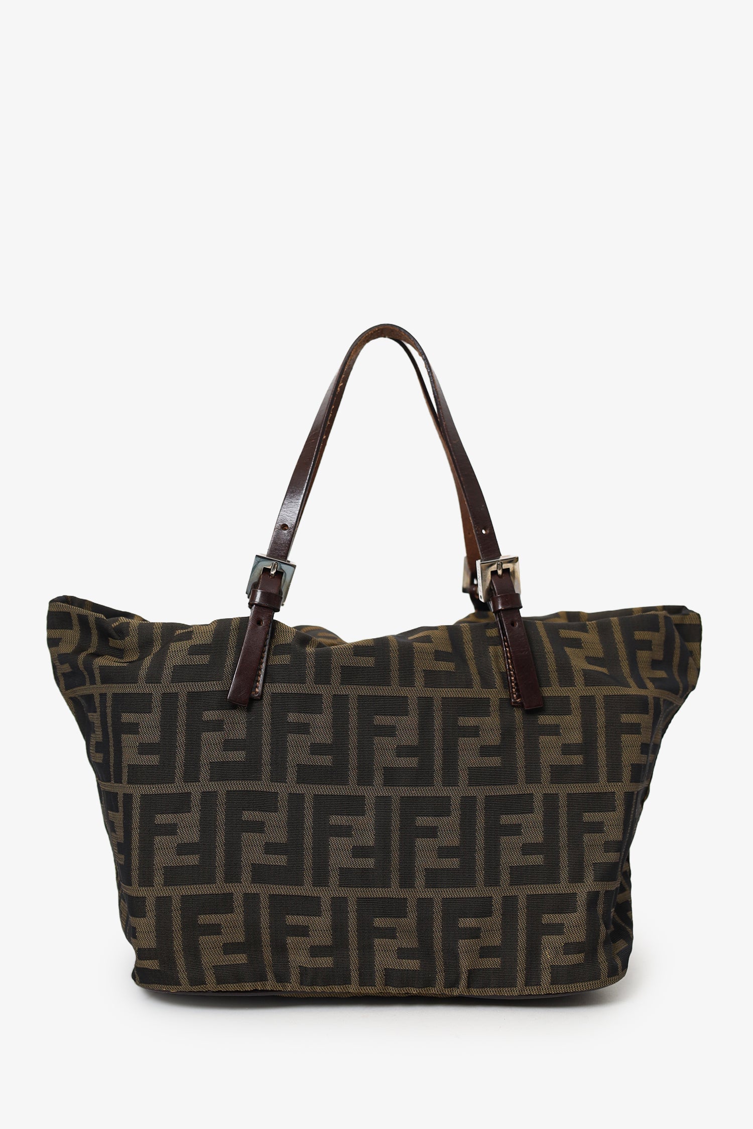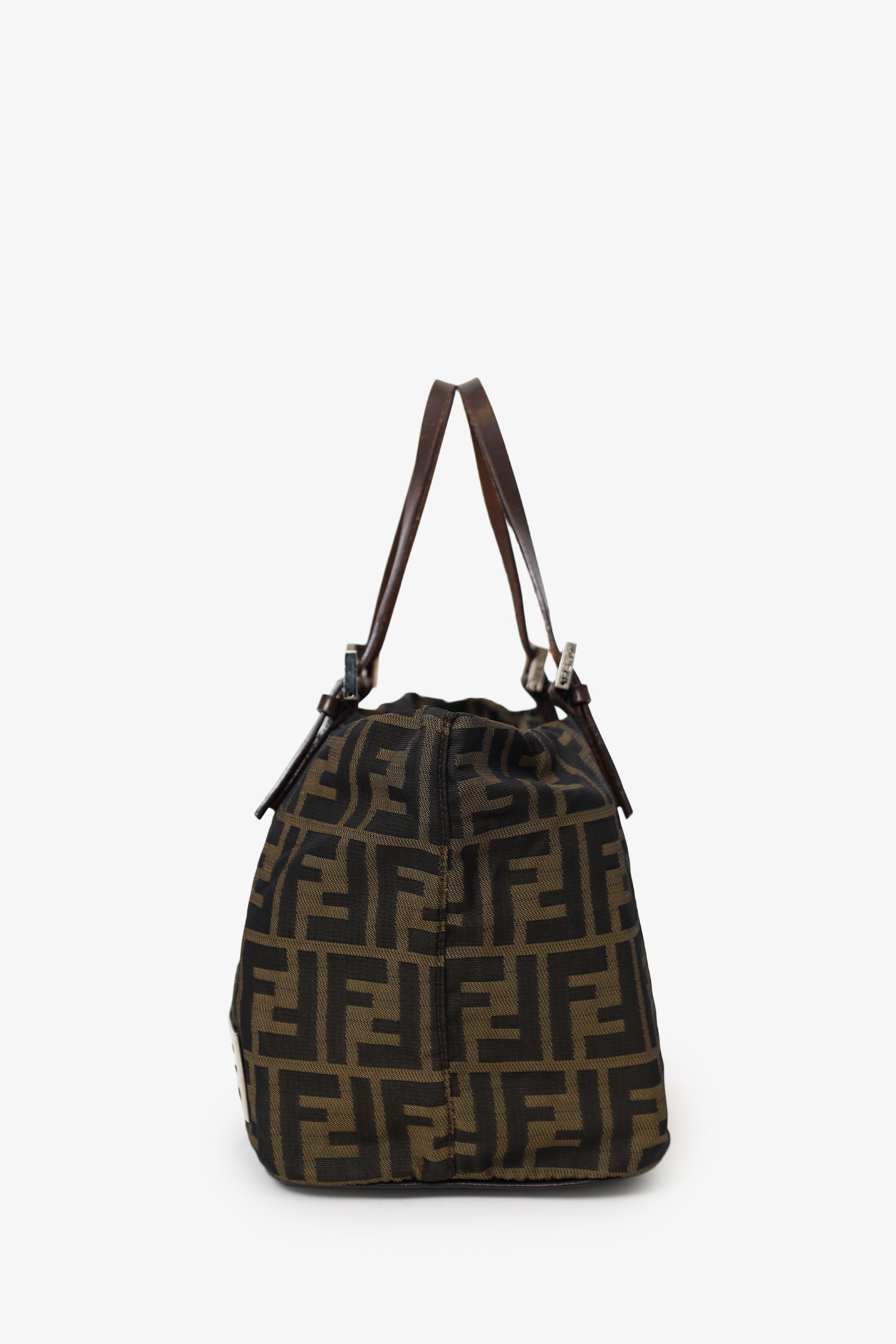 Fendi Brown FF Zucca Canvas Mini Tote. Top zip-up closure. Adjustable twin top handles with pull-through buckle closure. Single interior zip-up pocket. Silver-tone hardware. Tonal stitching.