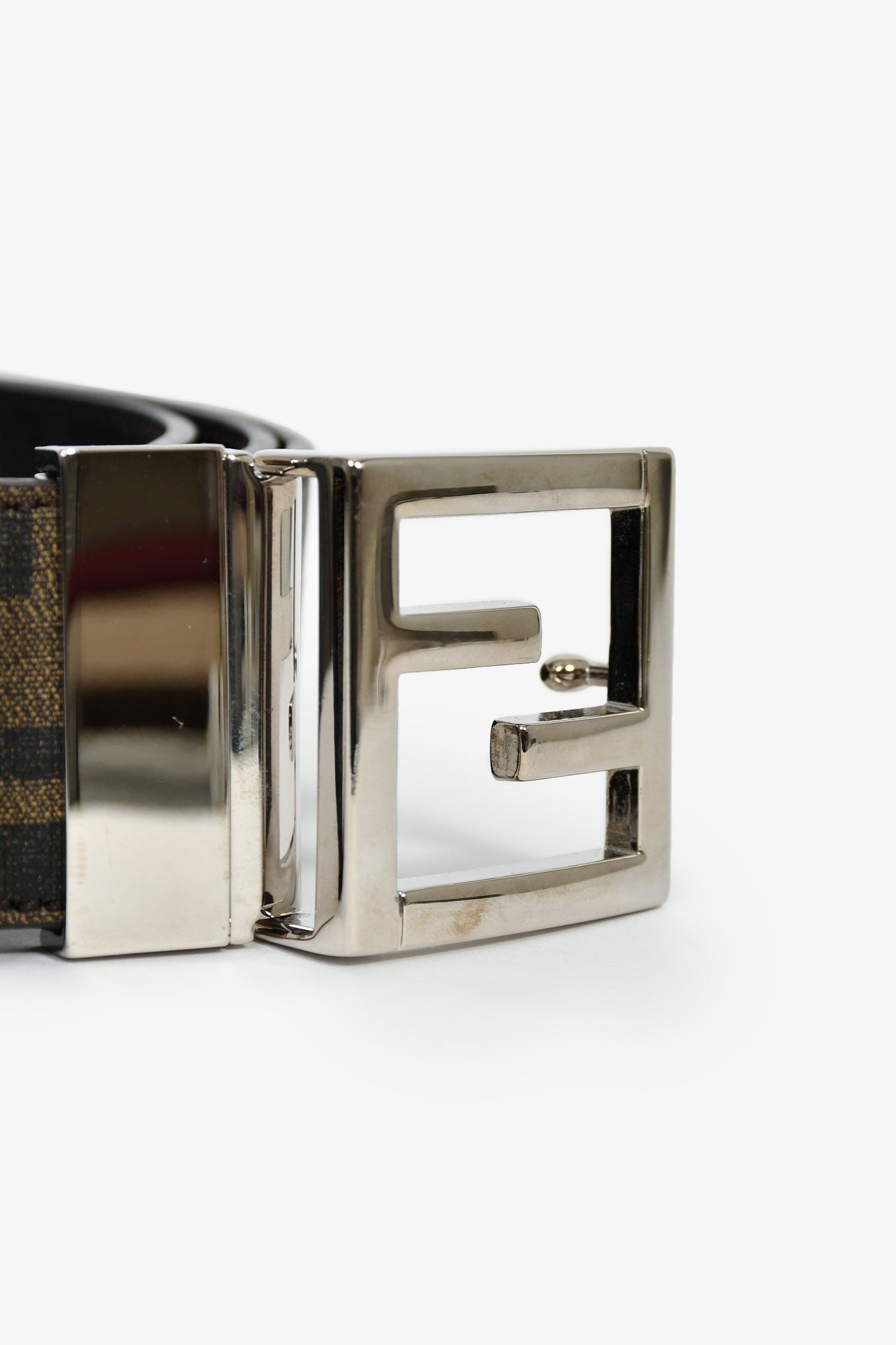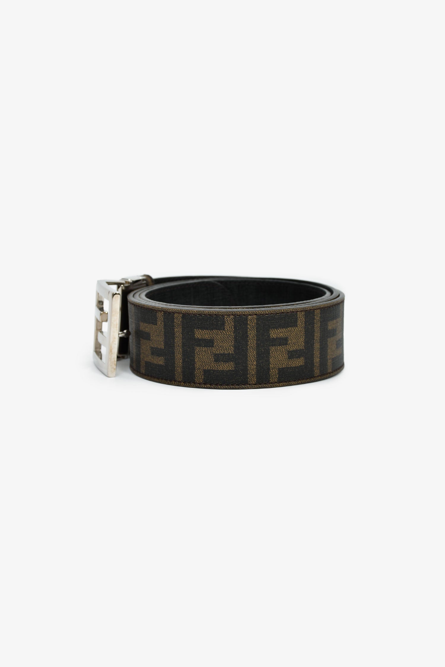 Fendi Brown Zucca Canvas 'FF' Buckle Belt. Adjustable push-tab buckle closure. Silver-tone hardware. Tonal stitching.