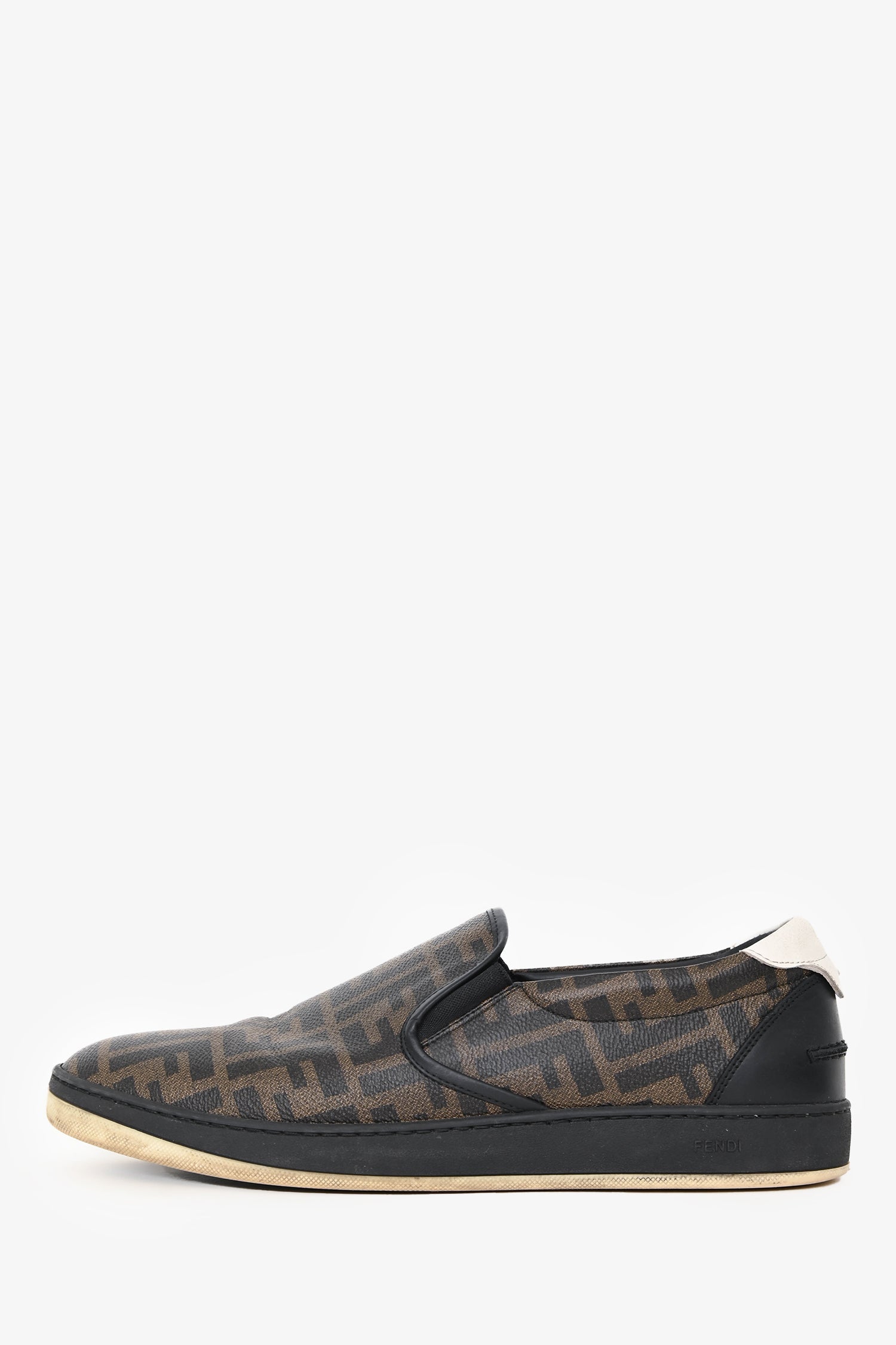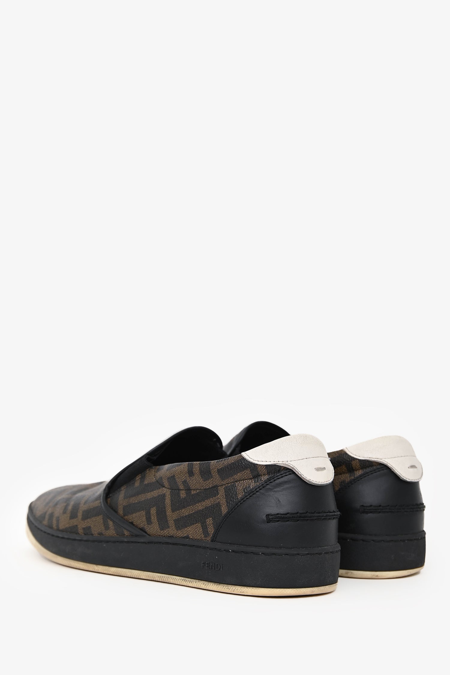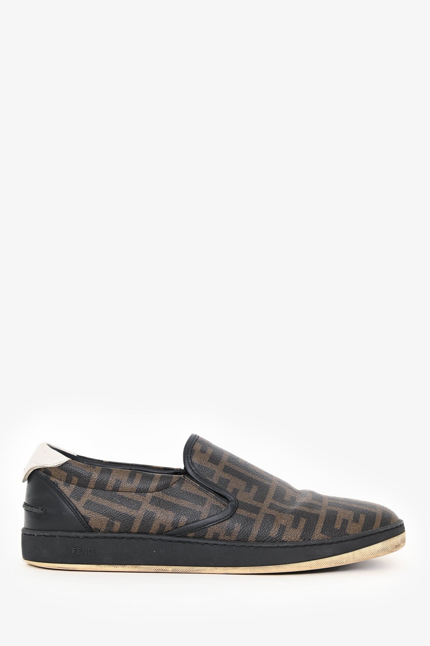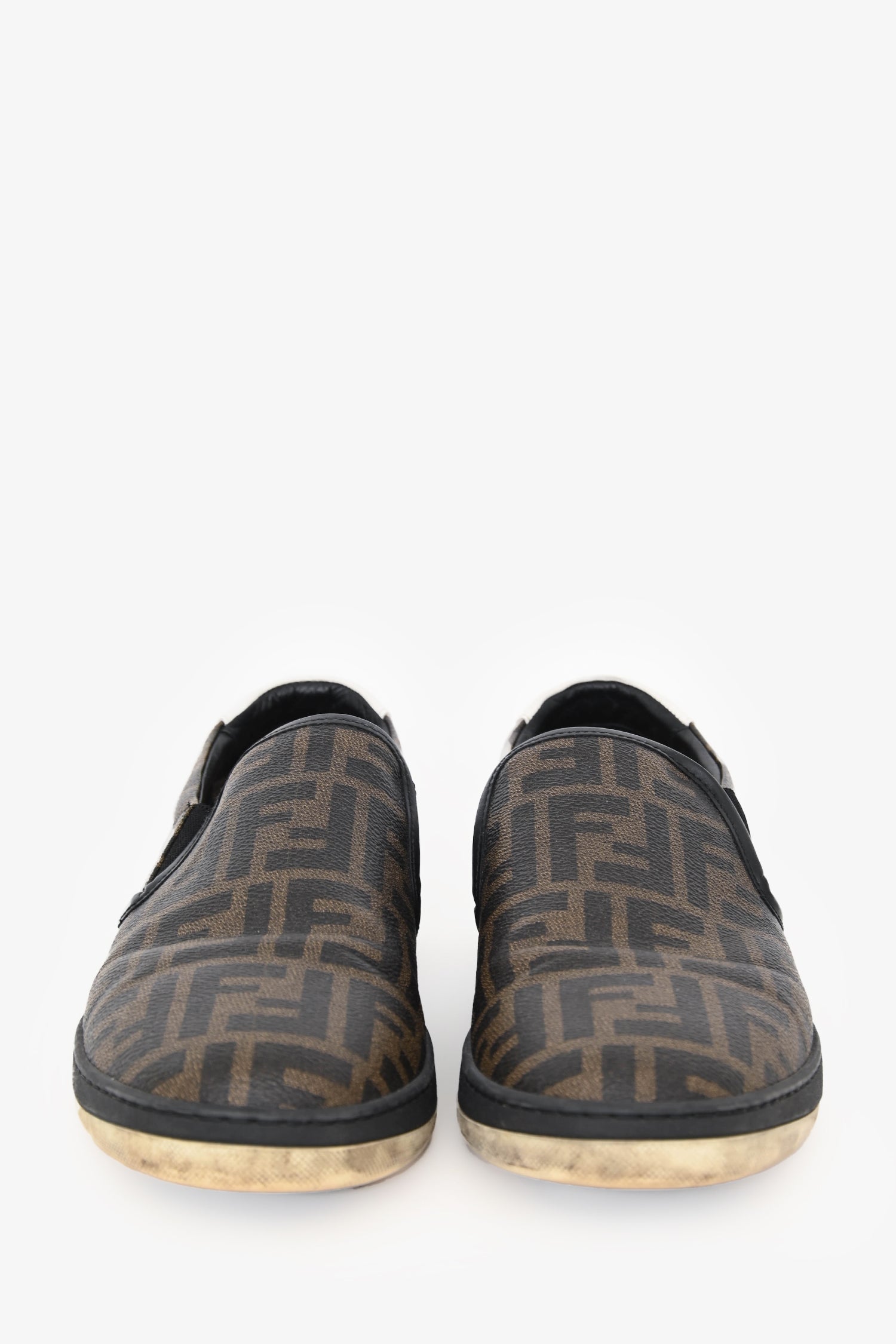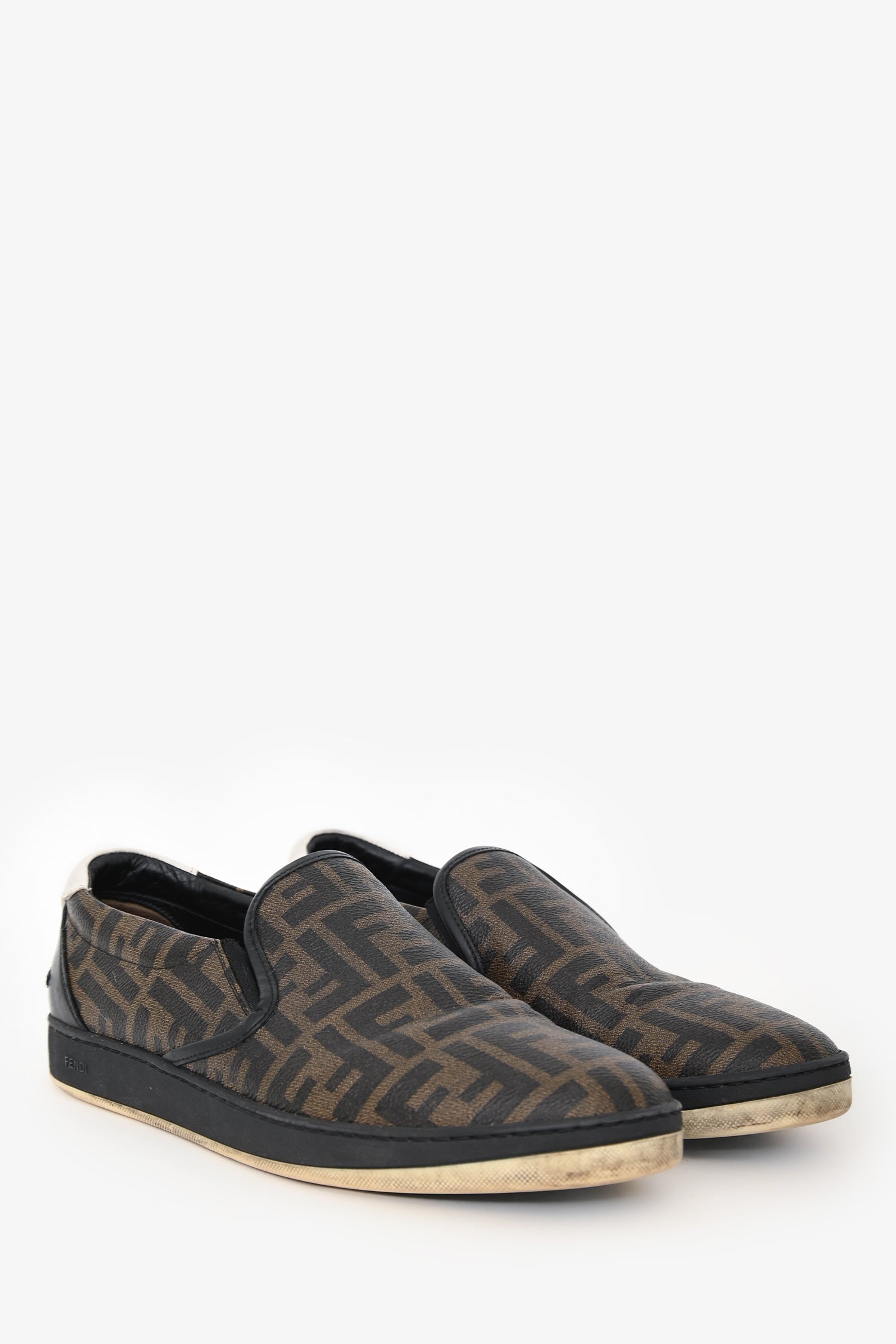 Fendi Brown Zucca Leather Sneakers. Slip-on. Round toe. Tonal stitching.