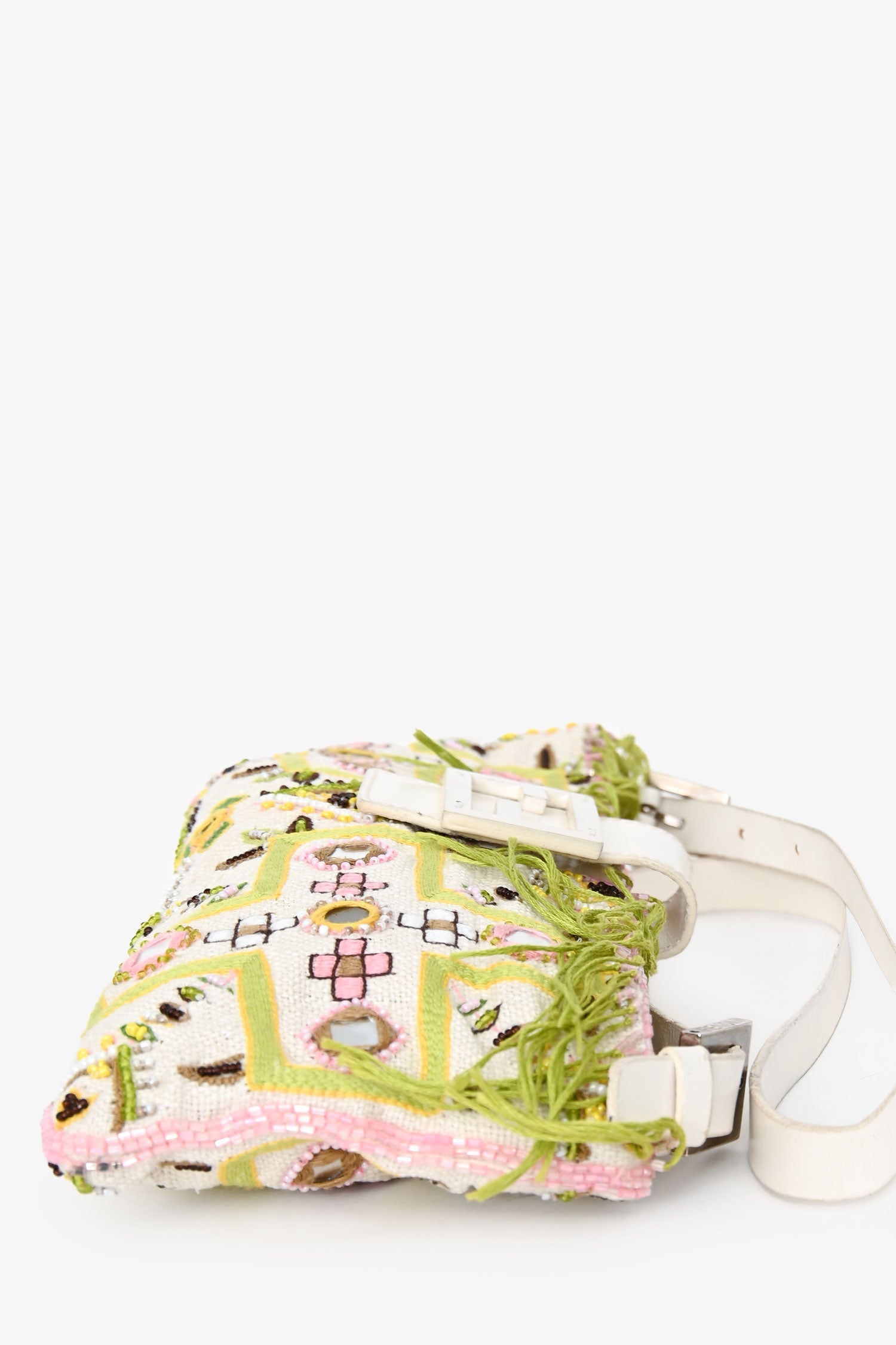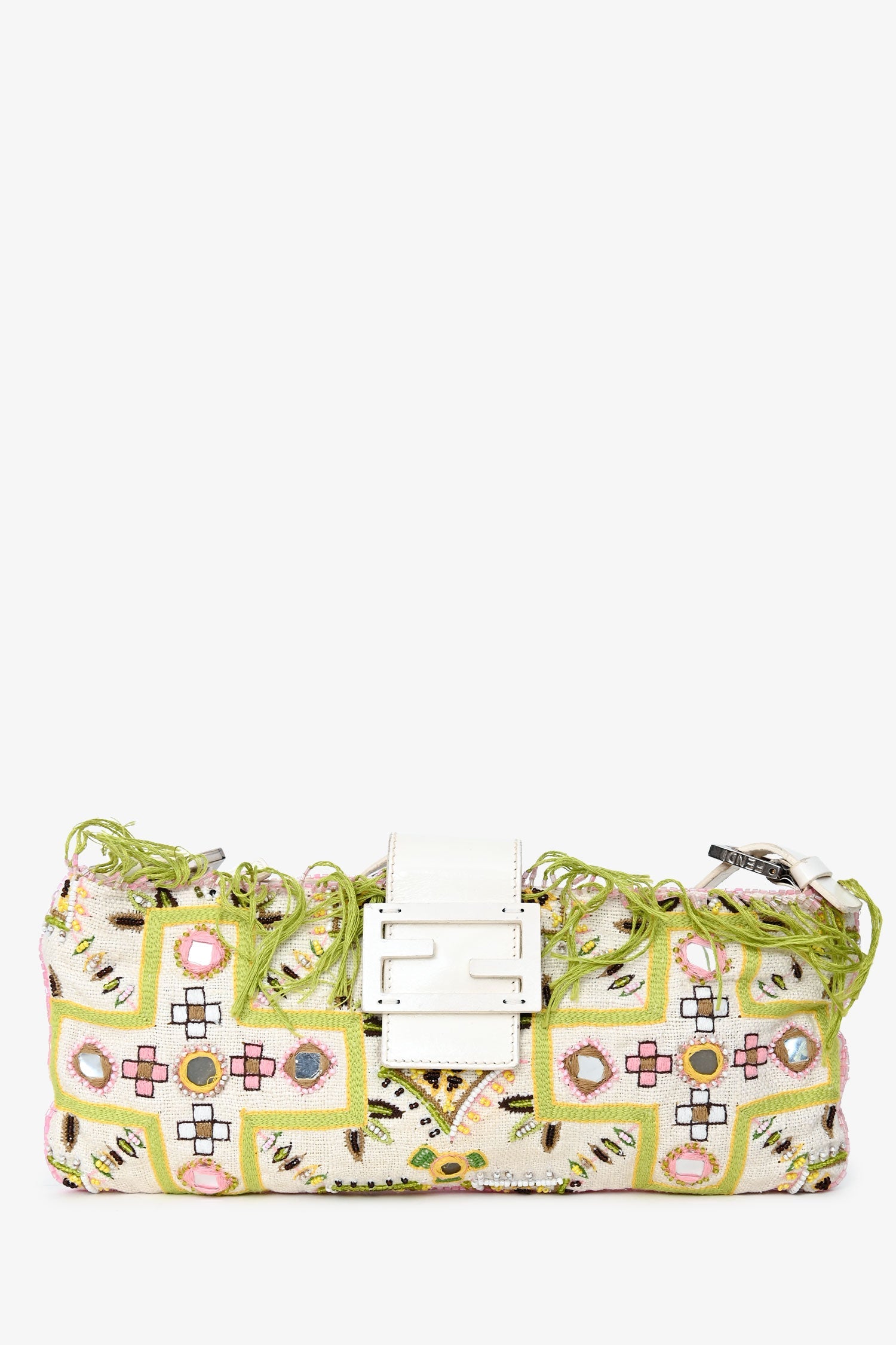 Fendi Limited Edition White/Green Fringe Beaded Embroidery Baguette Pochette