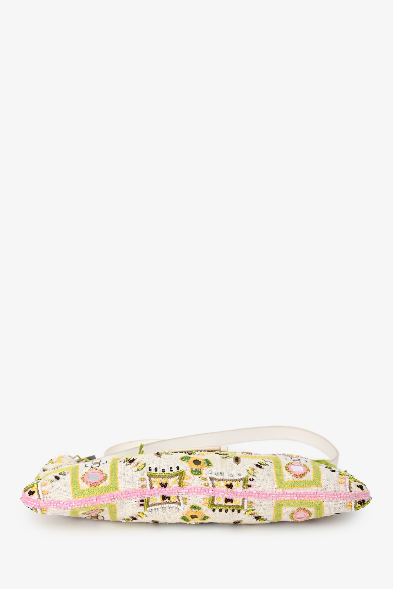 Fendi Limited Edition White/Green Fringe Beaded Embroidery Baguette Pochette. Fold-over flap with a snap closure. Adjustable shoulder strap. Lined interior with a zip compartment. Silver-tone hardware. Tonal stitching.
