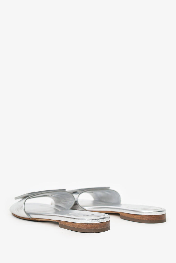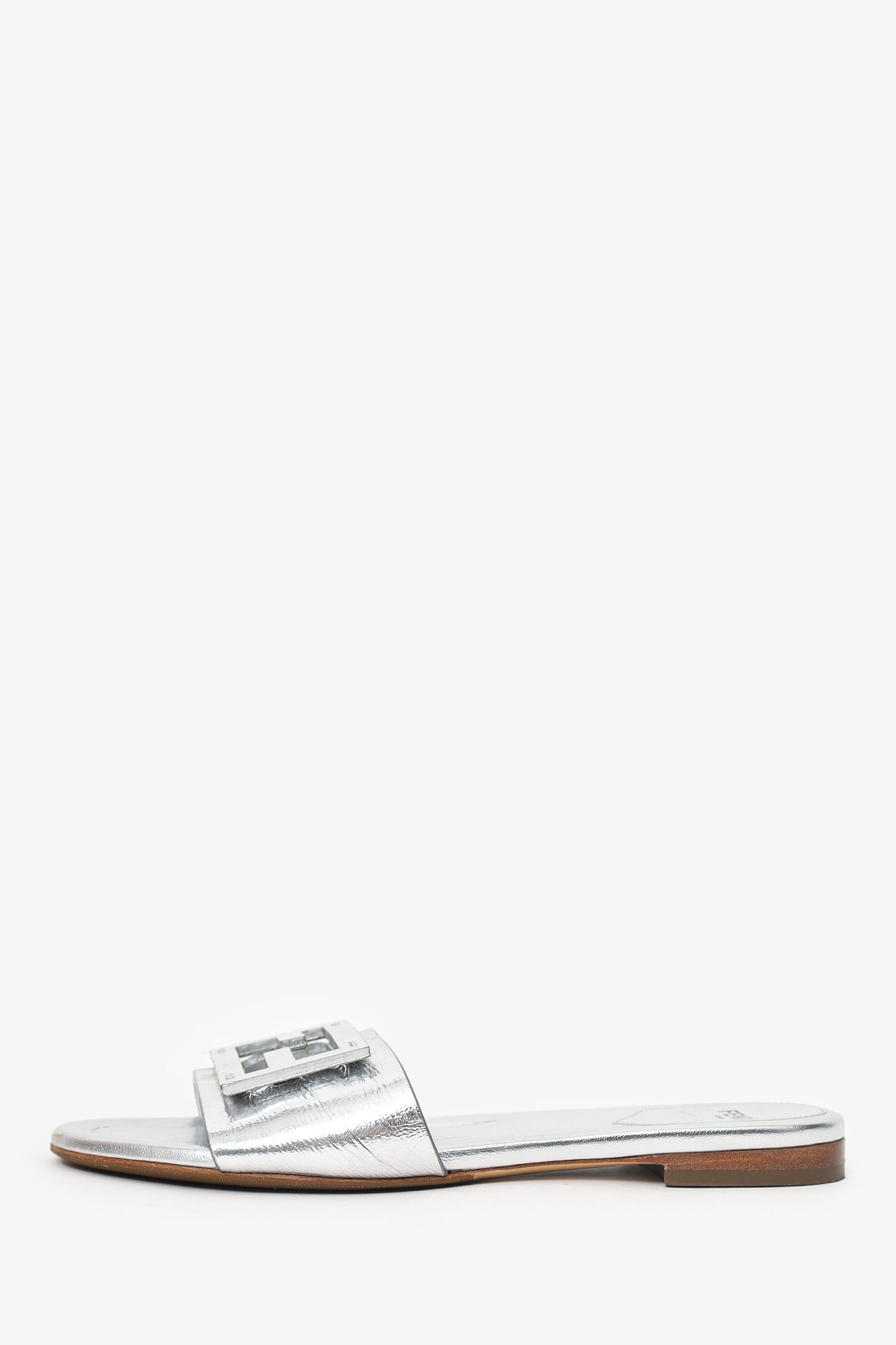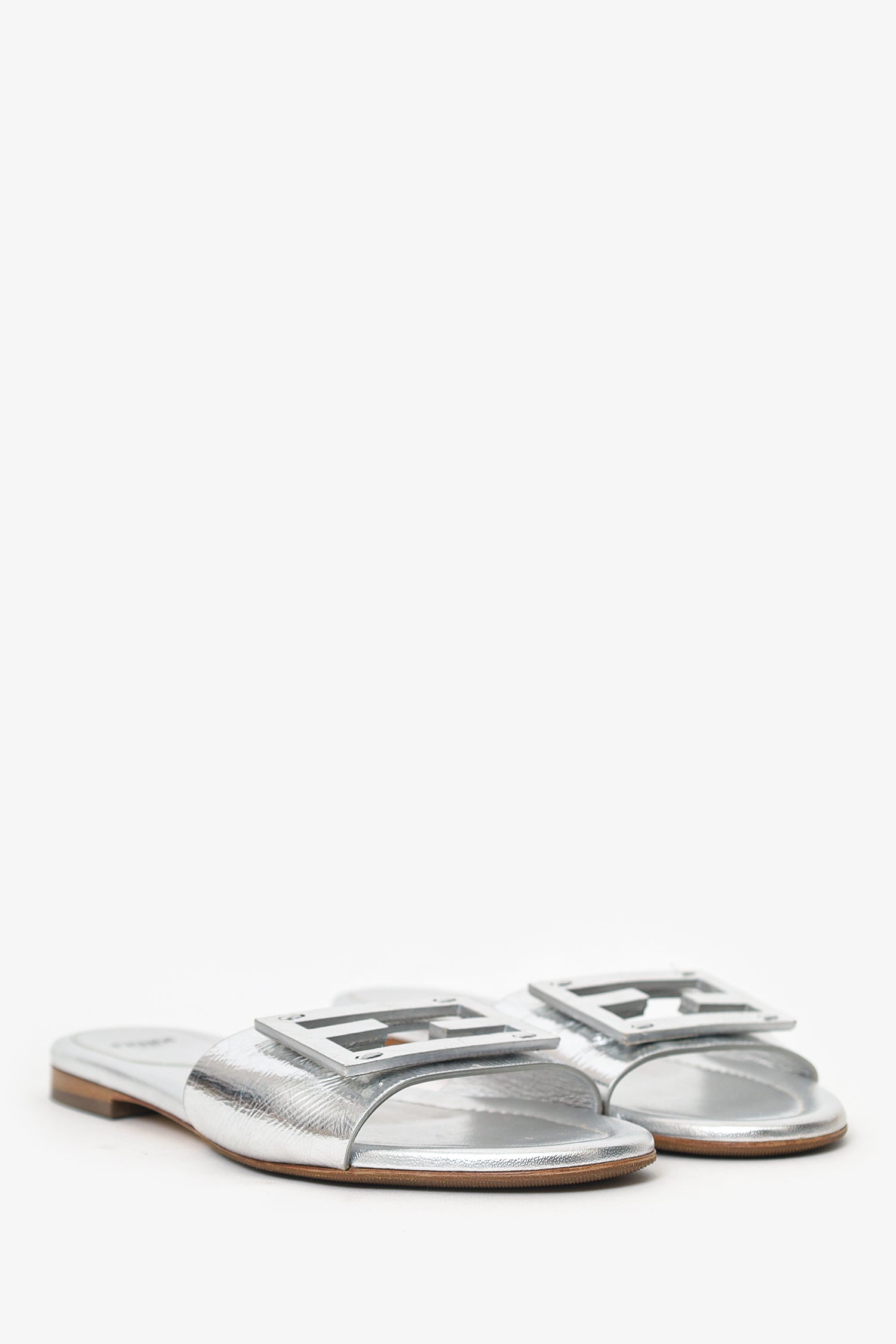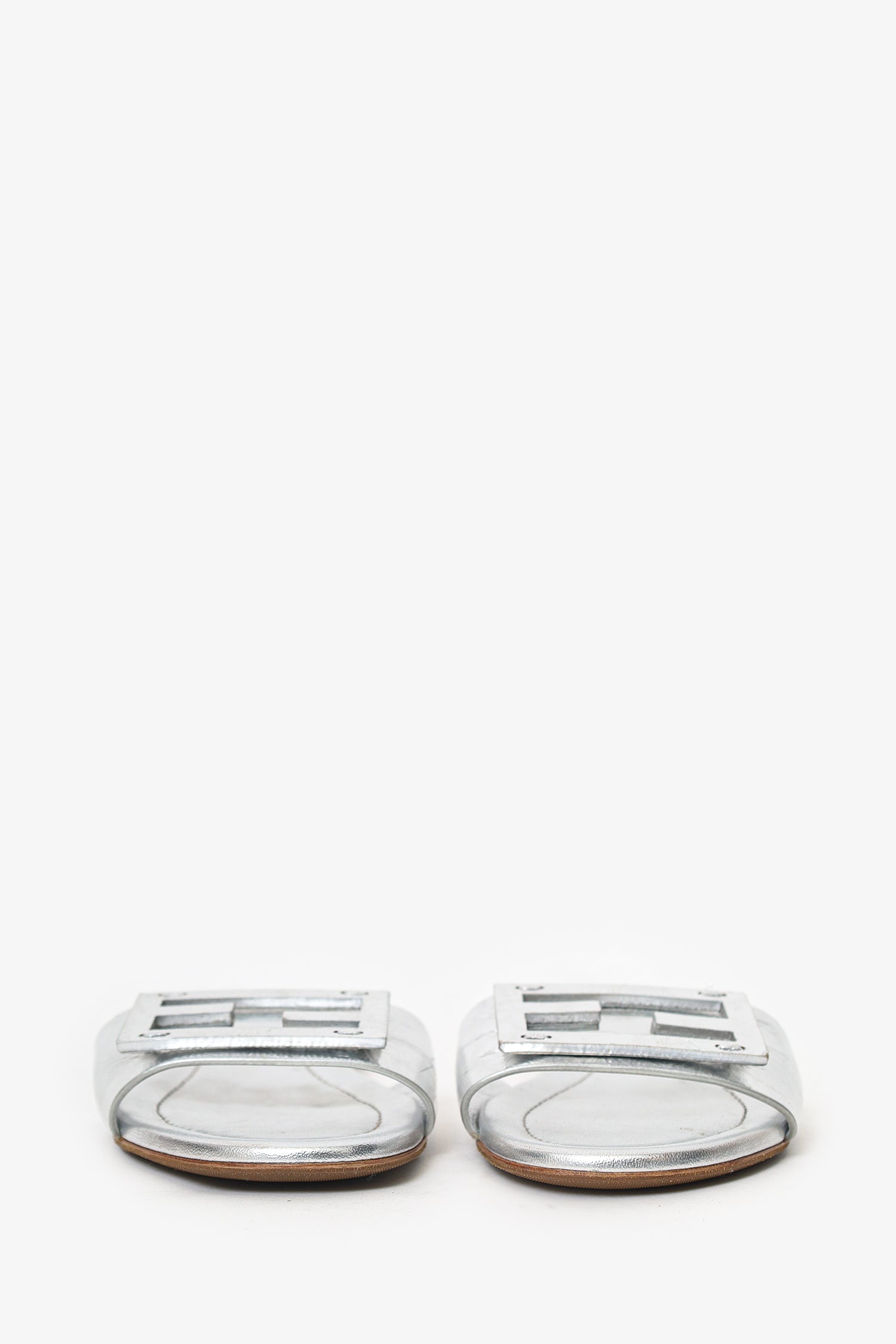 Fendi Silver Metallic Leather Baguette Slide Sandal. Slip-on. Round toe. Lined interior. Silver-tone hardware. Tonal stitching.