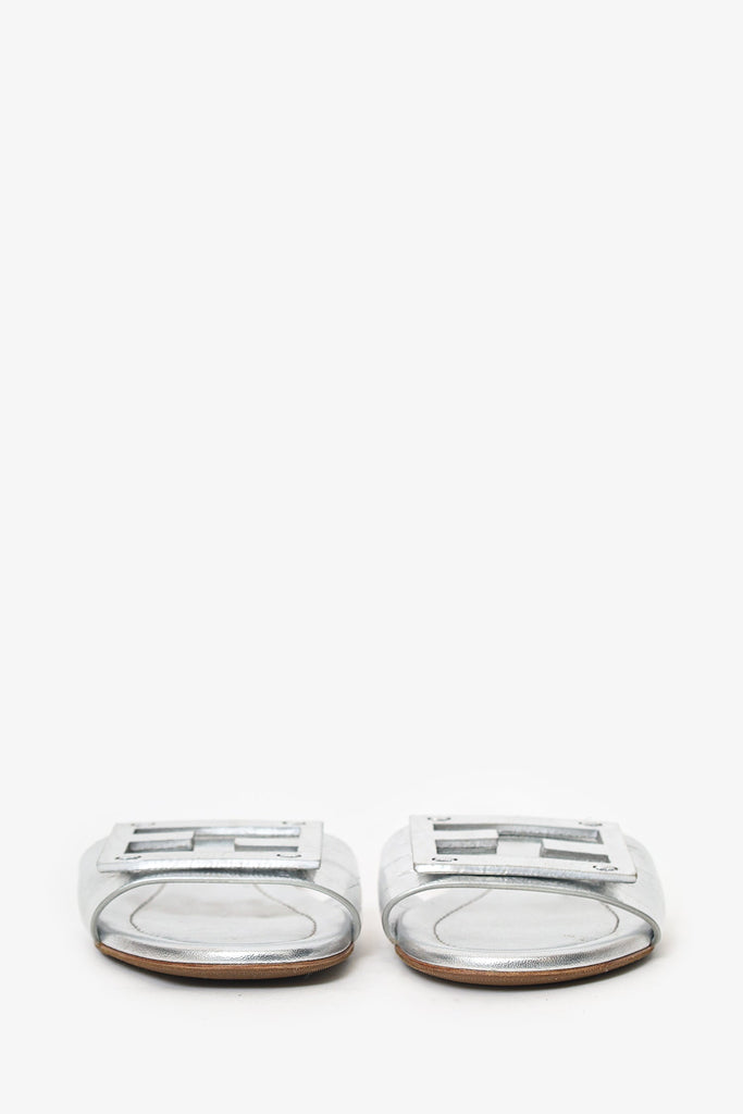 Fendi Silver Metallic Leather Baguette Slide Sandal Size 37