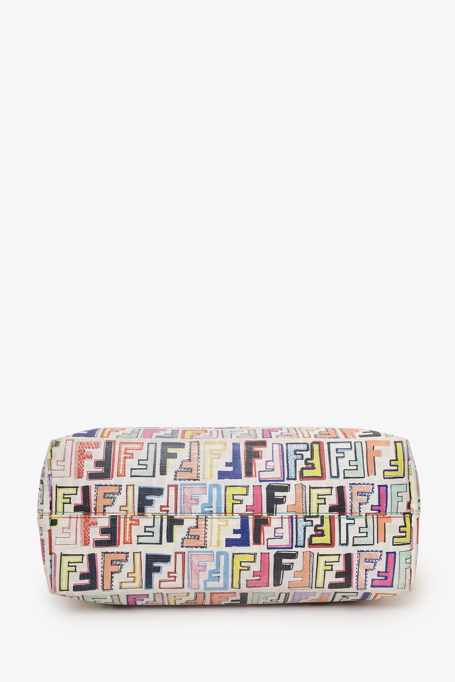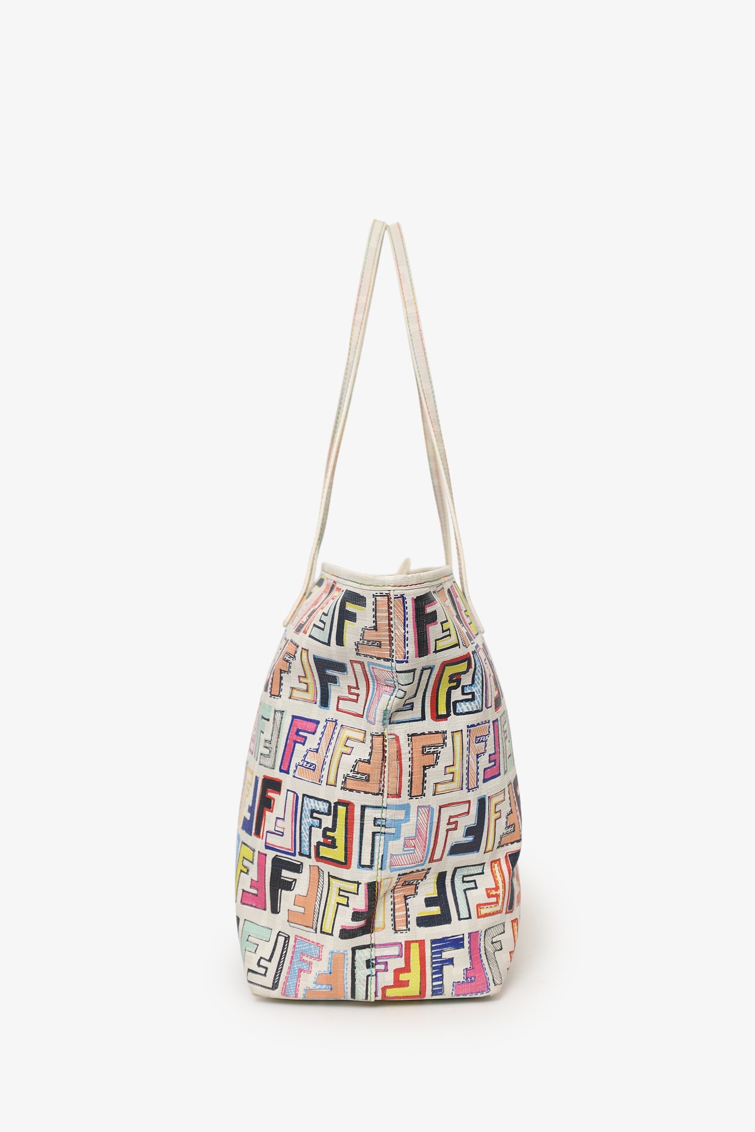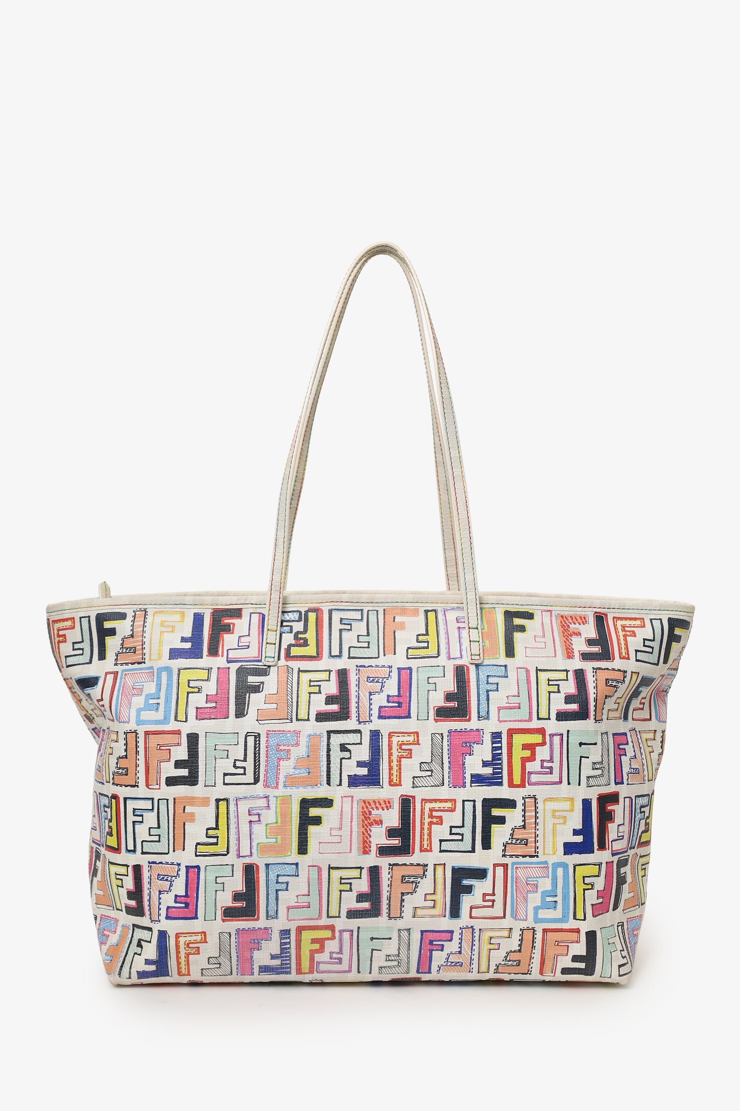 Fendi White/Multicolour Zucca Spalmati Roll Tote. Top zip closure. Twin shoulder straps. Lined interior. 3 interior pockets; 2 slip and 1 zip. Gold-tone hardware. Tonal and contrast stitching.