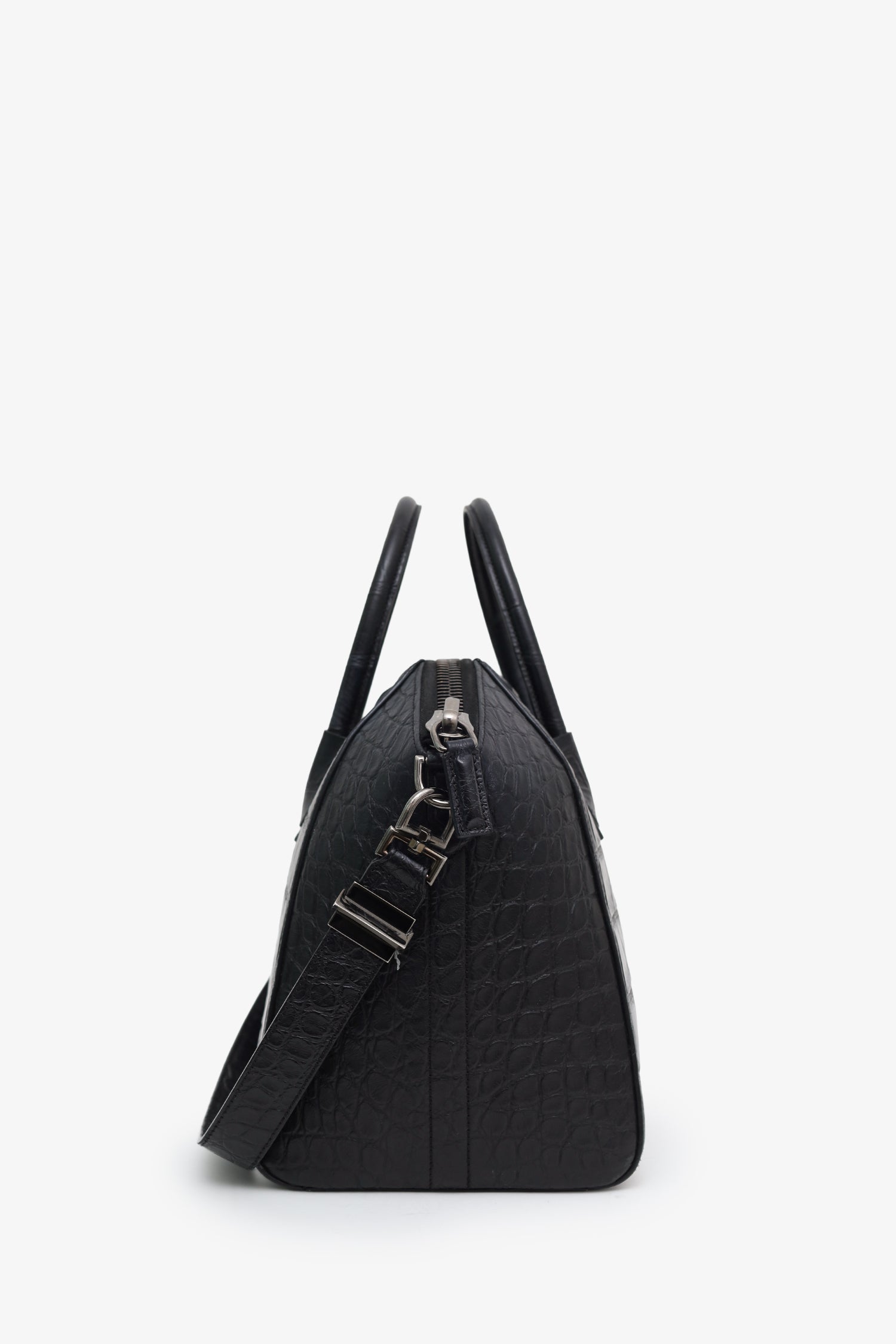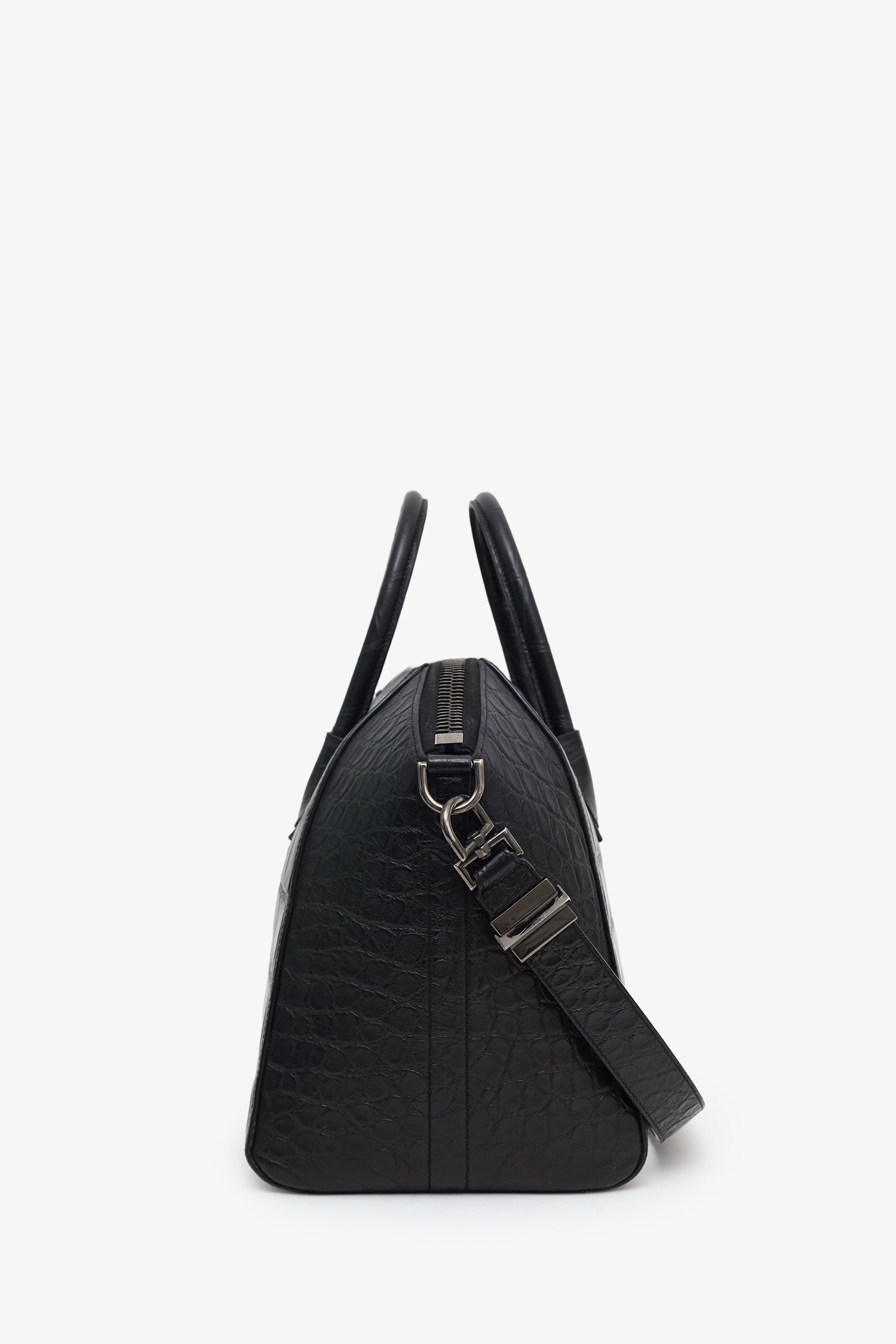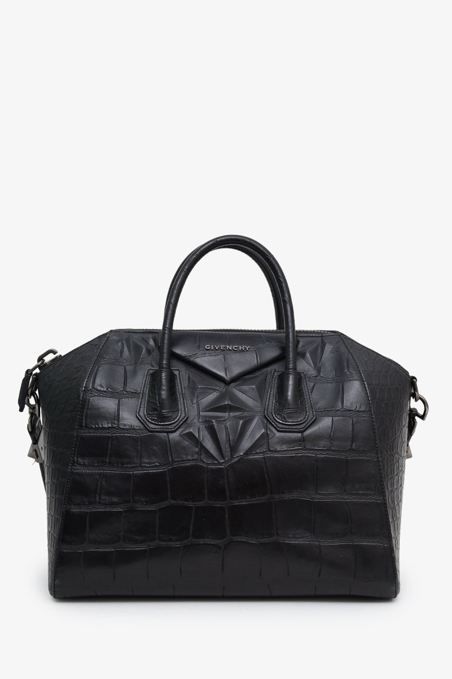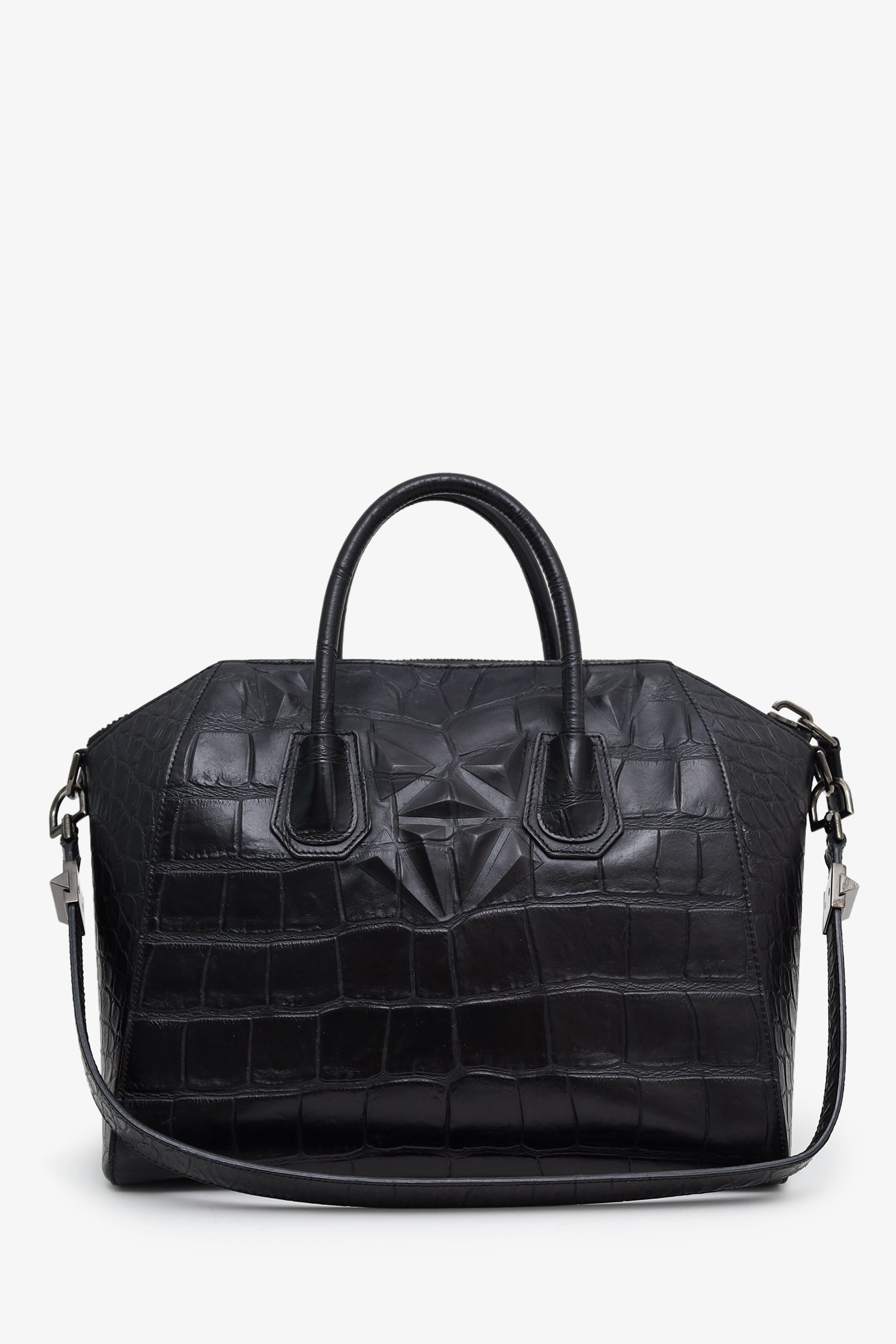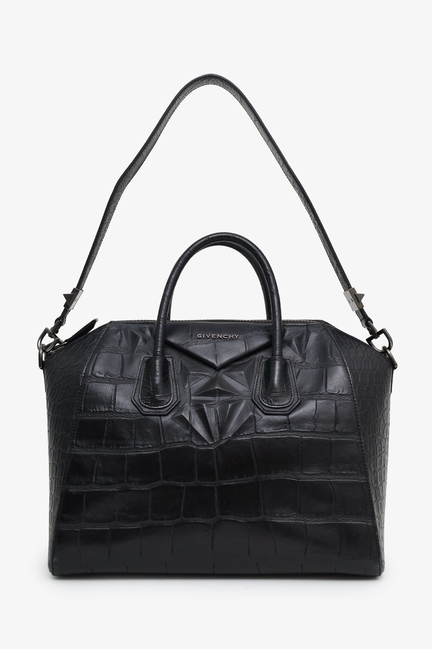 Givenchy Black Embossed Medium Antigona Top Handle Bag With Strap. Top zip closure. Twin top handles. Removable shoulder strap with clasp closure. Lined interior with 3 pockets; 2 slip, and 1 zip. Gunmetal-tone hardware. Tonal stitching.