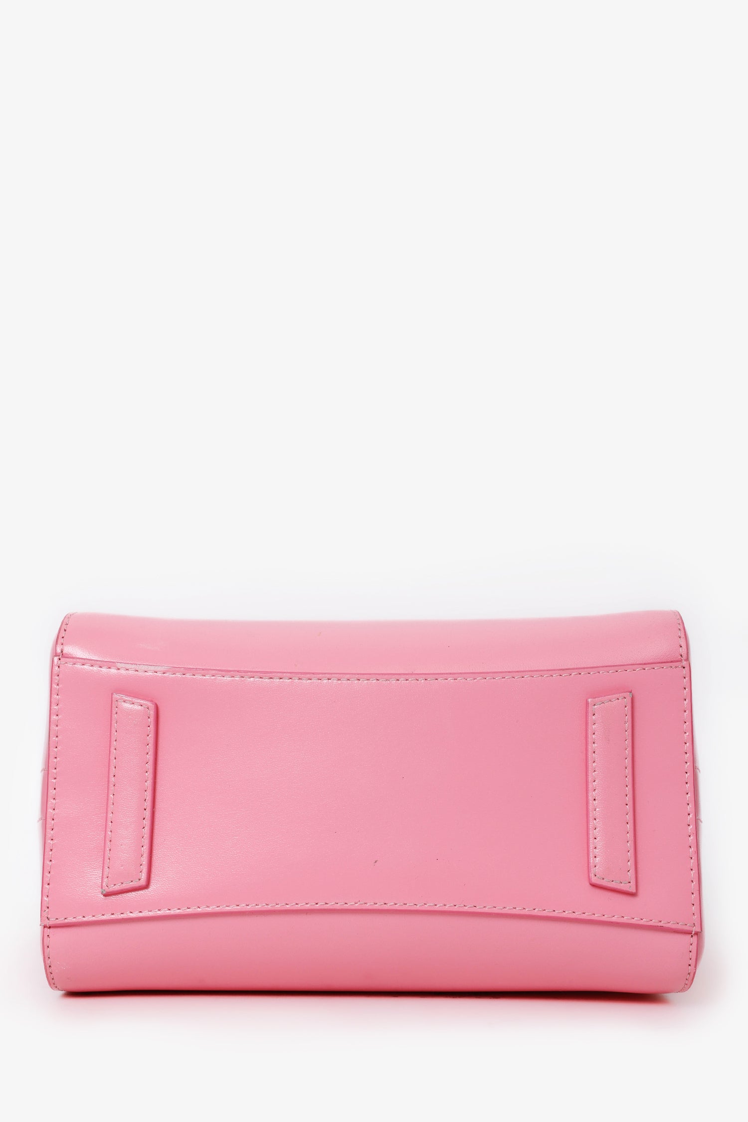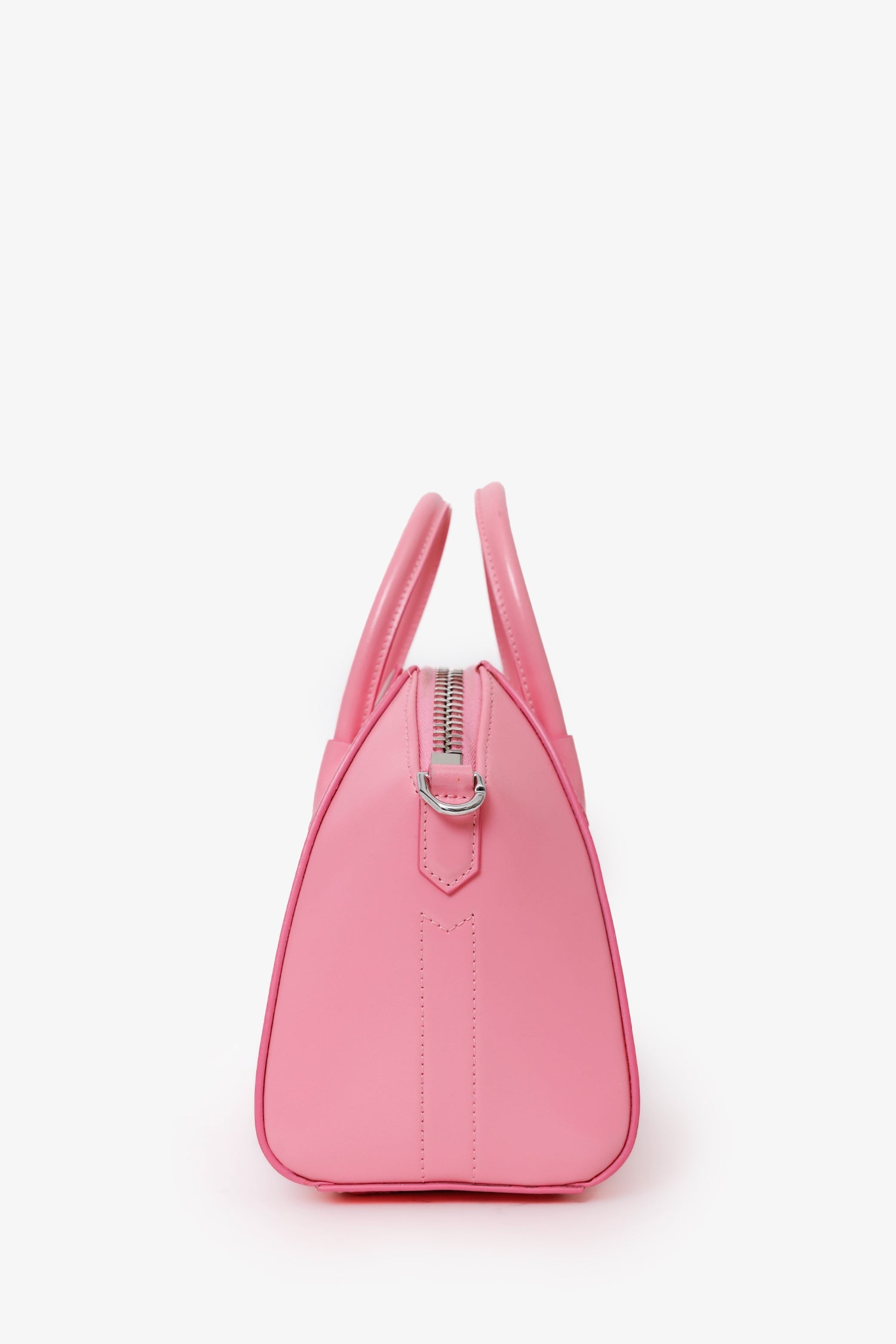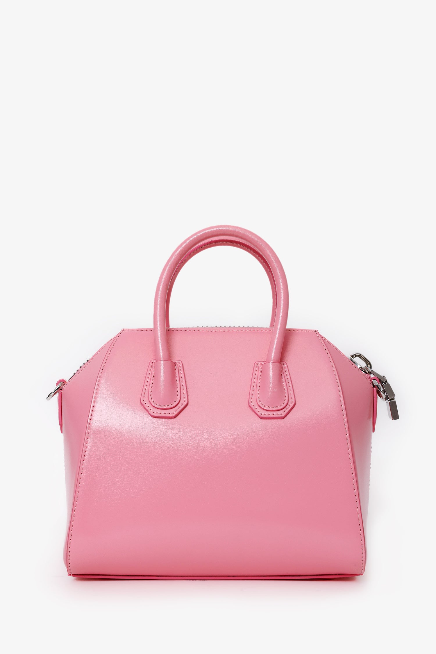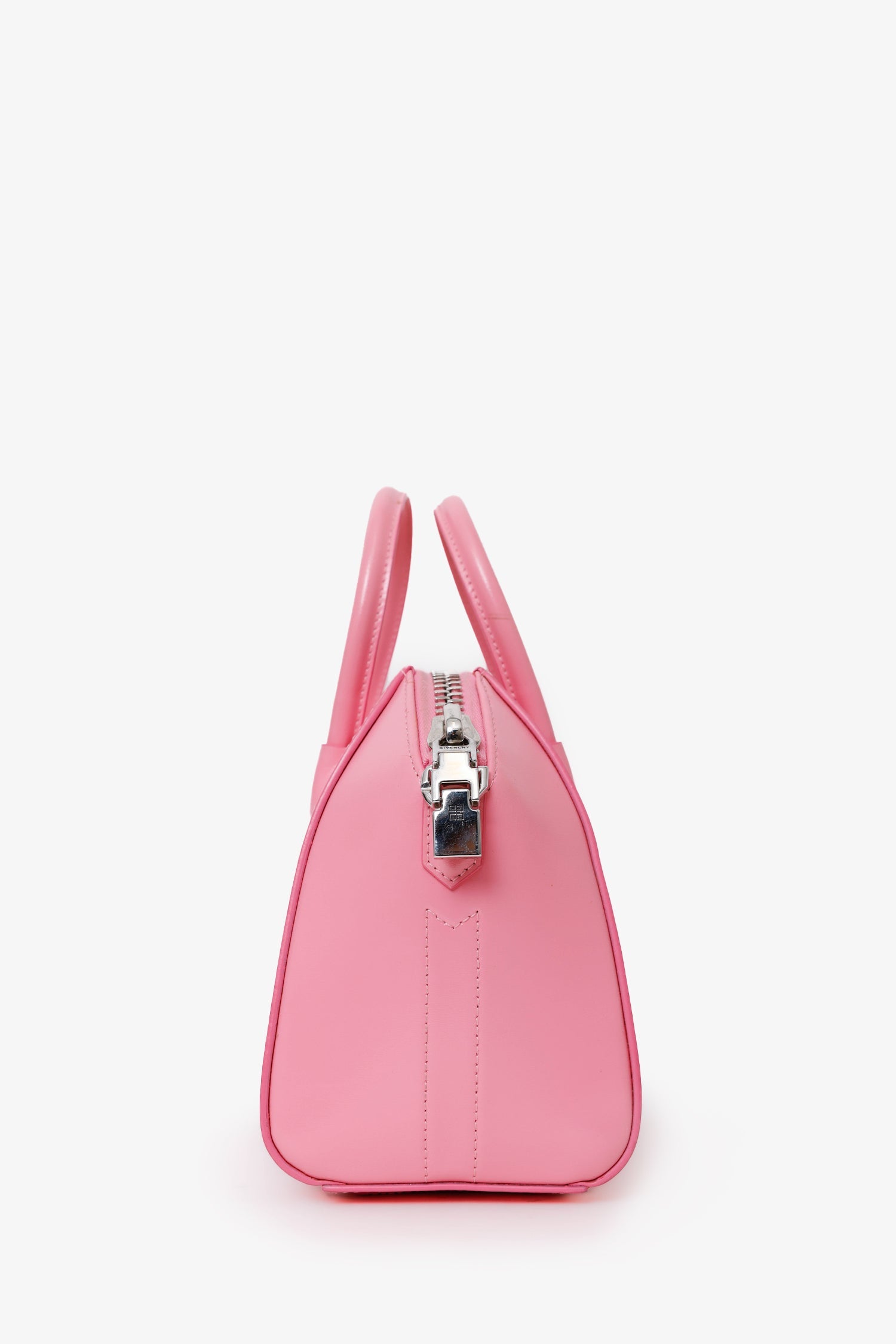 Givenchy Pink Leather Small Antigona Top Handle Bag. Top zip closure. Twin top handles. 3 interior pockets; 2 slip and 1 zip. Canvas-lined interior. Silver-tone hardware. Tonal stitching.
