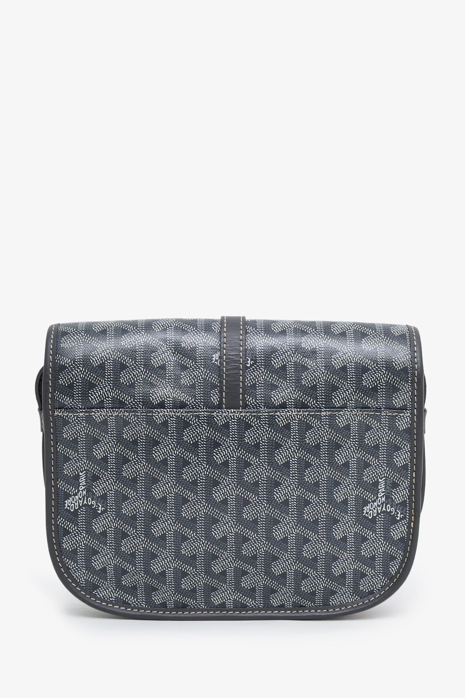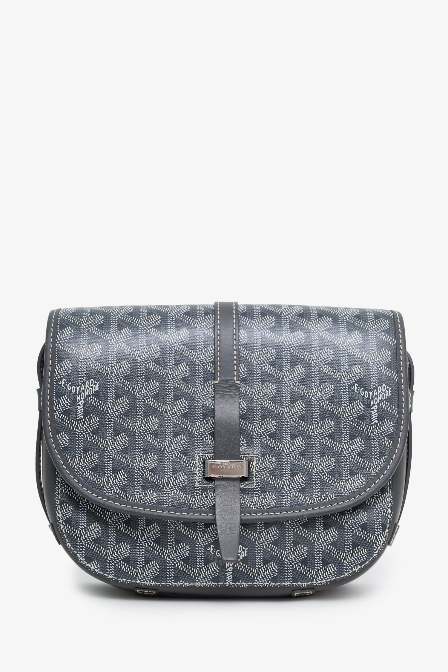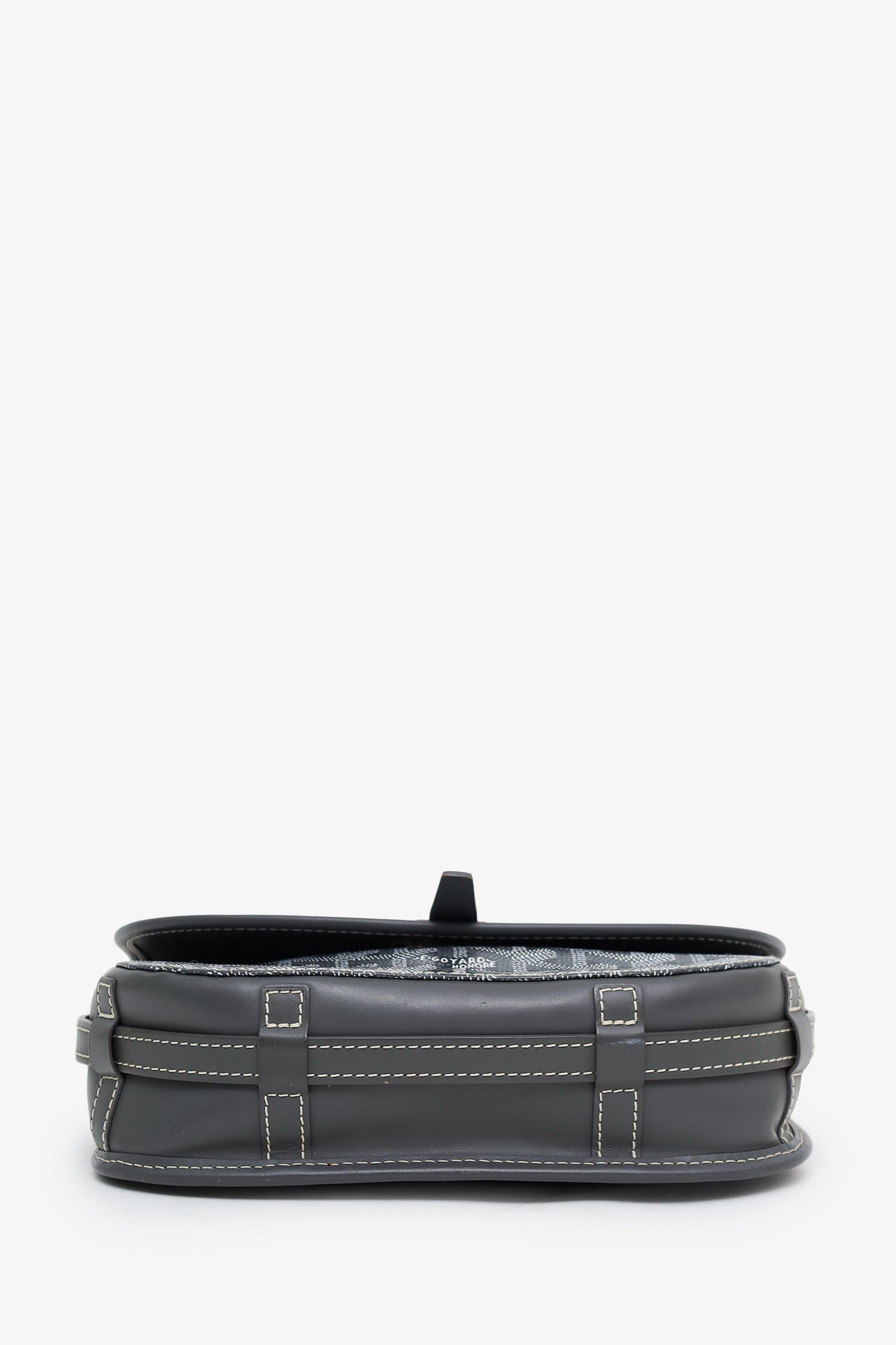 Goyard Grey Goyardine Belvedere II PM Messenger Bag. Front fold-over flap with pull-through closure. Adjustable crossbody strap with pull-through buckle closure. Single rear exterior slip pocket. Lined interior with 3 slip pockets. Lined interior. Contrast stitching.