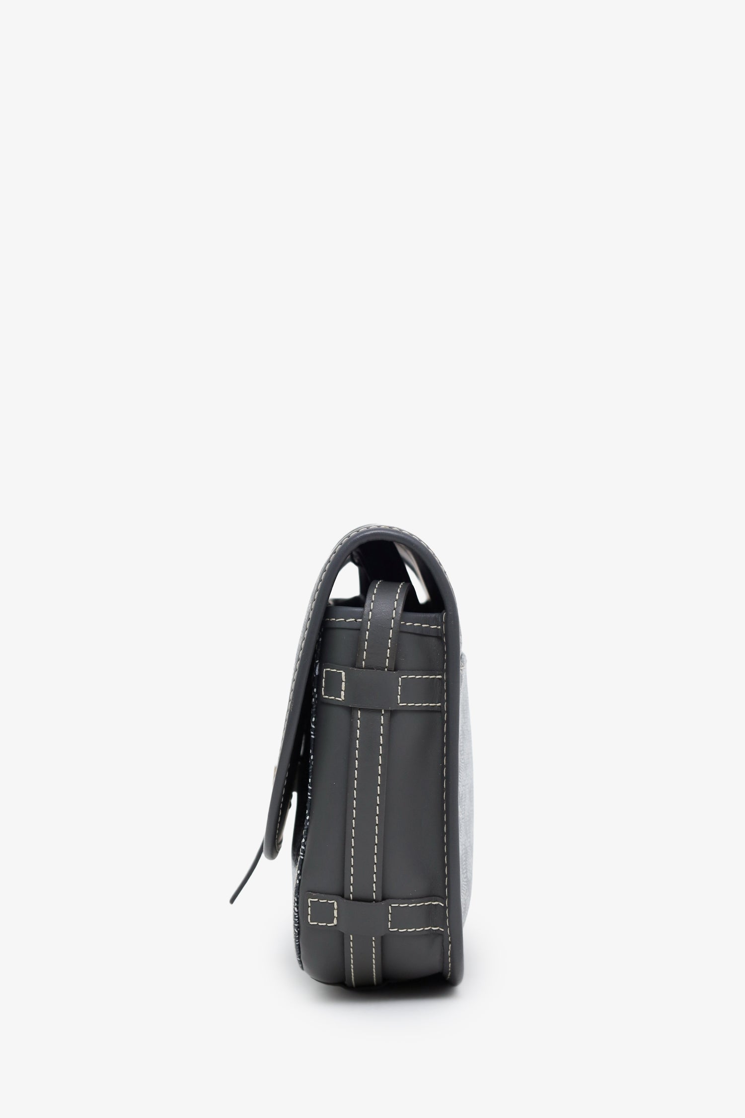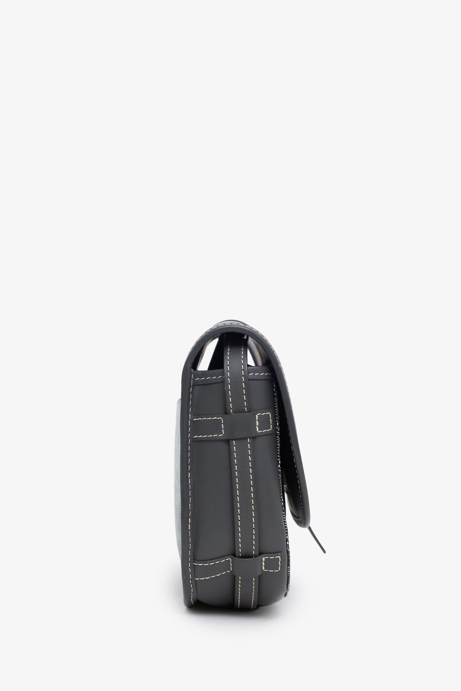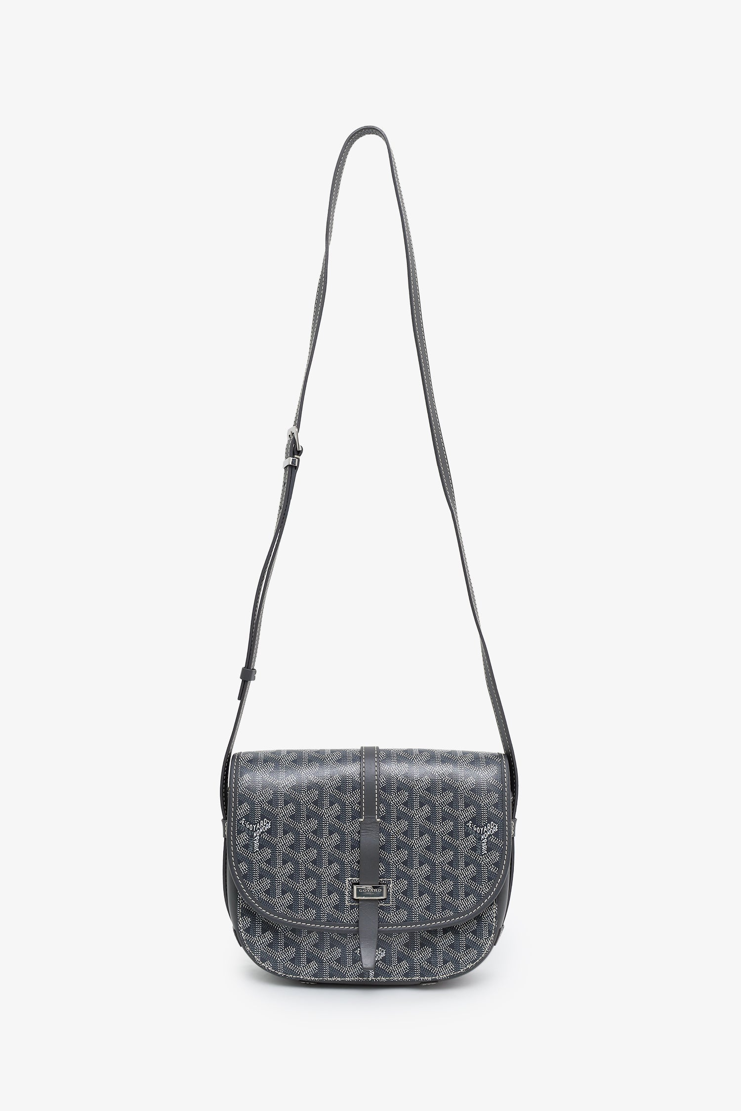 Goyard Grey Goyardine Belvedere II PM Messenger Bag. Front fold-over flap with pull-through closure. Adjustable crossbody strap with pull-through buckle closure. Single rear exterior slip pocket. Lined interior with 3 slip pockets. Lined interior. Contrast stitching.