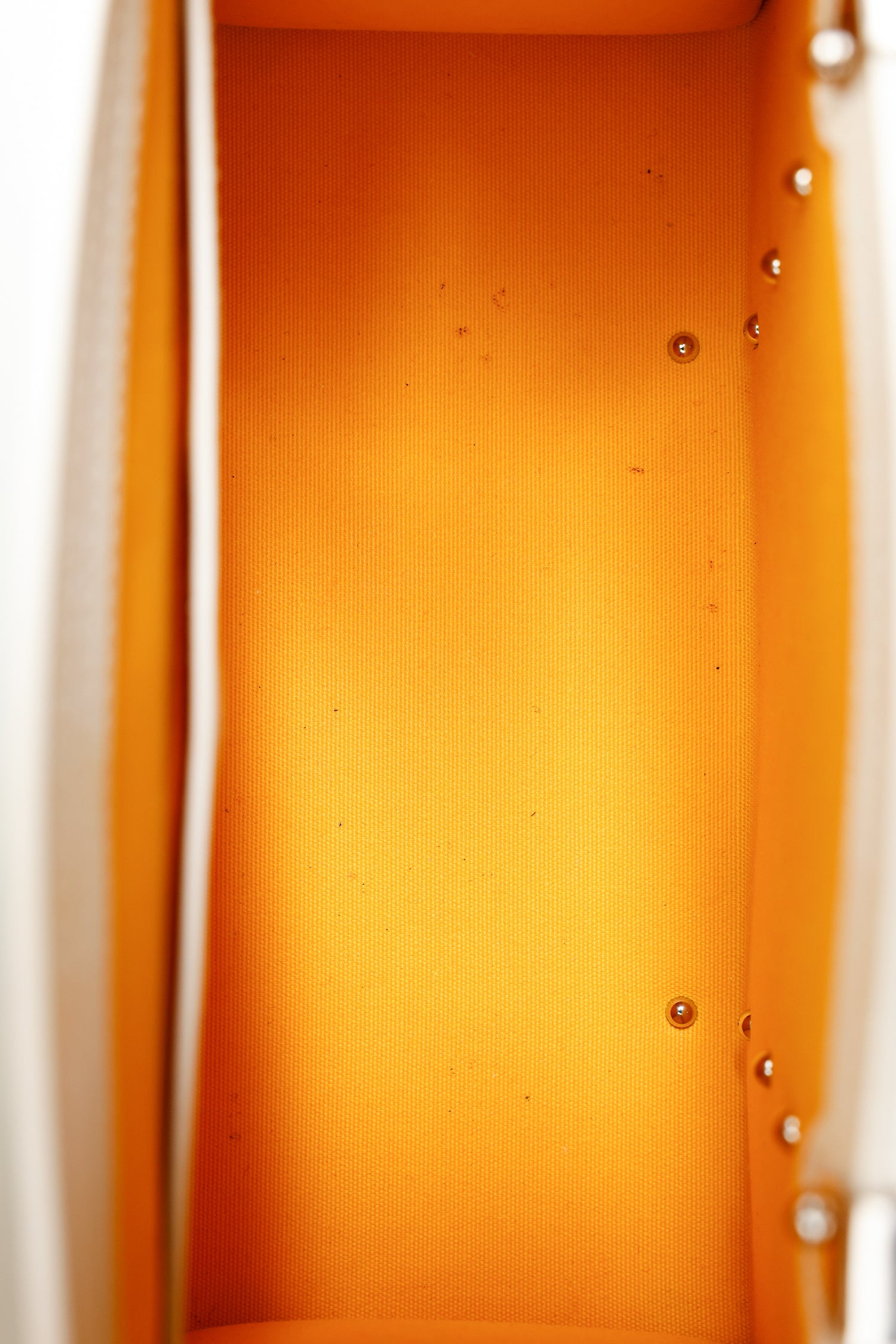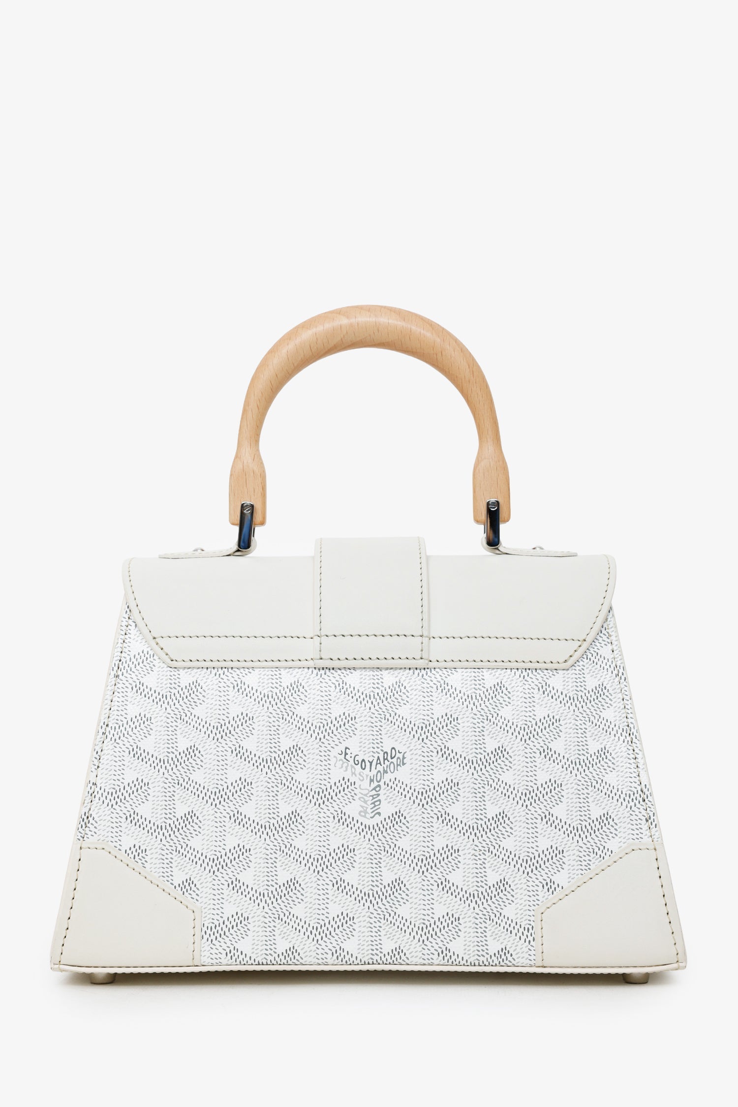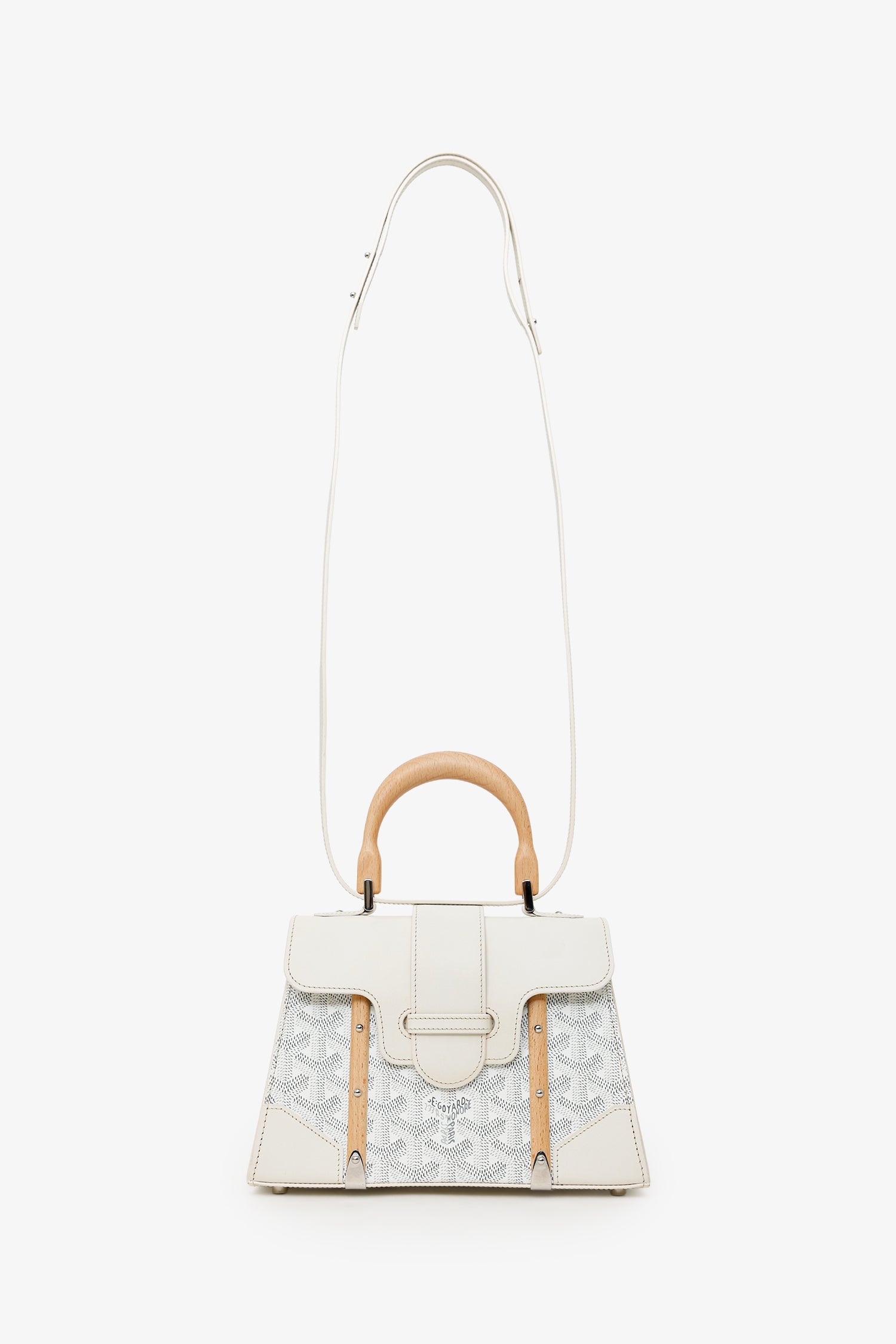 Goyard White Goyardine Saigon Mini Top Handle With Strap. Front fold-over flap with pull through strap closure. Top handle. Removable shoulder strap with adjustable pull-through push-pin closure. Protective base studs. Lined interior with single slip pocket. Silver-tone hardware. Tonal stitching.
