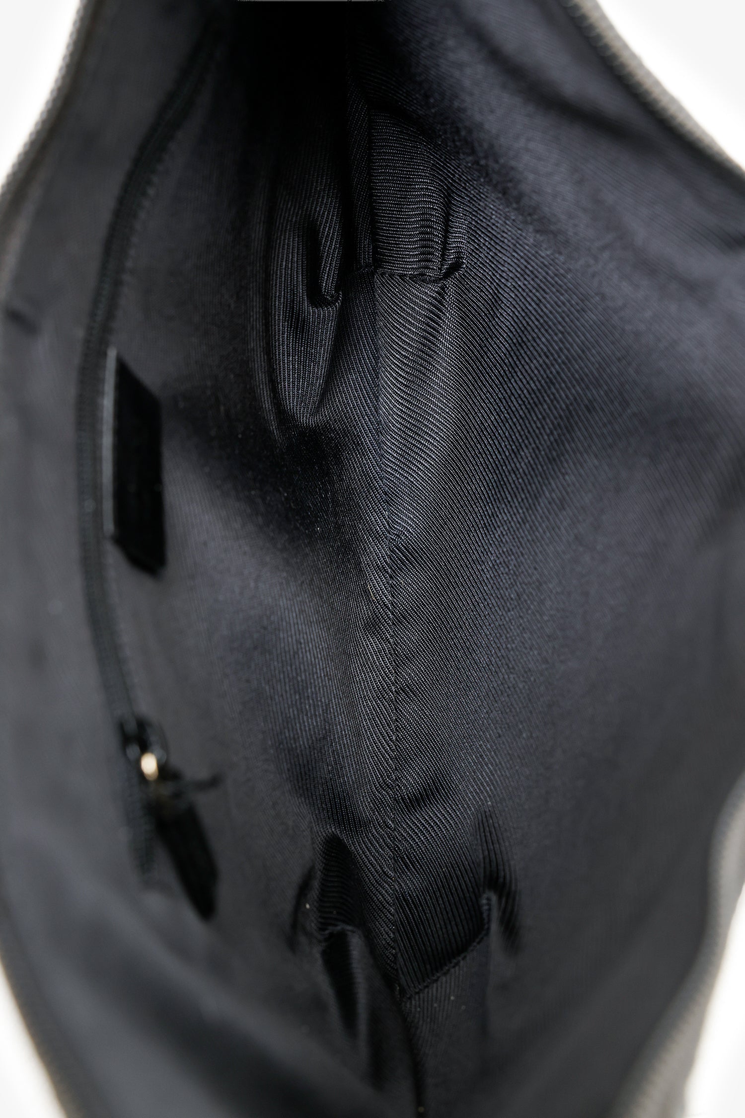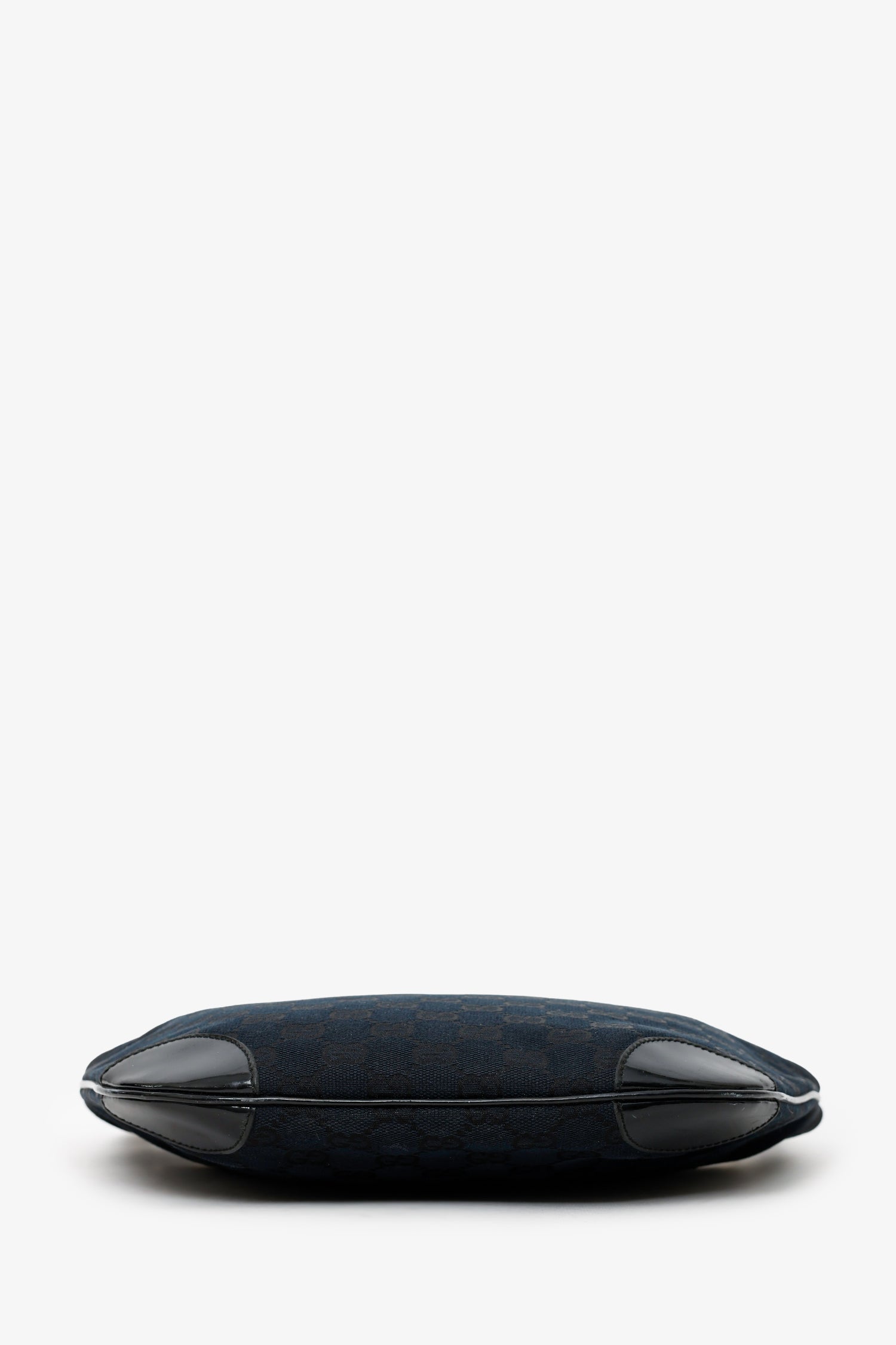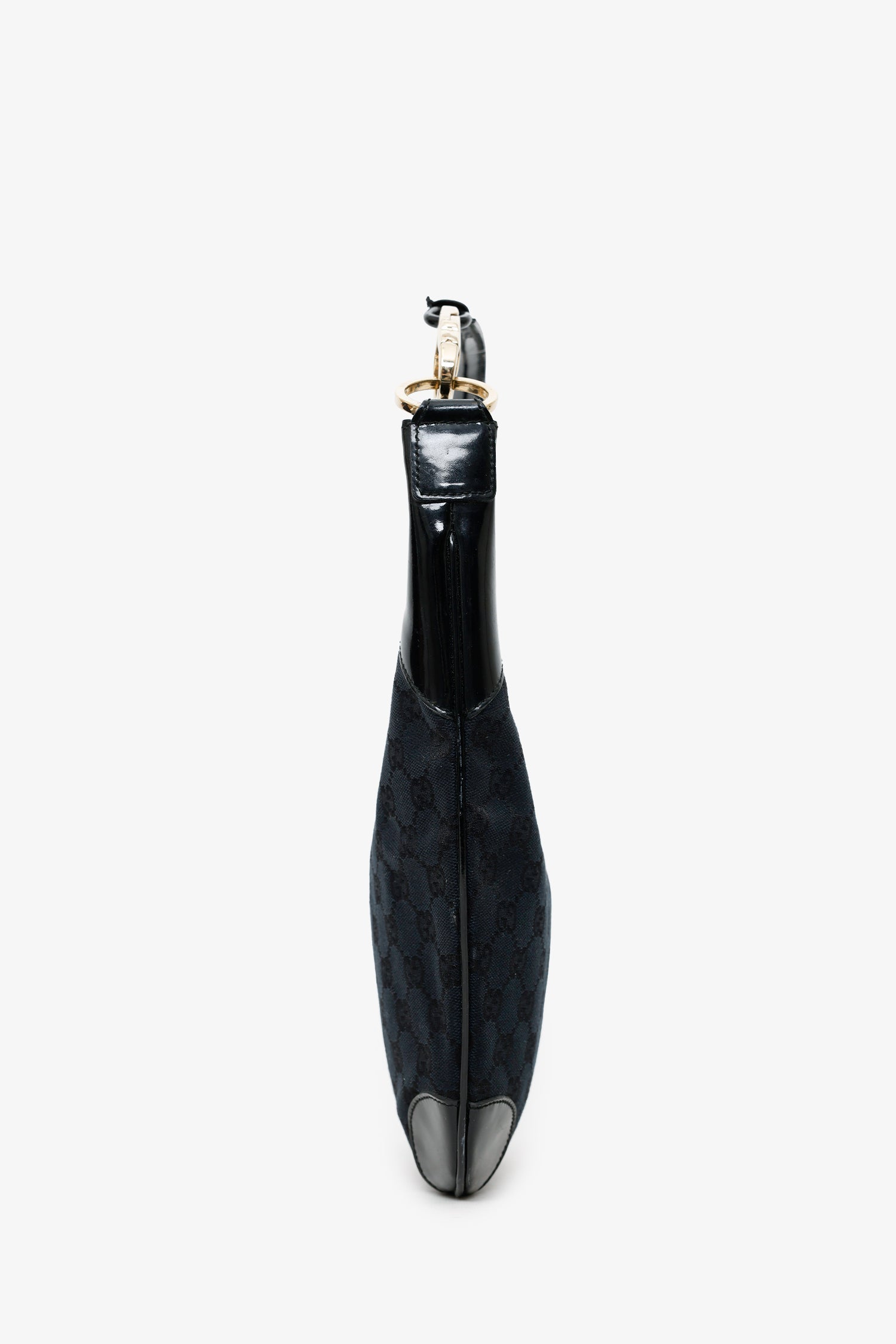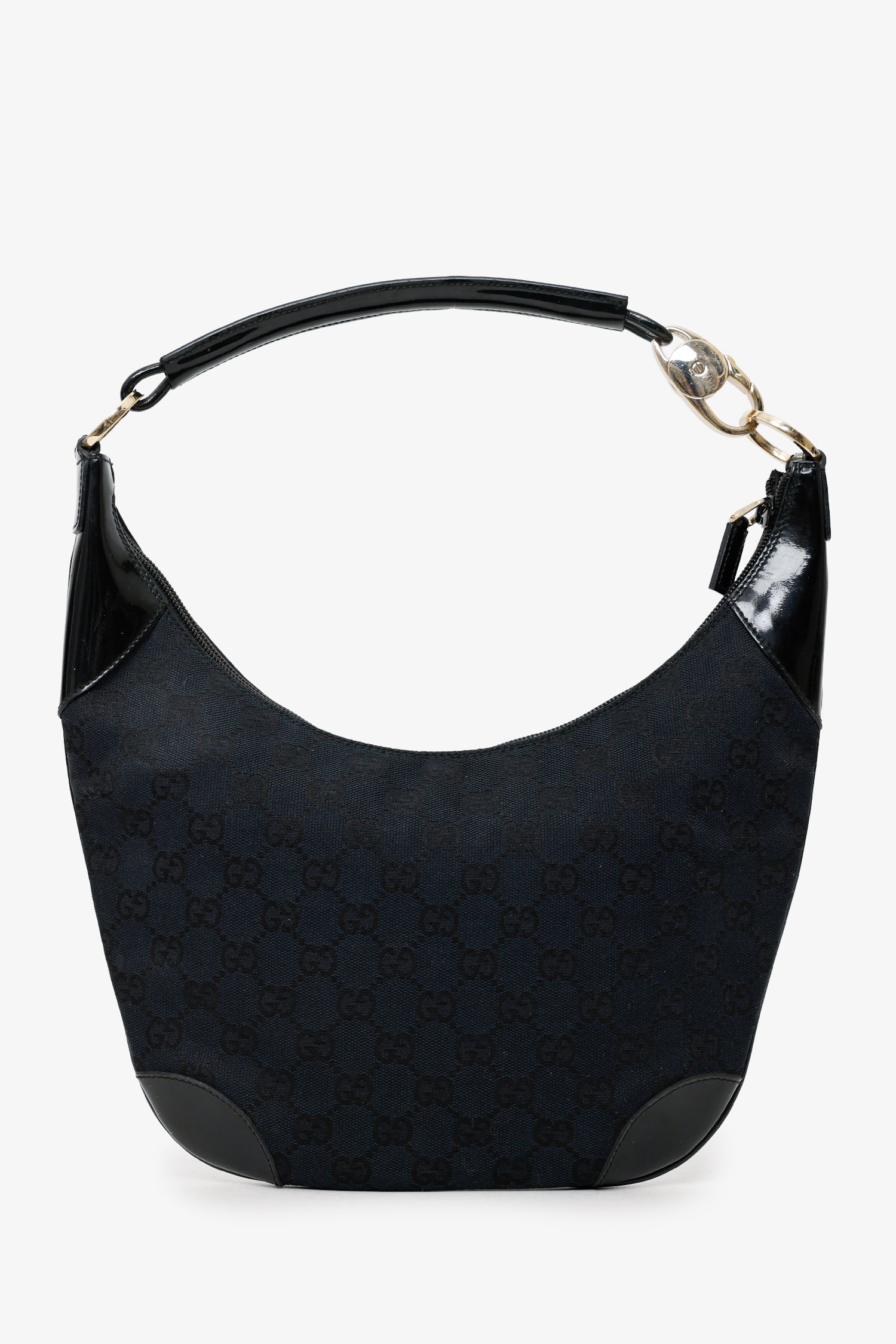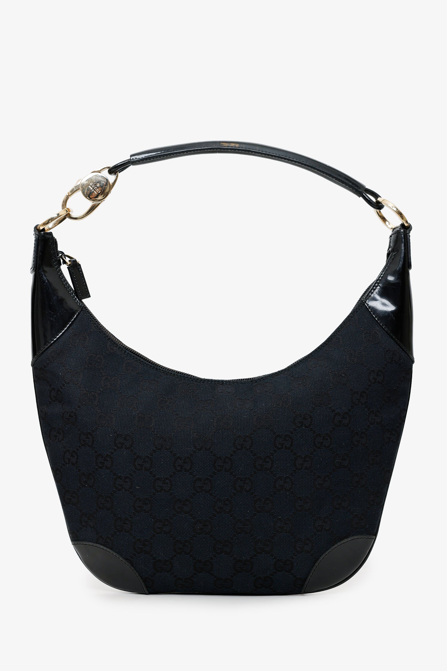 Gucci Black GG Canvas/Patent Leather Clip Hobo. Top zip closure. Shoulder strap with clasp closure. Lined interior with single rear zip pocket. Gold-tone hardware. Tonal stitching.