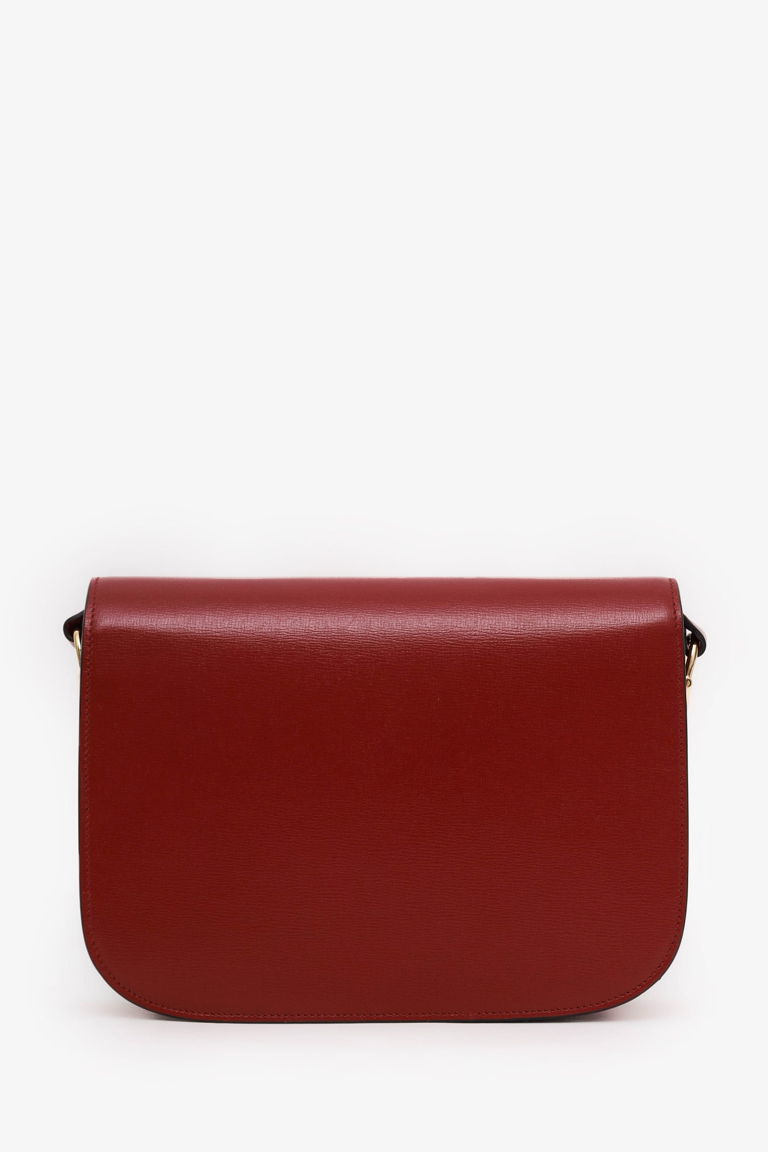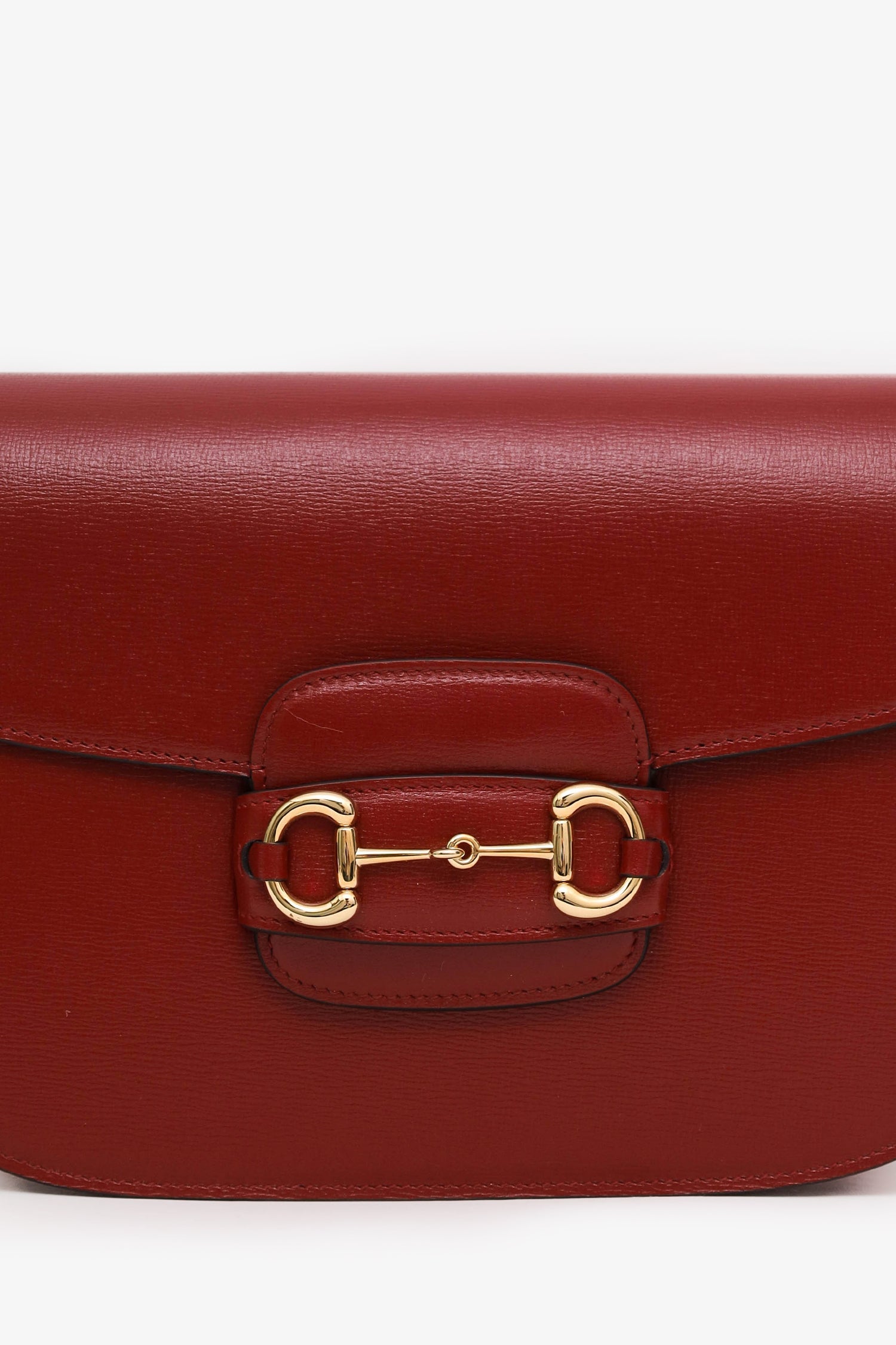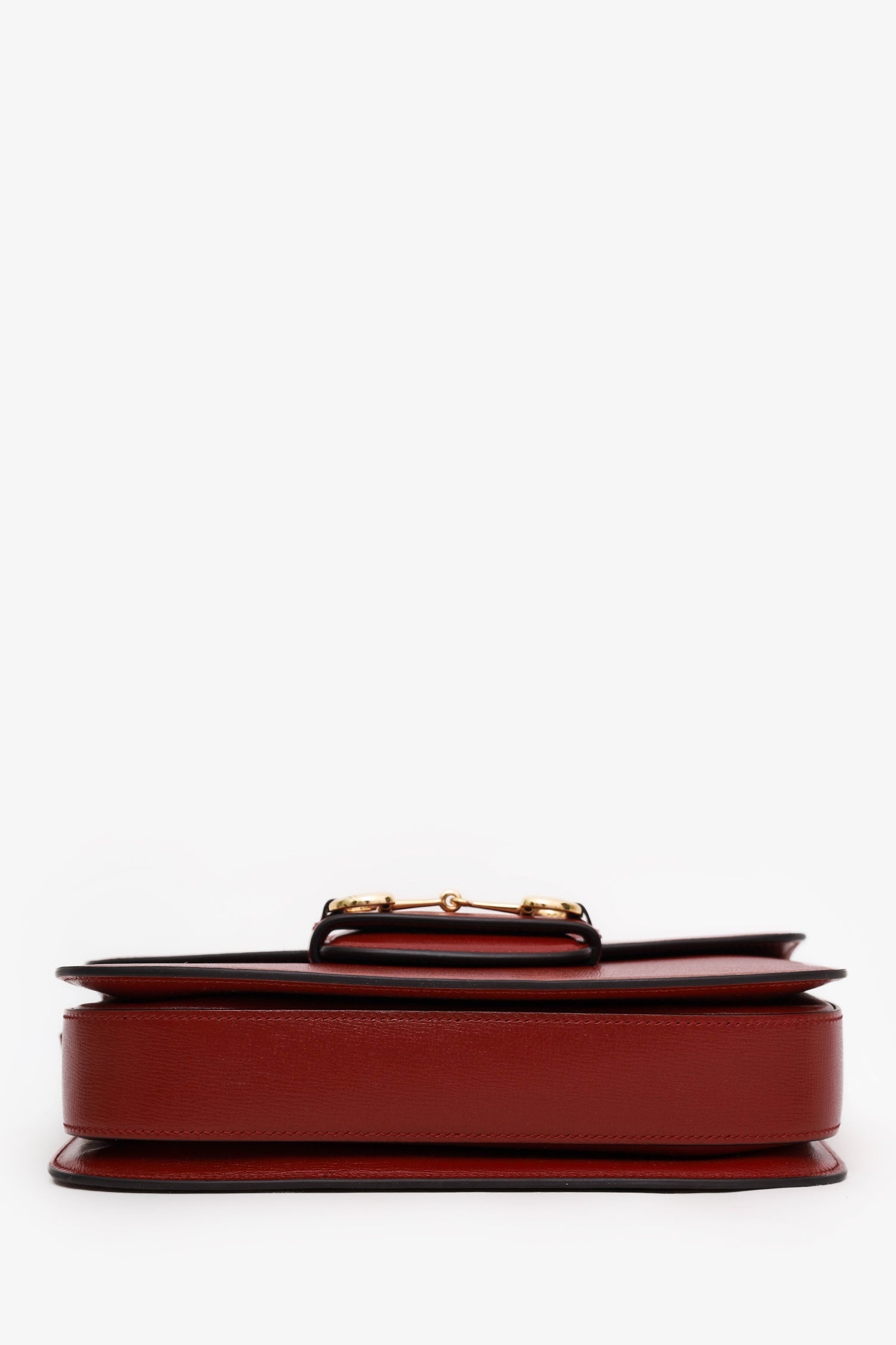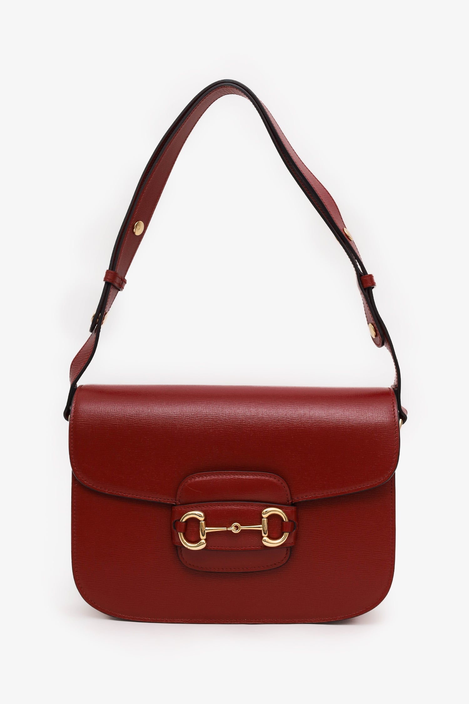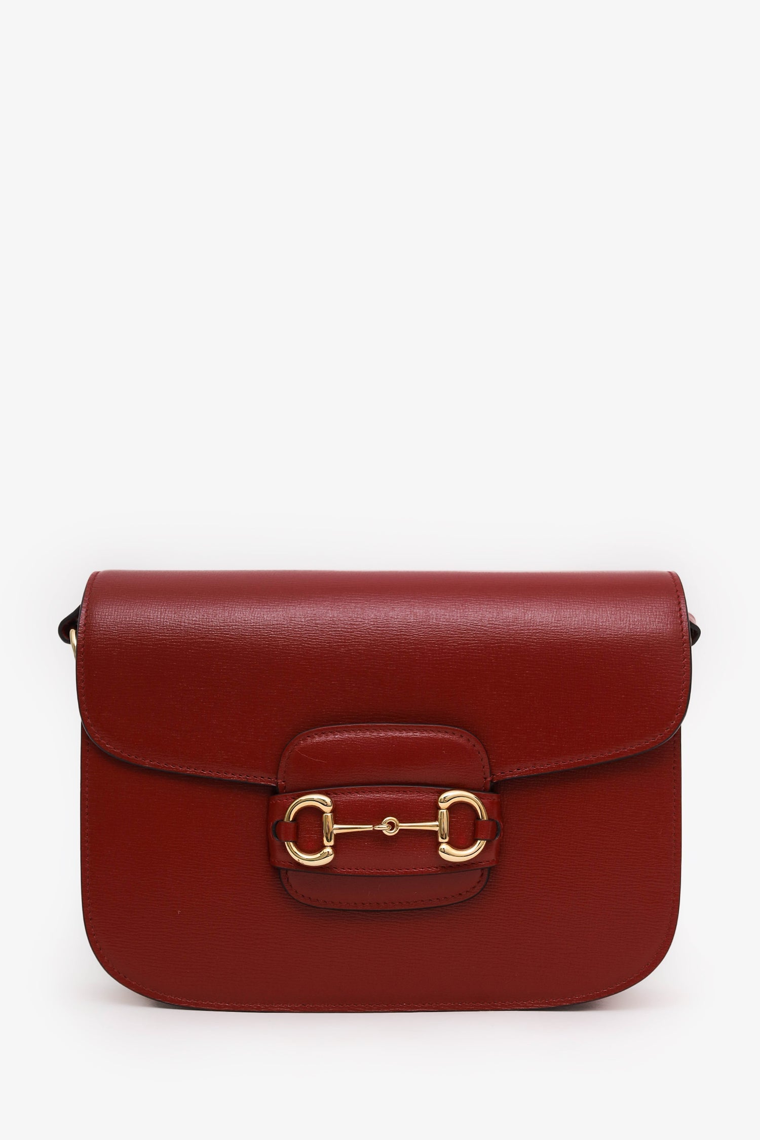 Gucci Red Leather Horsebit Medium 1955 Shoulder Bag. Front fold-over flap with slip-through closure. Shoulder strap with snap-button closure. 3 interior compartments; front with slip pocket, middle with zip pocket, rear open. Gold-tone hardware. Tonal stitching.