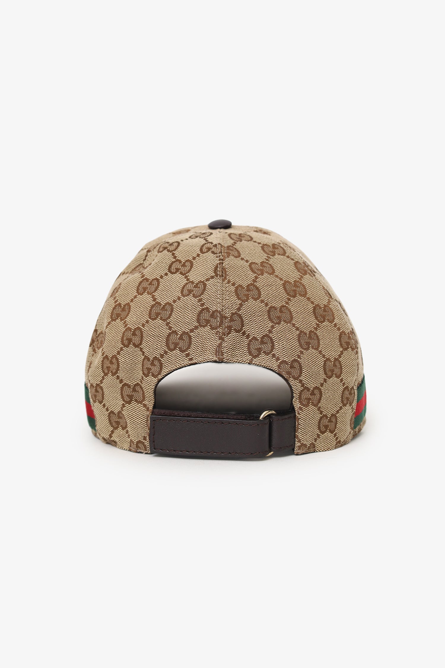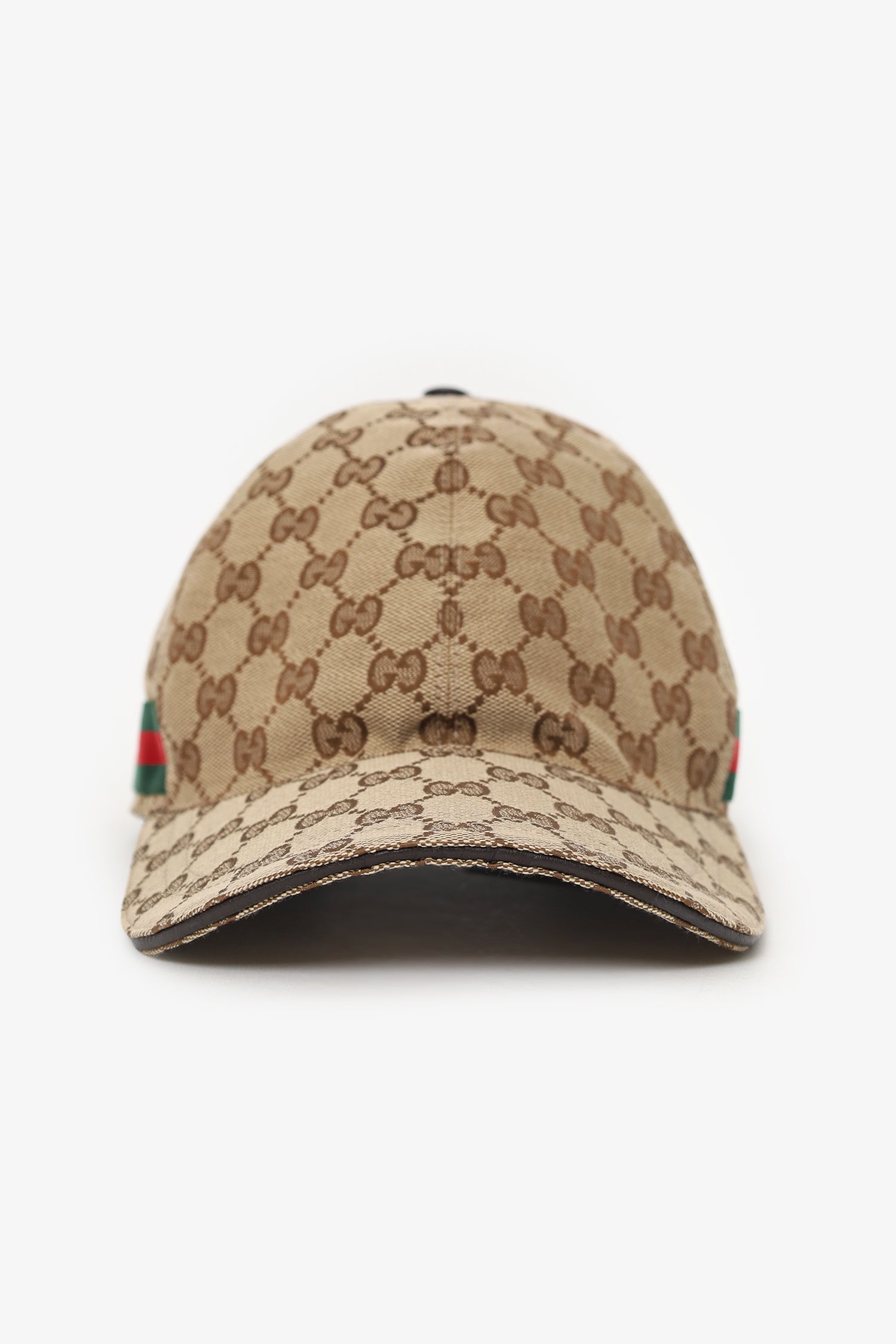 Gucci Beige 'GG' Canvas Cap. Adjustable rear pull-through velcro closure. Lined interior. Gold-tone hardware. Tonal stitching.