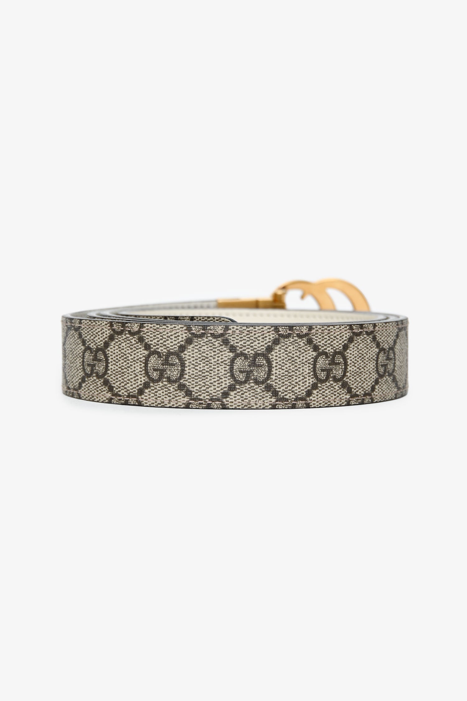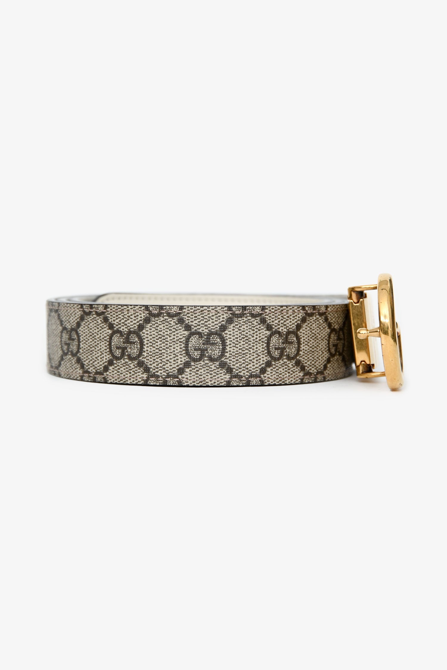 Gucci Beige GG Supreme Coated Canvas Belt. Adjustable pull-through buckle closure. Gold-tone hardware. Tonal stitching.