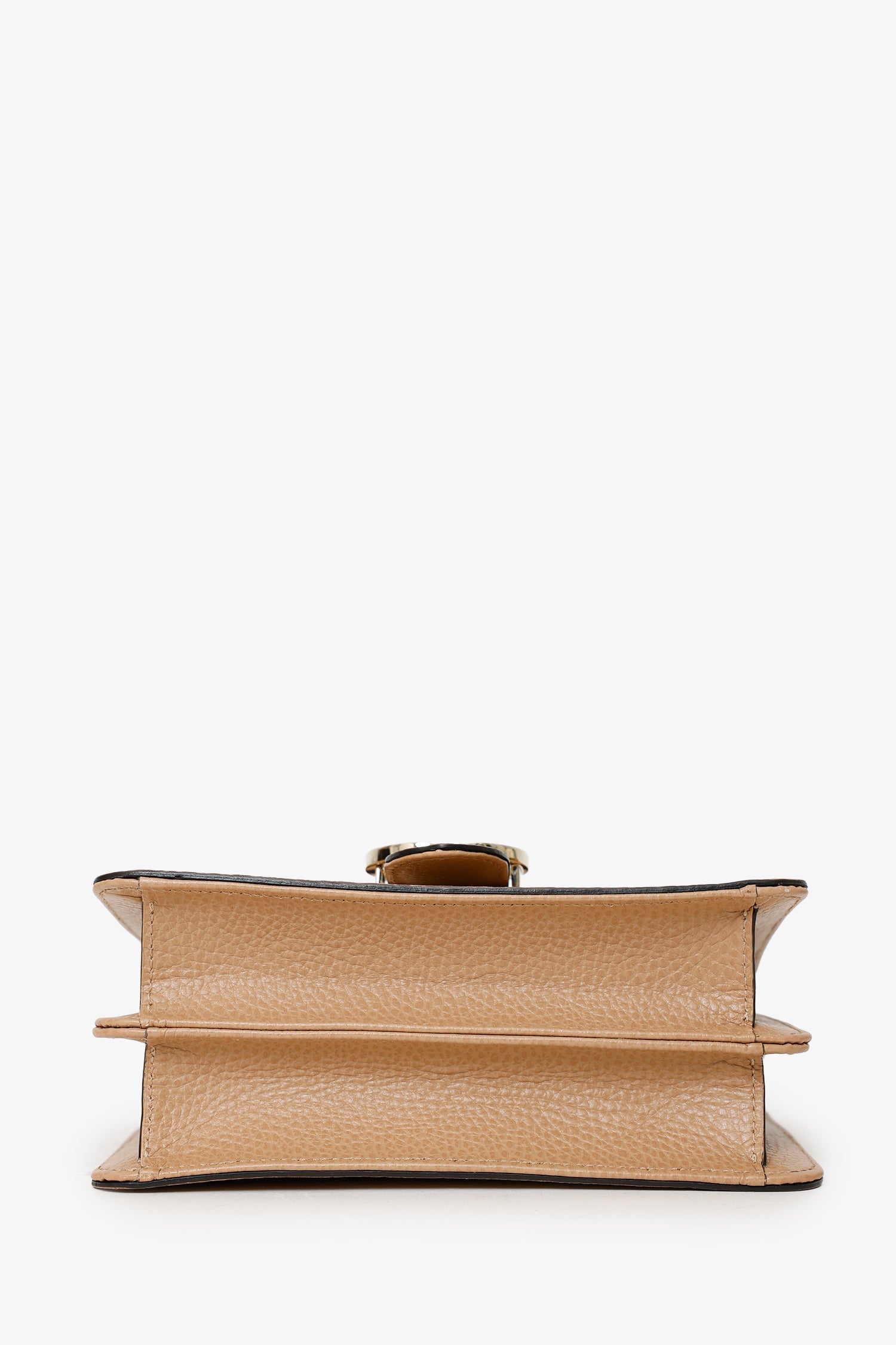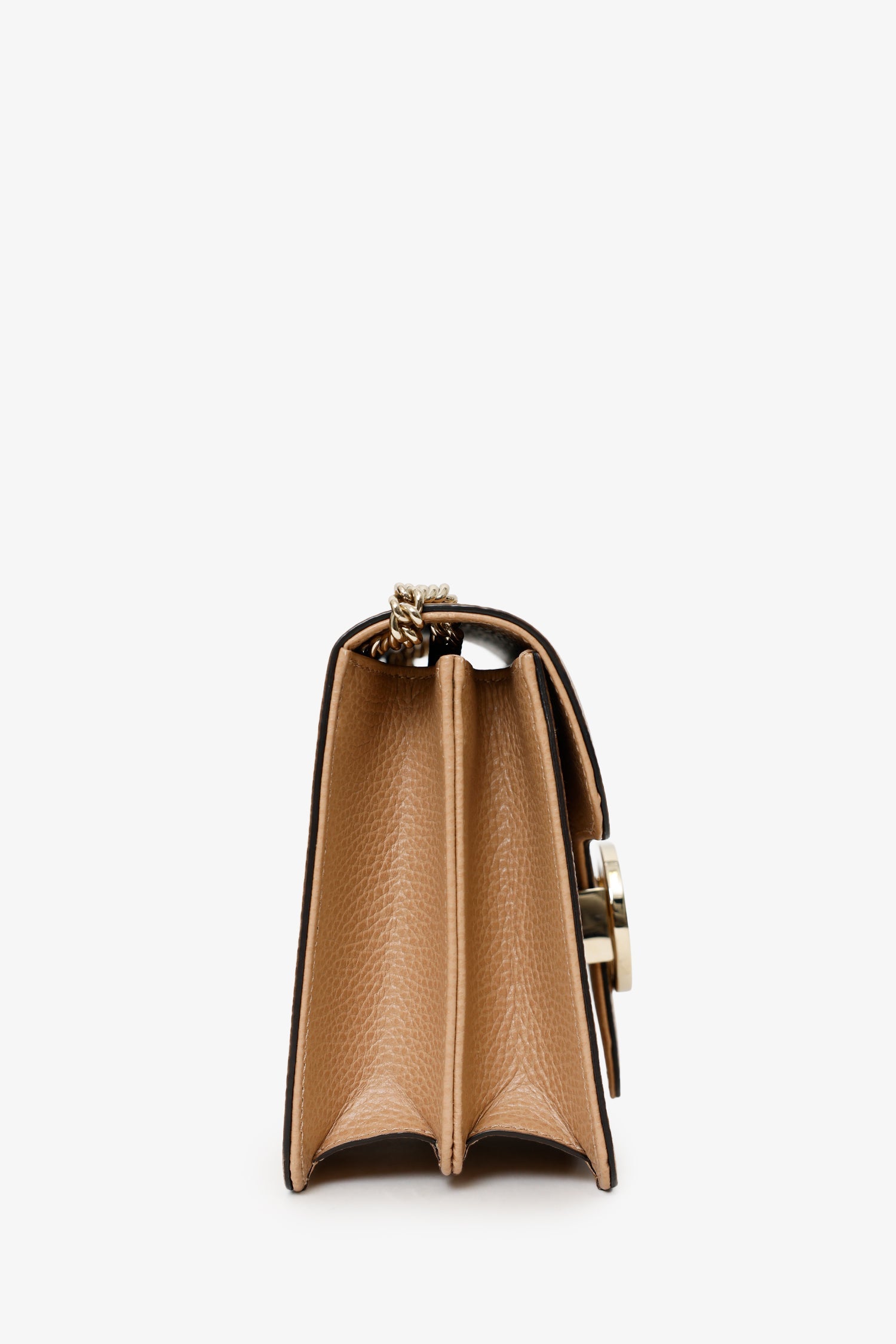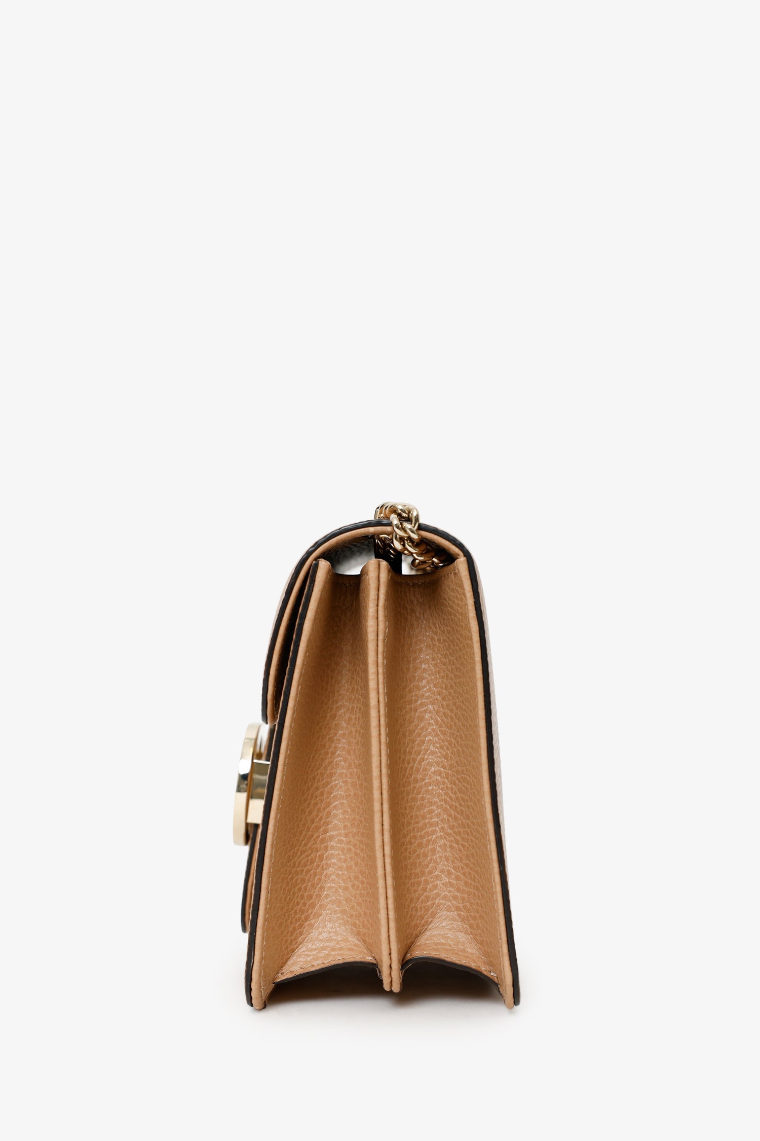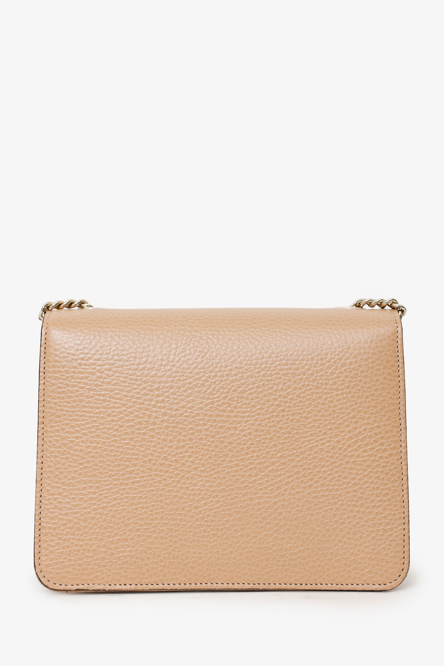 Gucci Beige Leather Interlocking G Small Dollar Crossbody Bag. Front fold-over flap with flip-lock closure. Chainlink strap that can be doubled as shoulder straps. 2 interior compartments; front open and rear slip pocket. Gold-tone hardware. Tonal stitching.