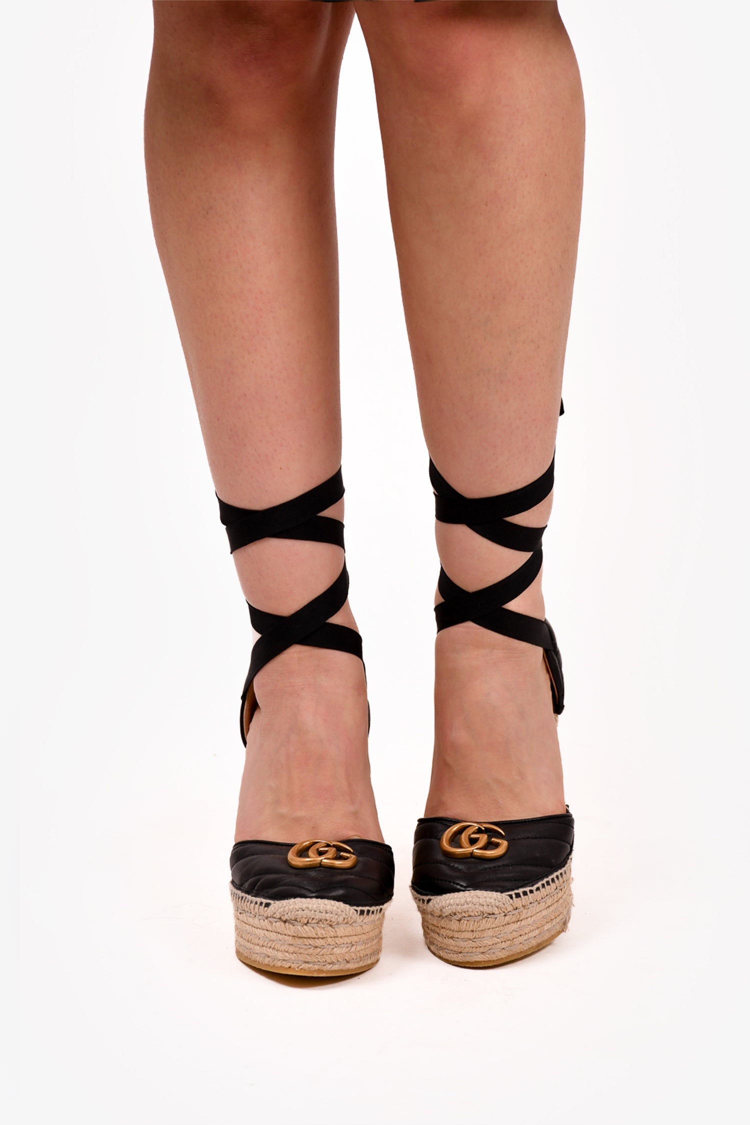 Gucci Black Chevron Leather Marmont Espadrille Wedges. Tie closure. Tonal stitching.