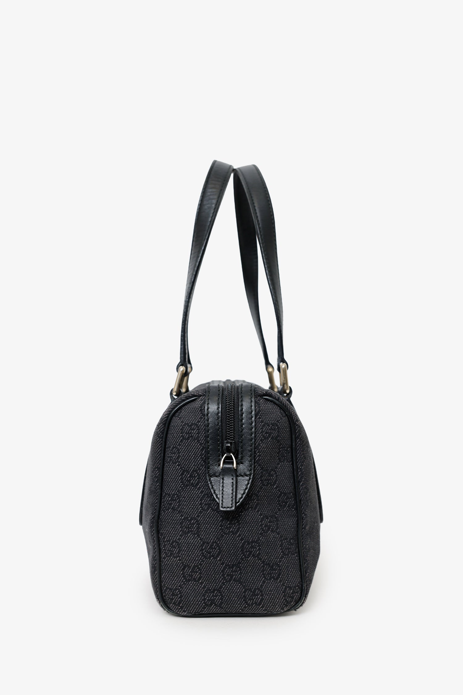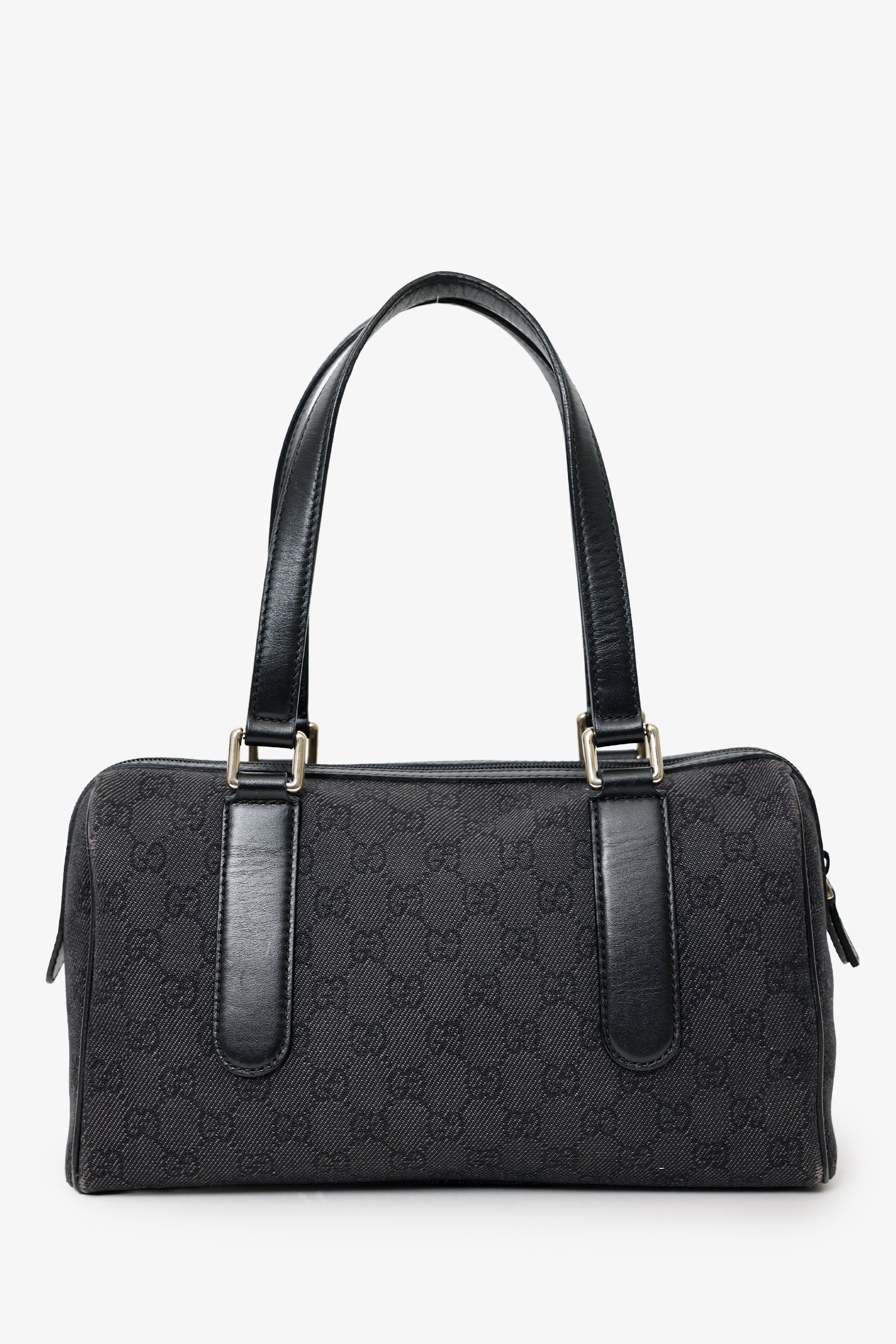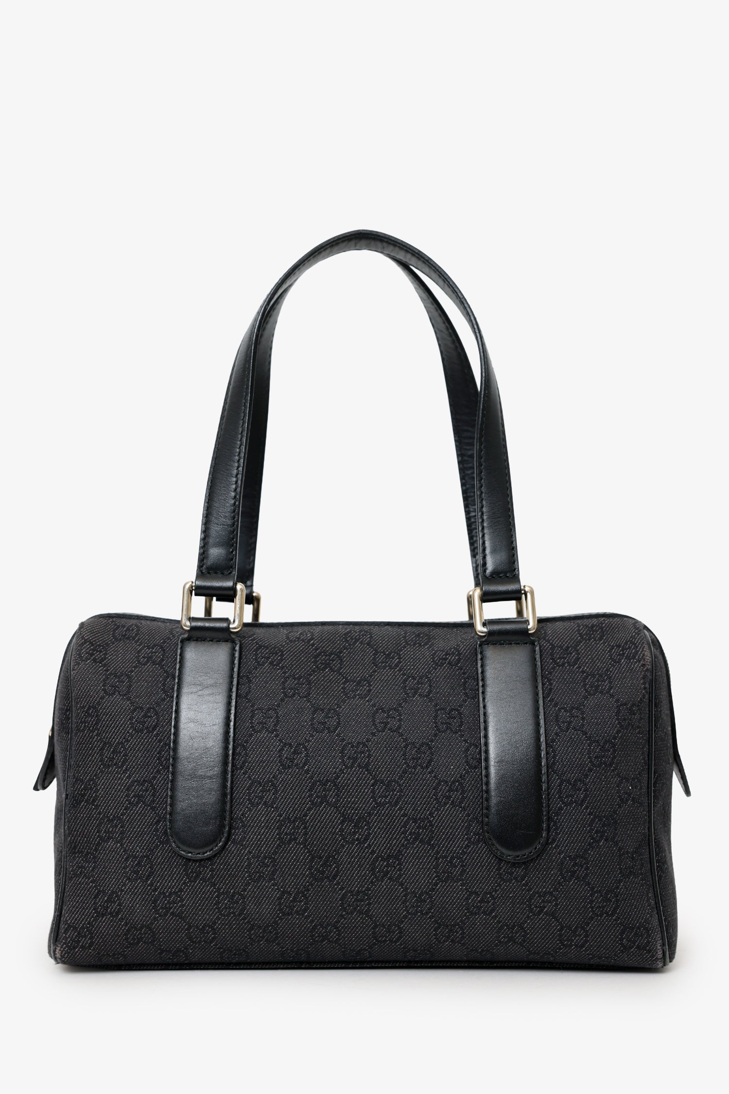 Gucci Black GG Canvas/Leather Boston Bag. Top zip closure. Twin top handles. Lined interior. 2 interior pockets; 1 zip closure and 1 slip. Silver-tone hardware. Tonal stitching.