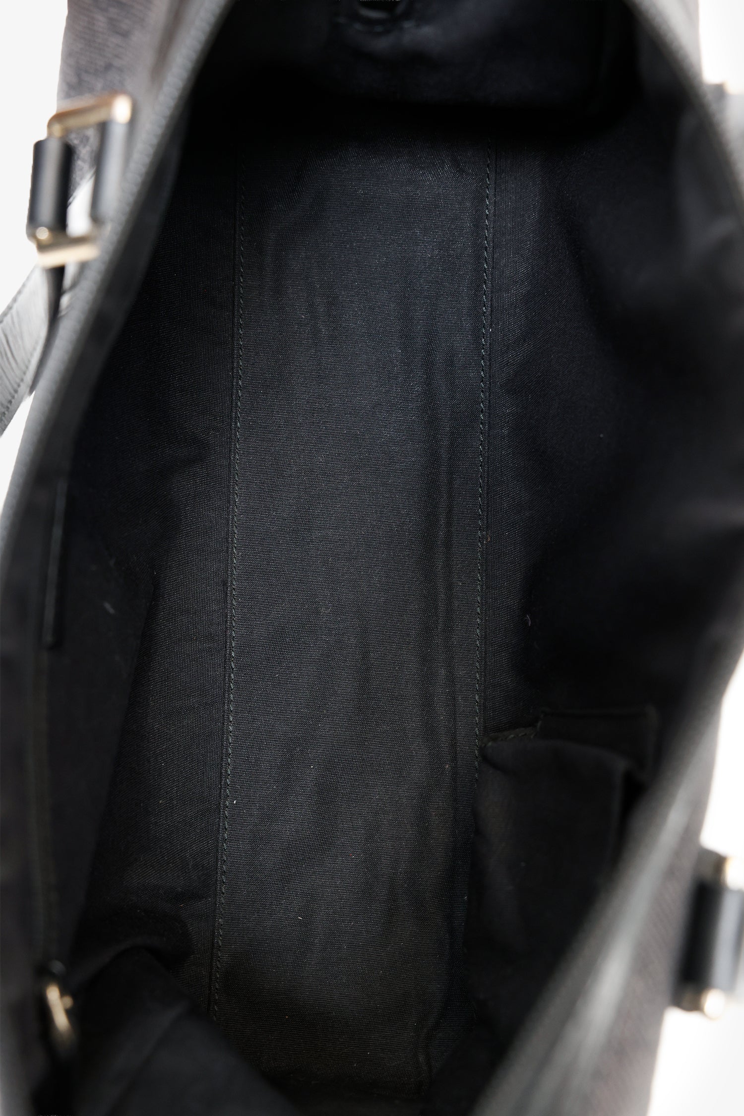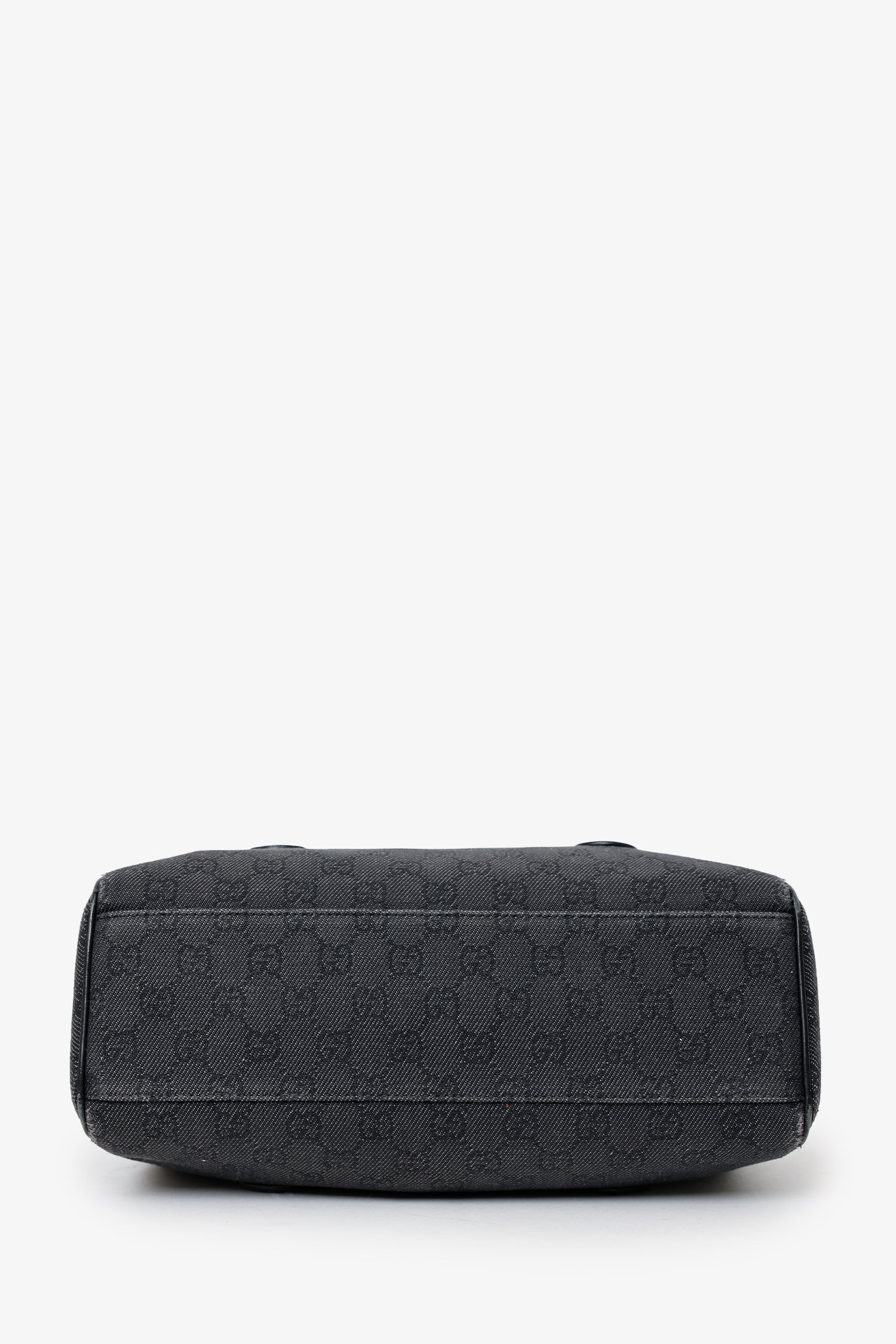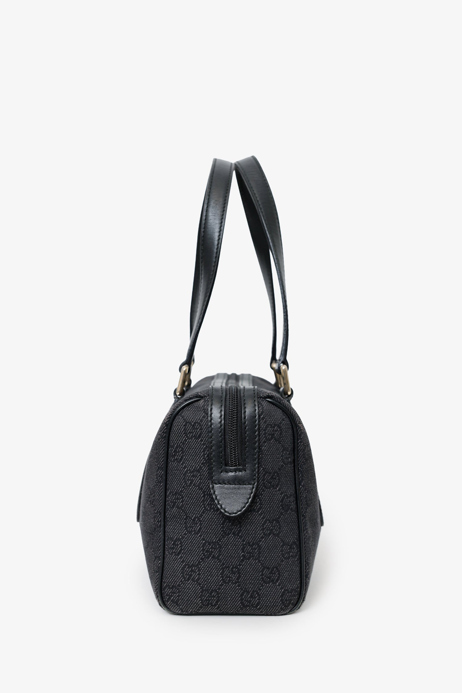 Gucci Black GG Canvas/Leather Boston Bag. Top zip closure. Twin top handles. Lined interior. 2 interior pockets; 1 zip closure and 1 slip. Silver-tone hardware. Tonal stitching.