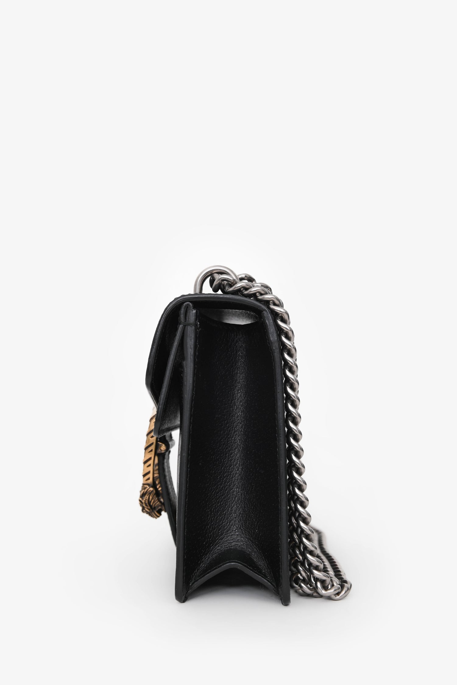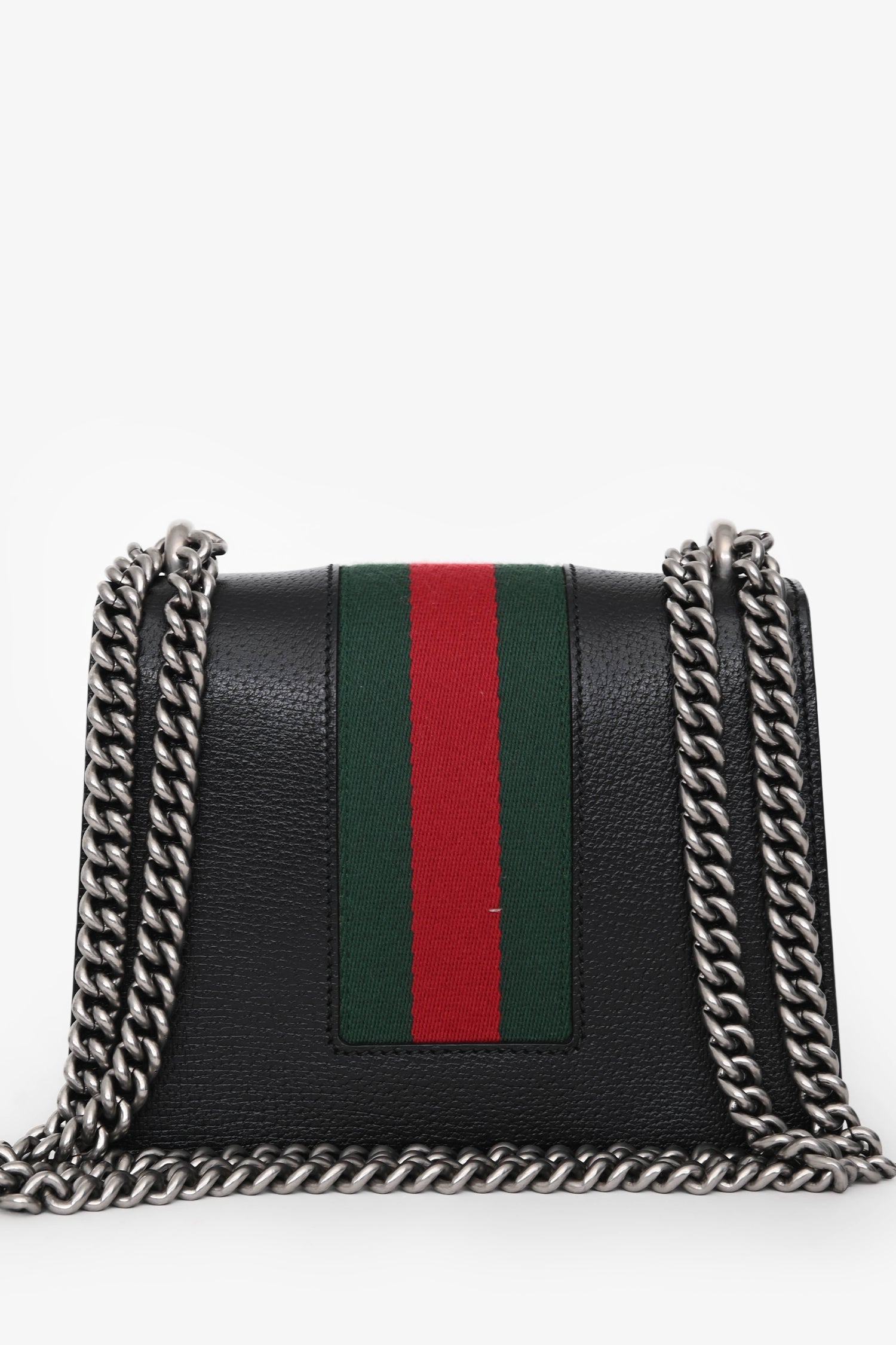 Gucci Black Leather Mini Dionysus Web Mixed Hardware Chain Bag. Double fold-over flaps with a push-lock closure. Chain-link crossbody strap. 2 interior compartments. Silver-tone and gold-tone hardware. Tonal stitching.