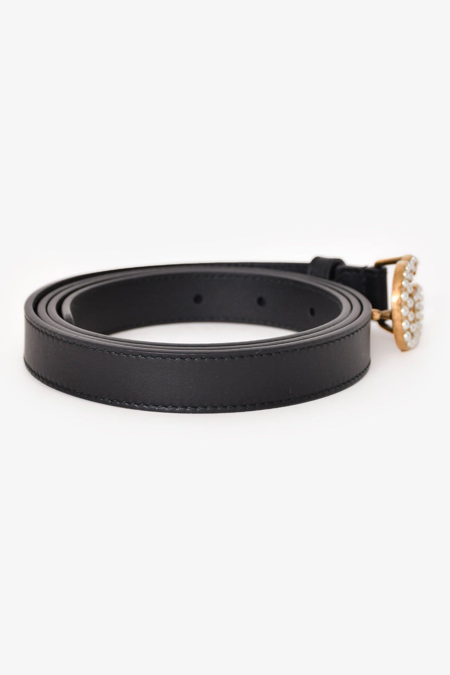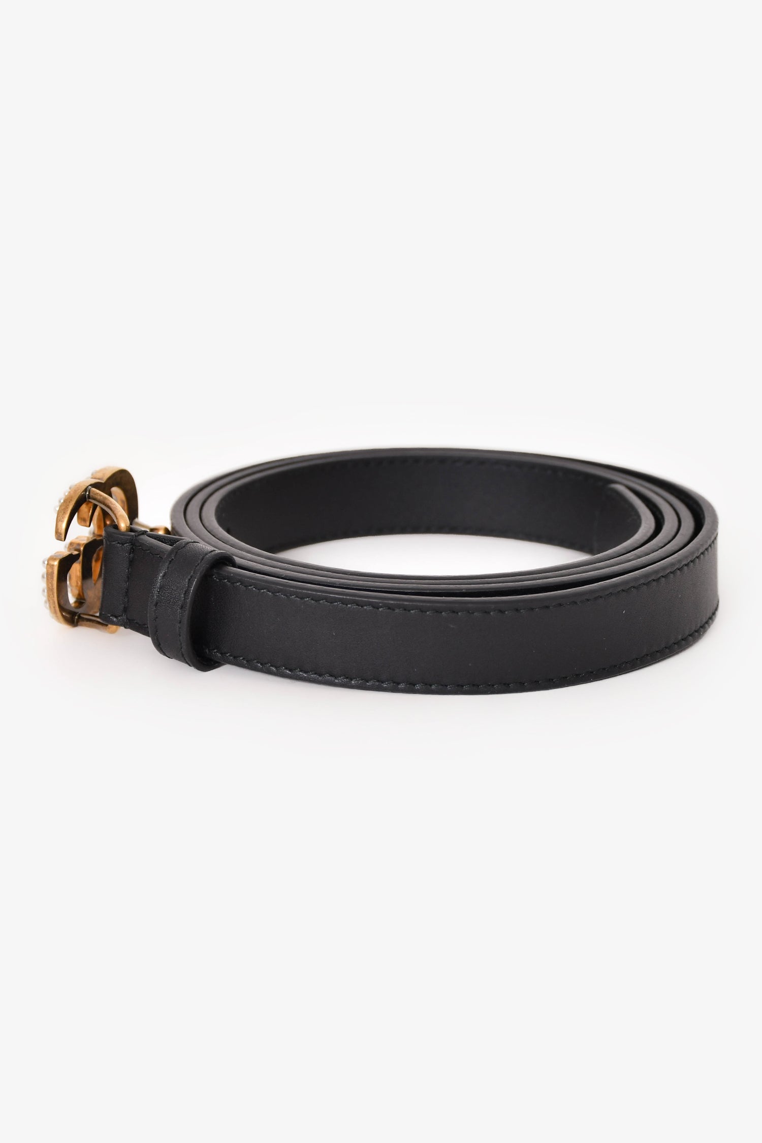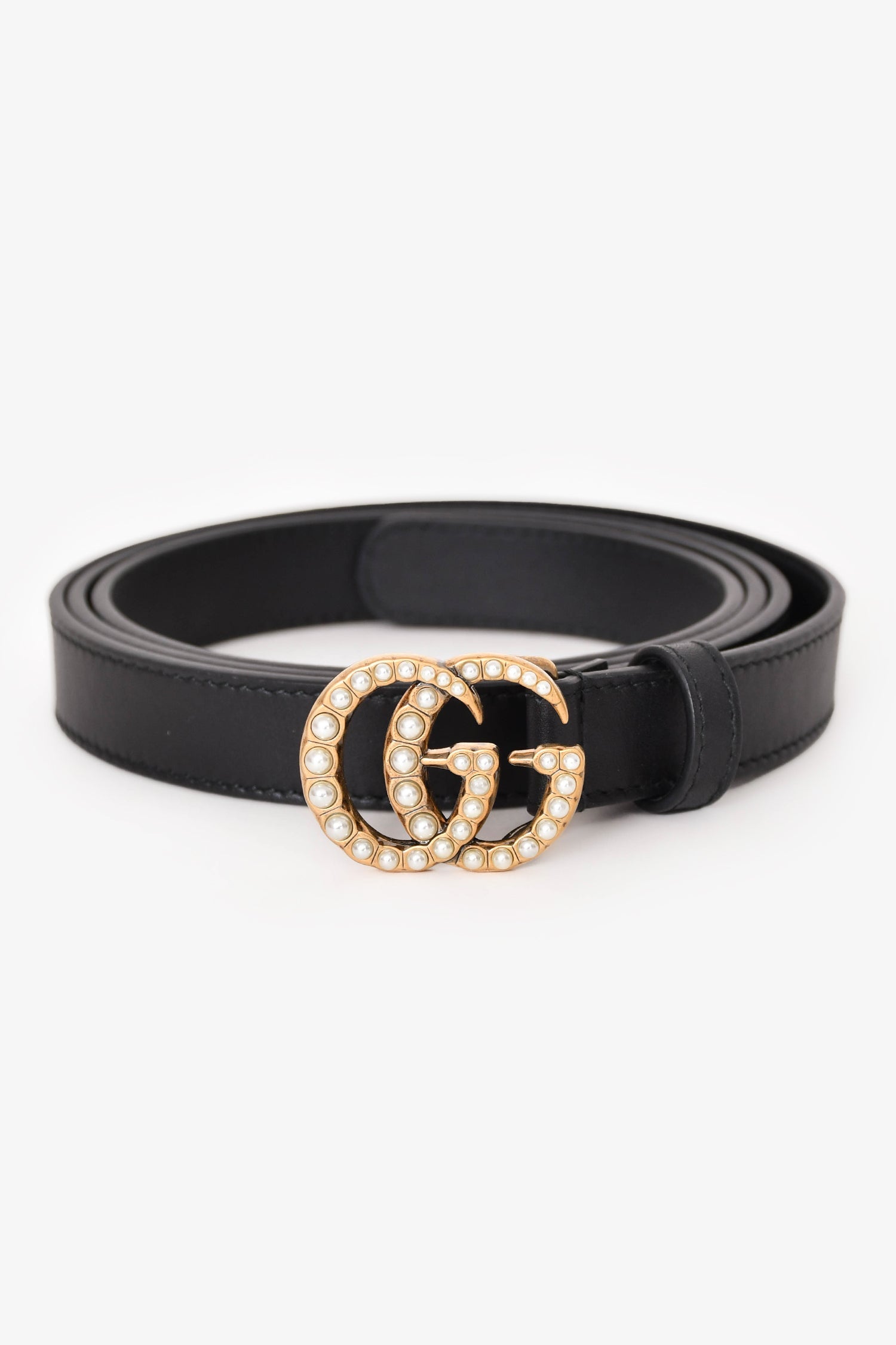 Gucci Black Leather Pearl GG Thin Marmont Belt. Adjustable, anchor buckle closure. Gold-tone hardware. Tonal stitching.