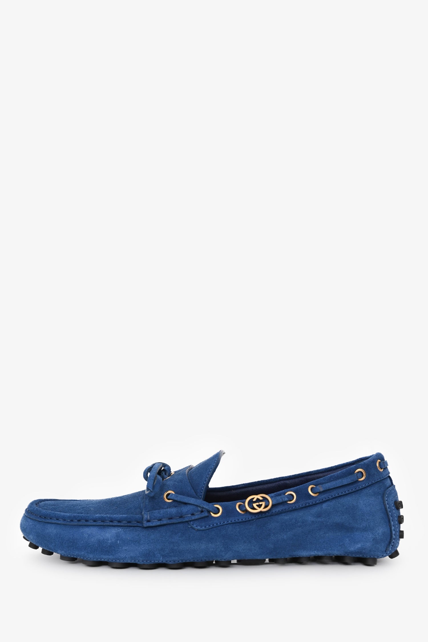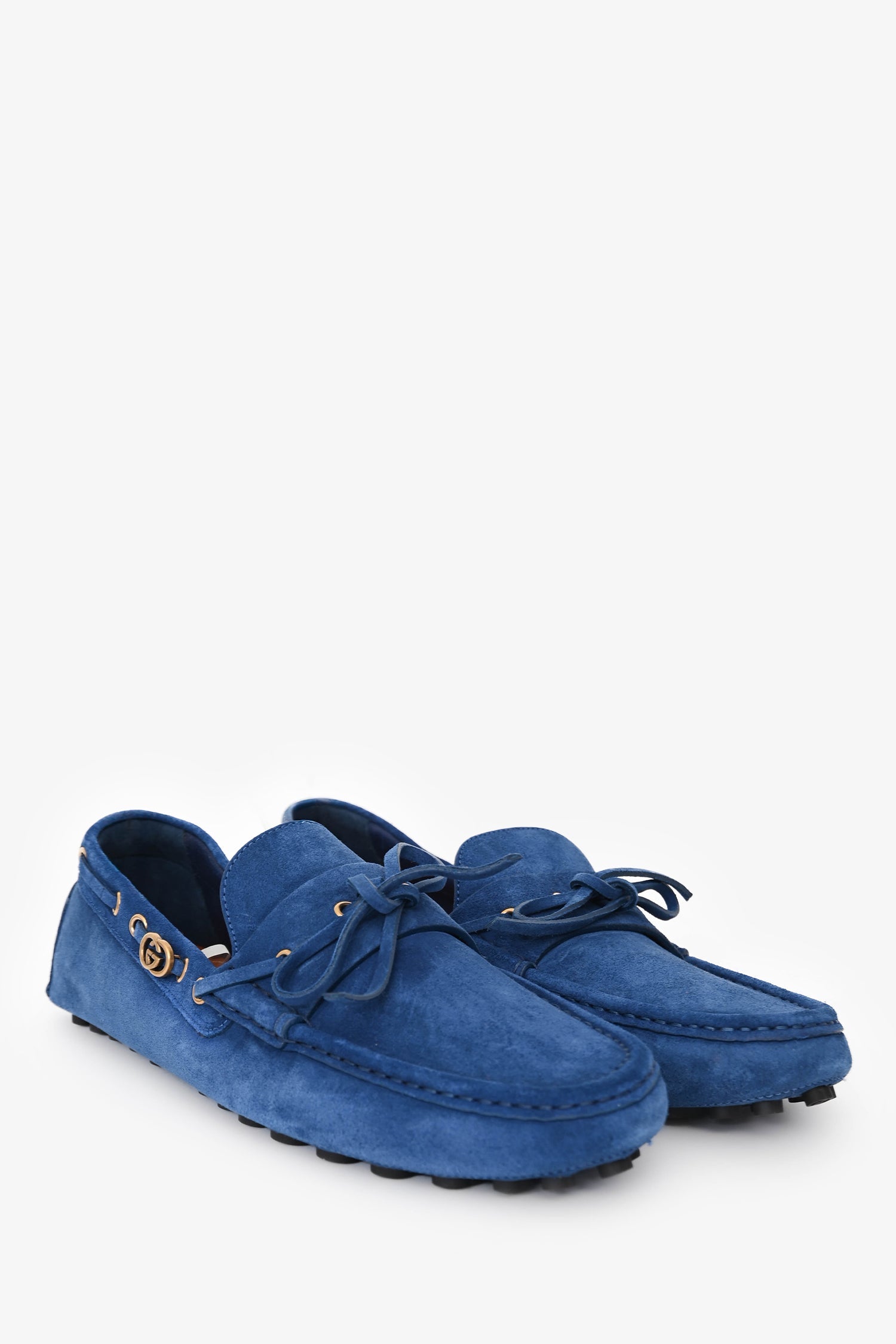 Gucci Blue Suede GG Driving Loafers. Slip-on. Round toe. Tie detailing in the front. Gold-tone hardware. Tonal stitching.