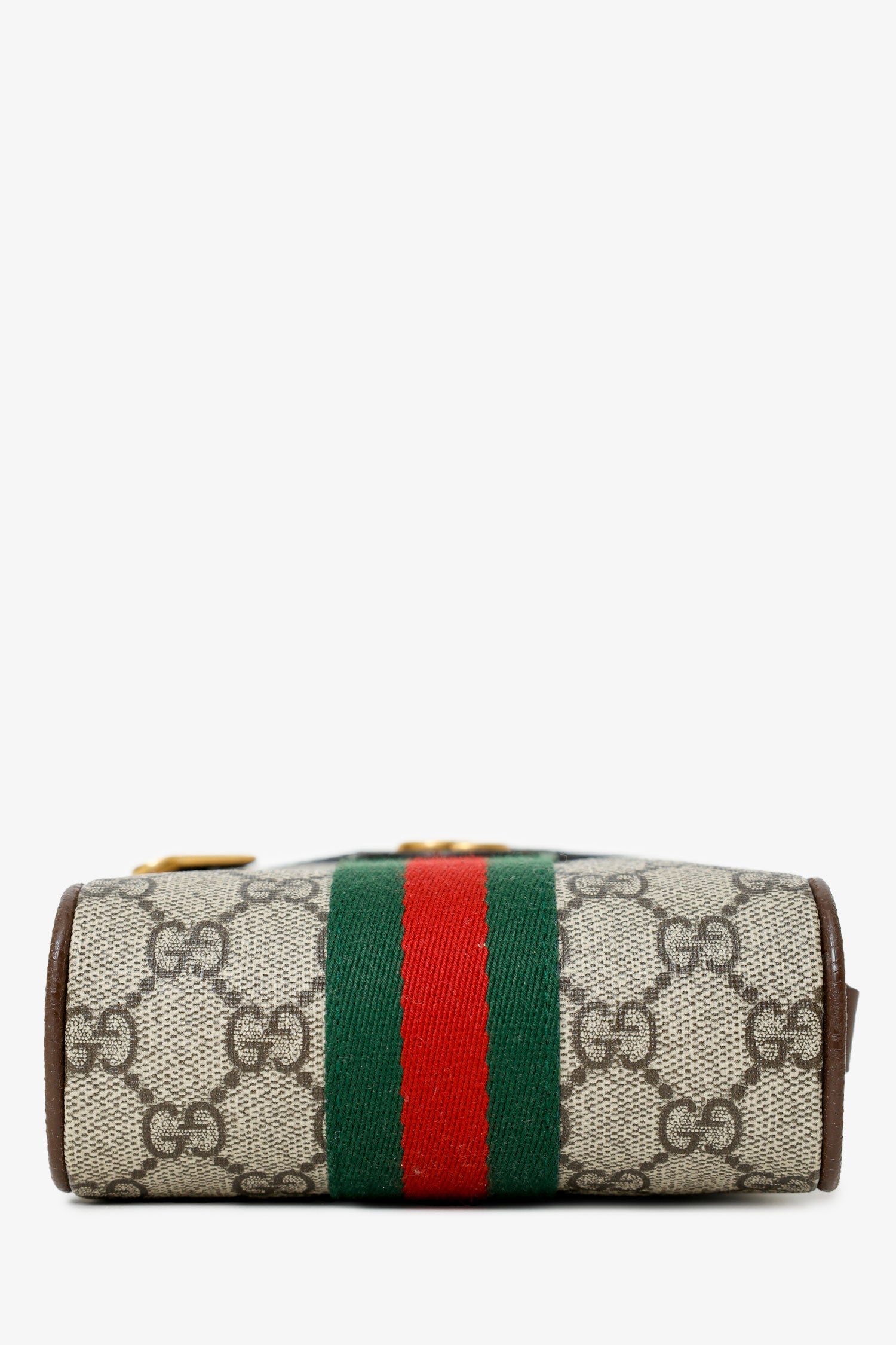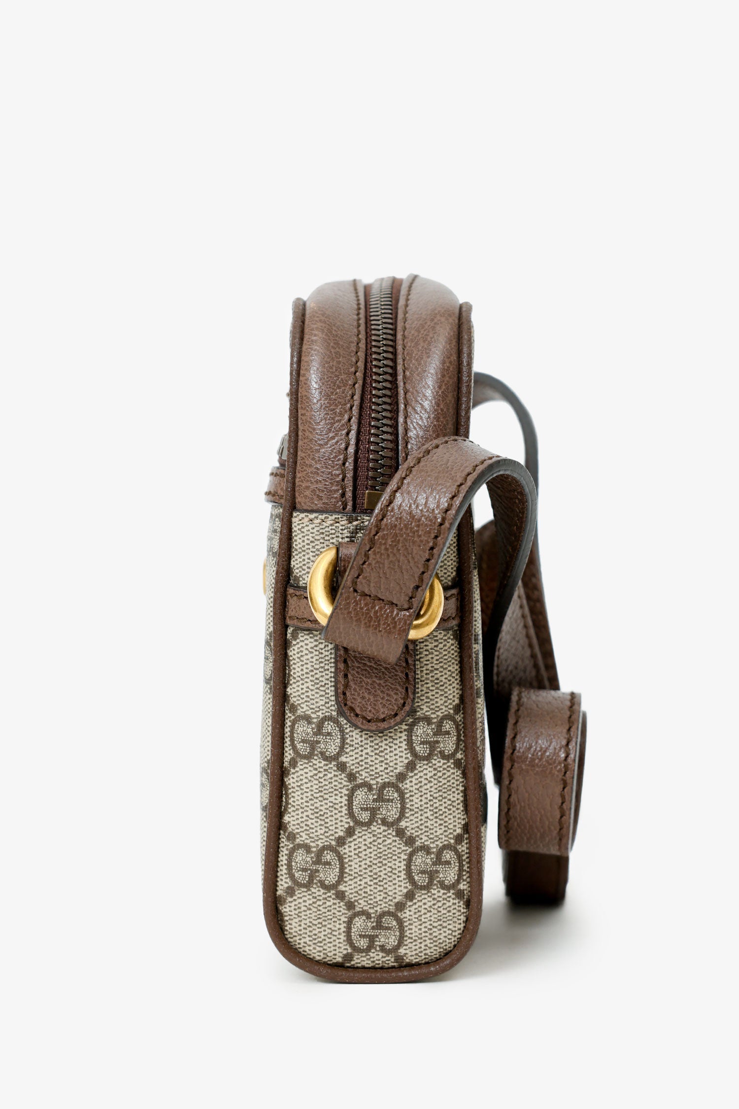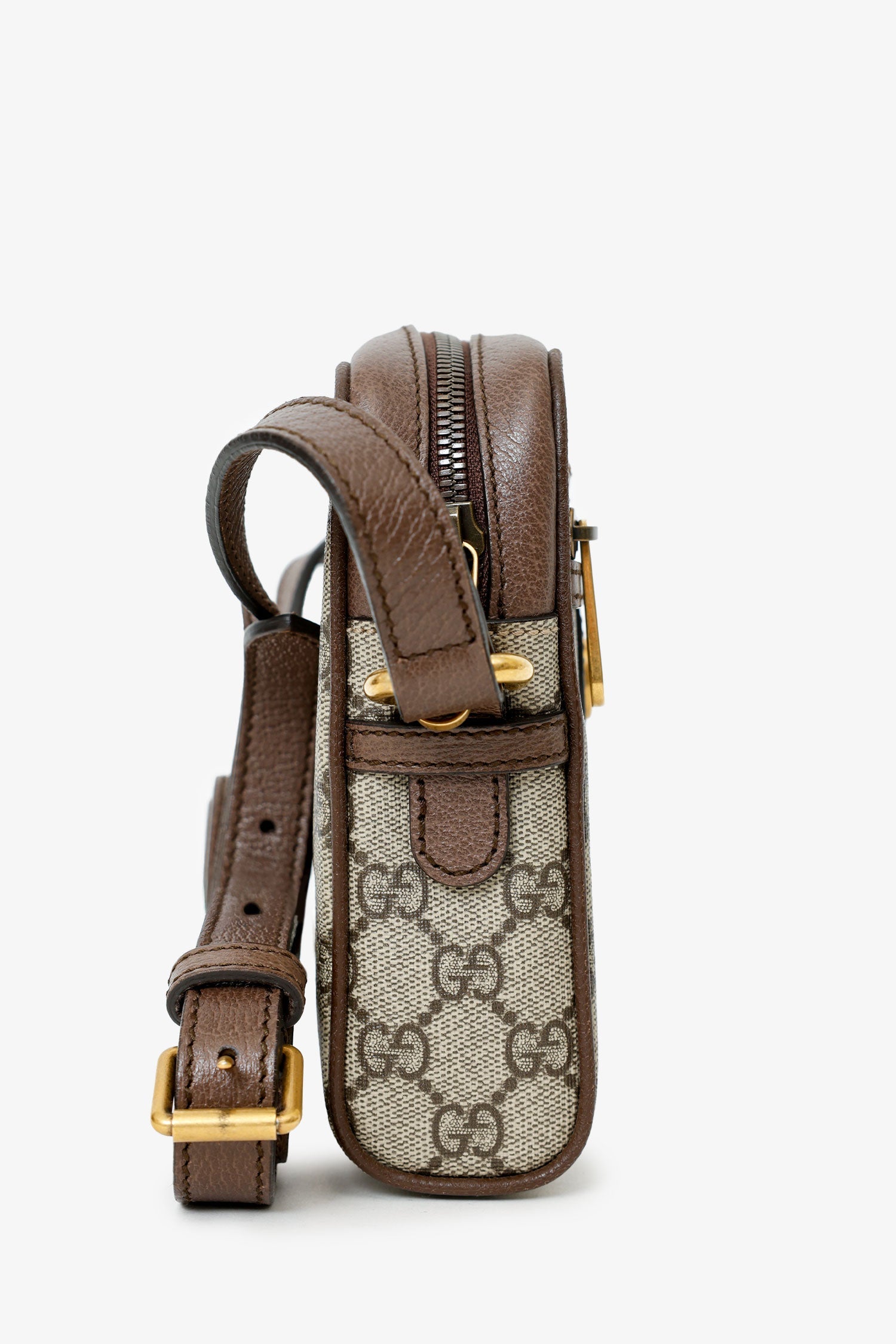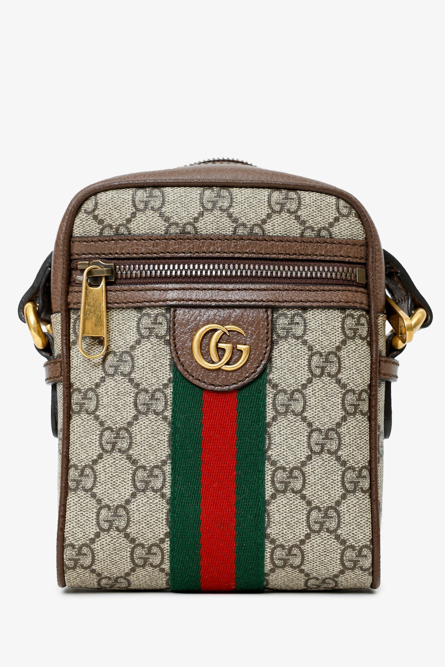 Gucci Brown Mini GG Supreme Ophidia Messenger Bag. Top zip closure. Leather crossbody strap with adjustable pull-through push-pin closure. Single exterior zip-up pocket. Lined interior. Brass-tone hardware. Tonal stitching.
