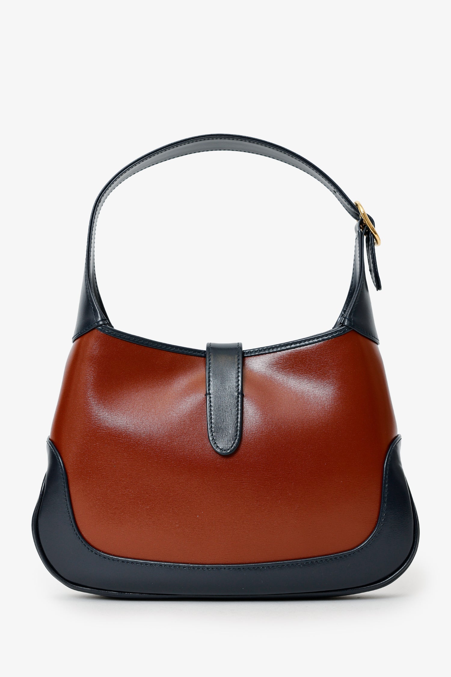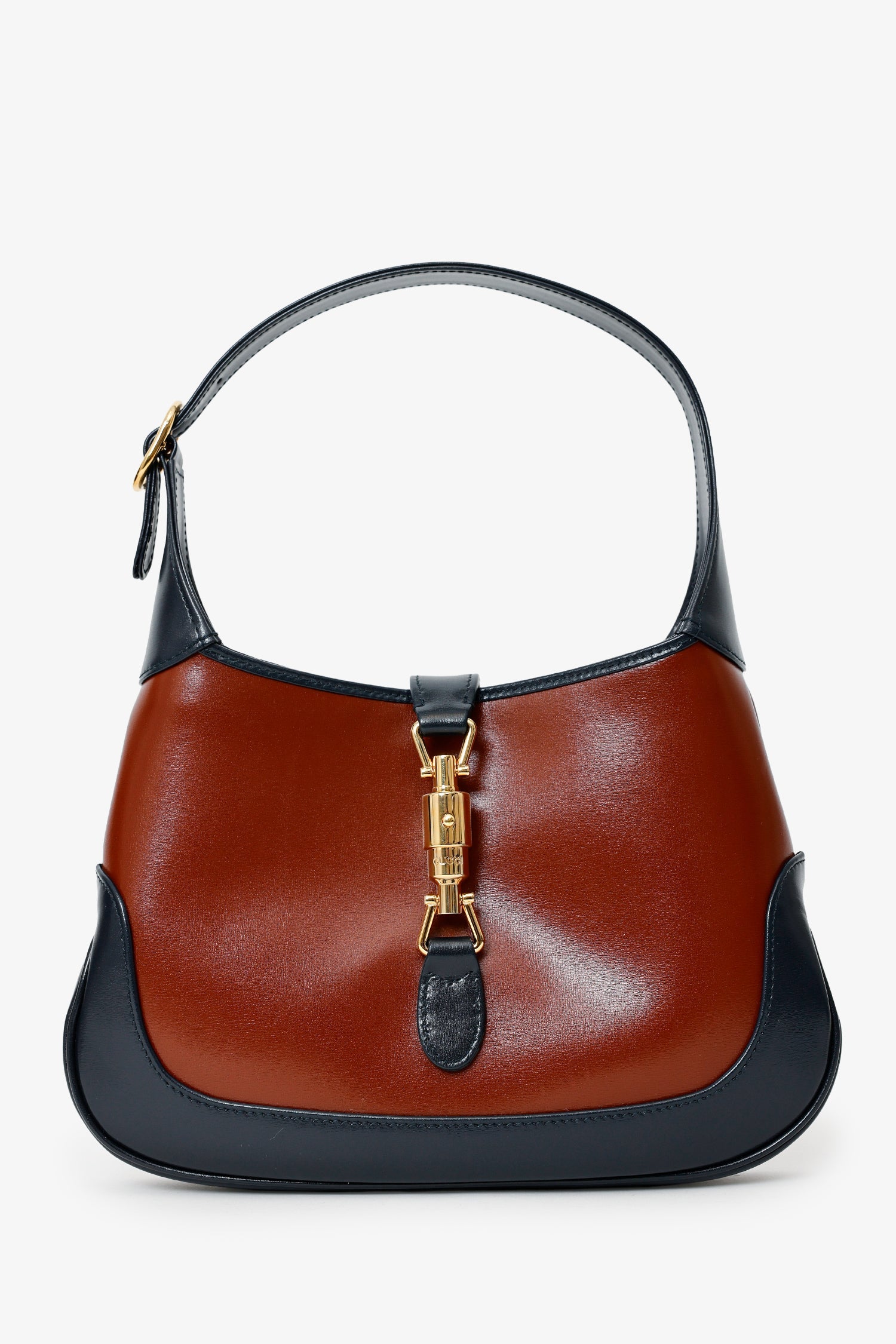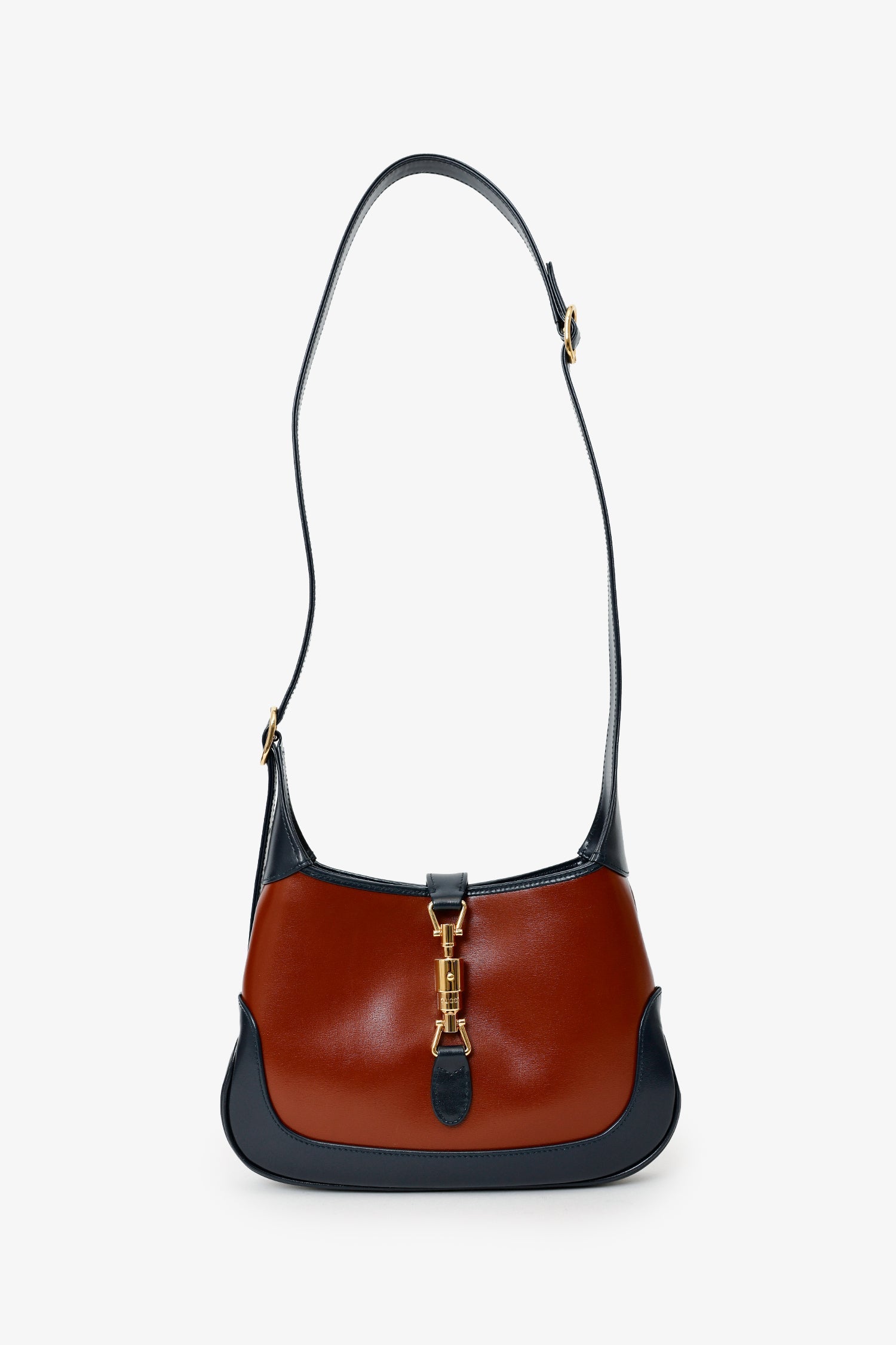 Gucci Burgundy/Navy Leather Small Jackie 1961 Hobo Shoulder Bag With Strap. Front fold-over flap with push-lock closure. Shoulder strap with adjustable pull-through buckle closure. Additional leather strap to extended shoulder strap to be crossbody. Lined interior. with 2 pockets; 1 slip, and 1 zip-up. Gold-tone hardware. Tonal stitching.