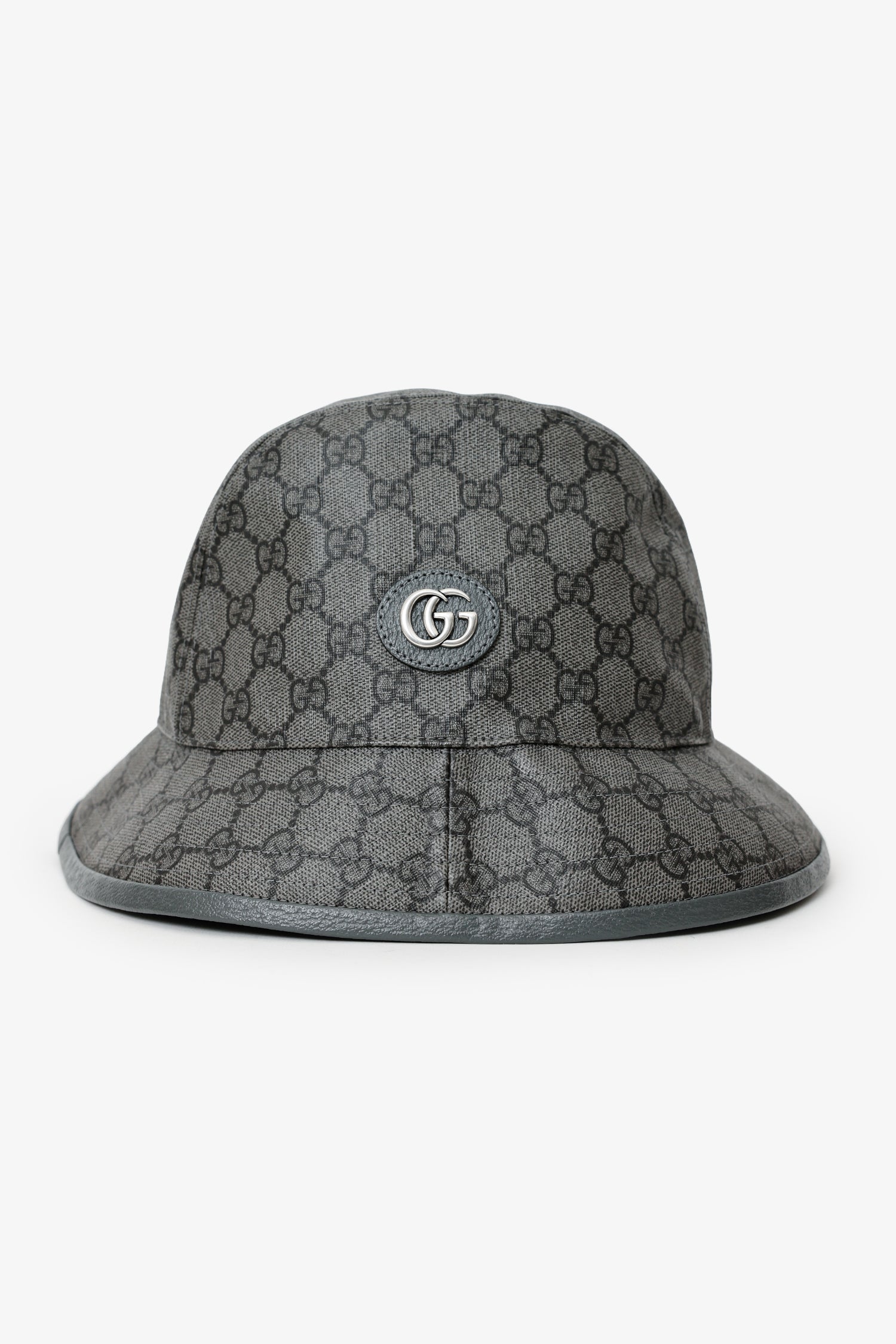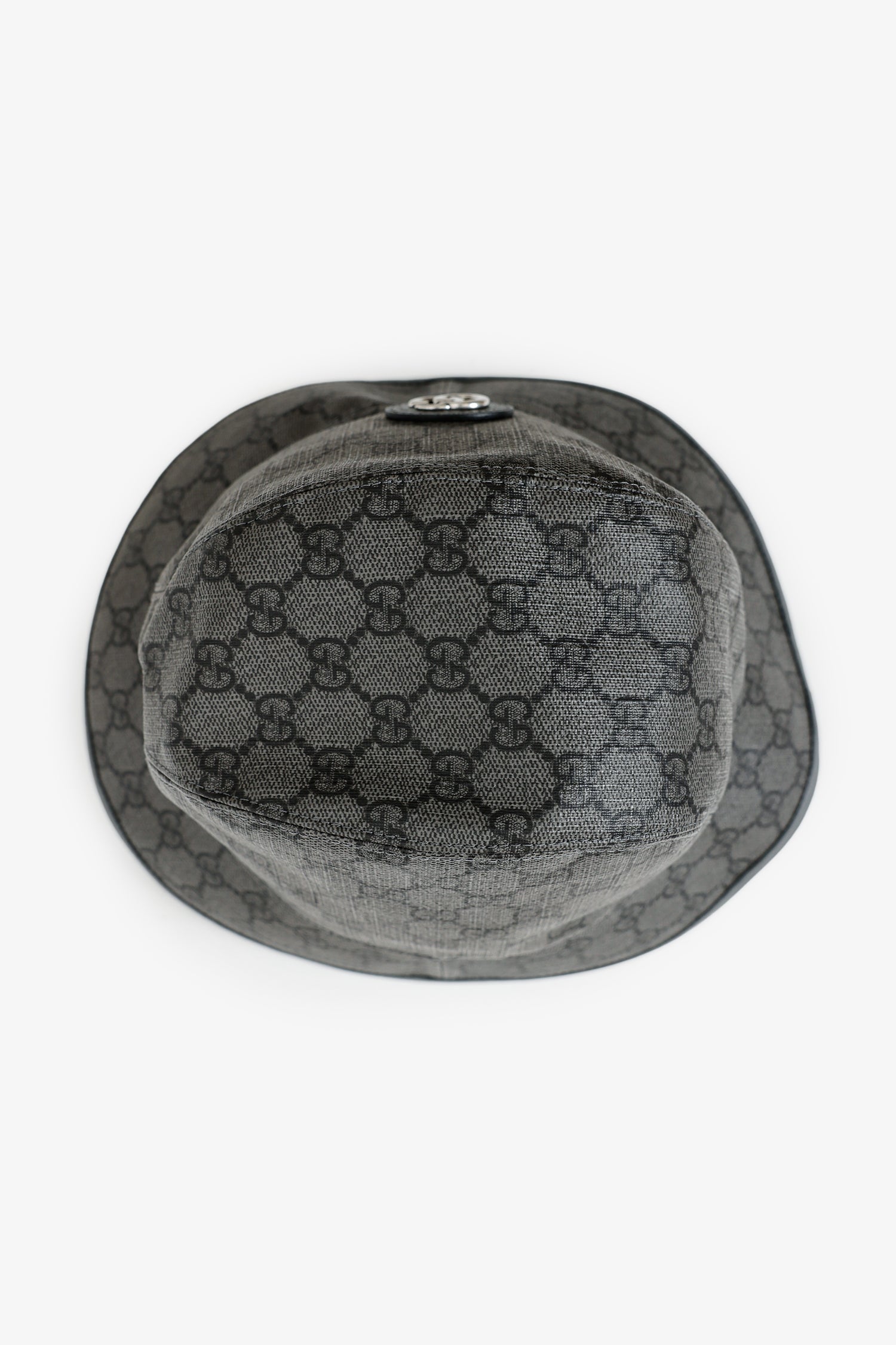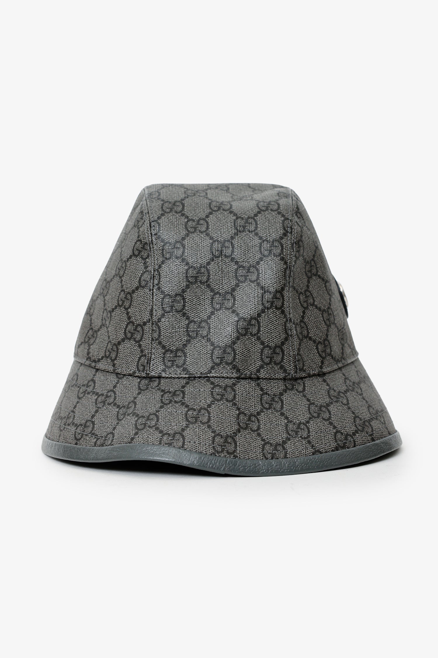 Gucci Gray GG Supreme Bucket Hat. Lined interior. Silver-tone hardware. Tonal stitching.