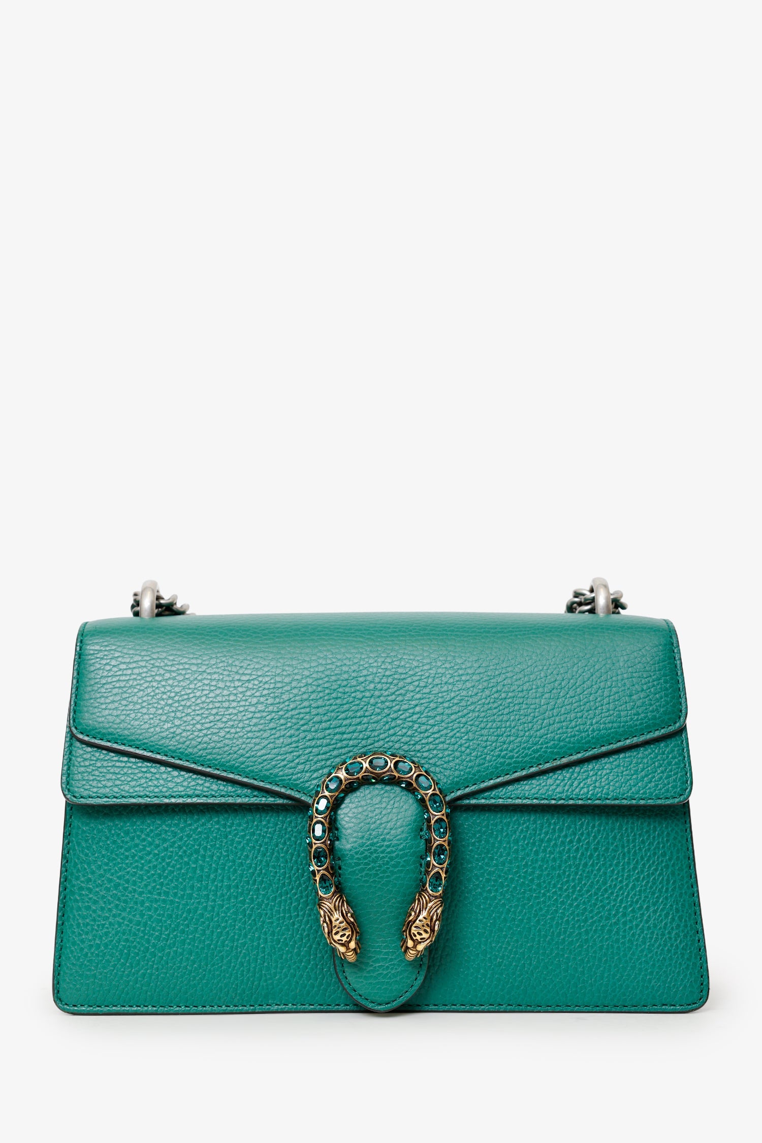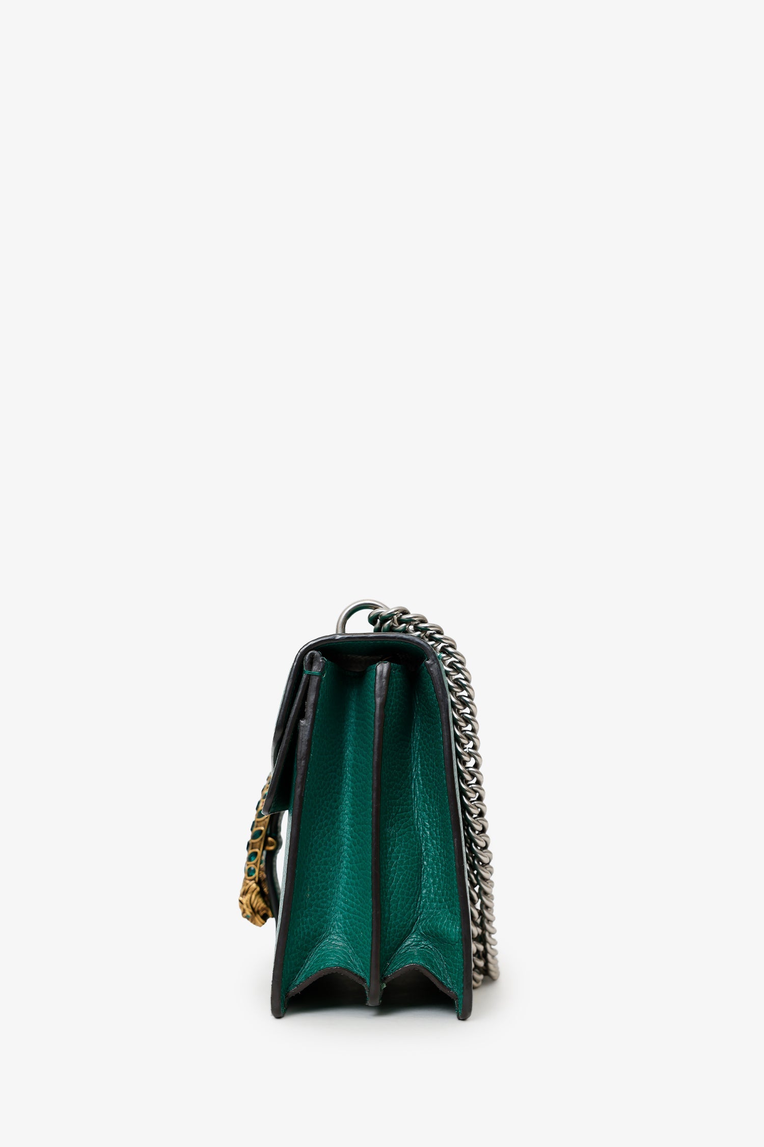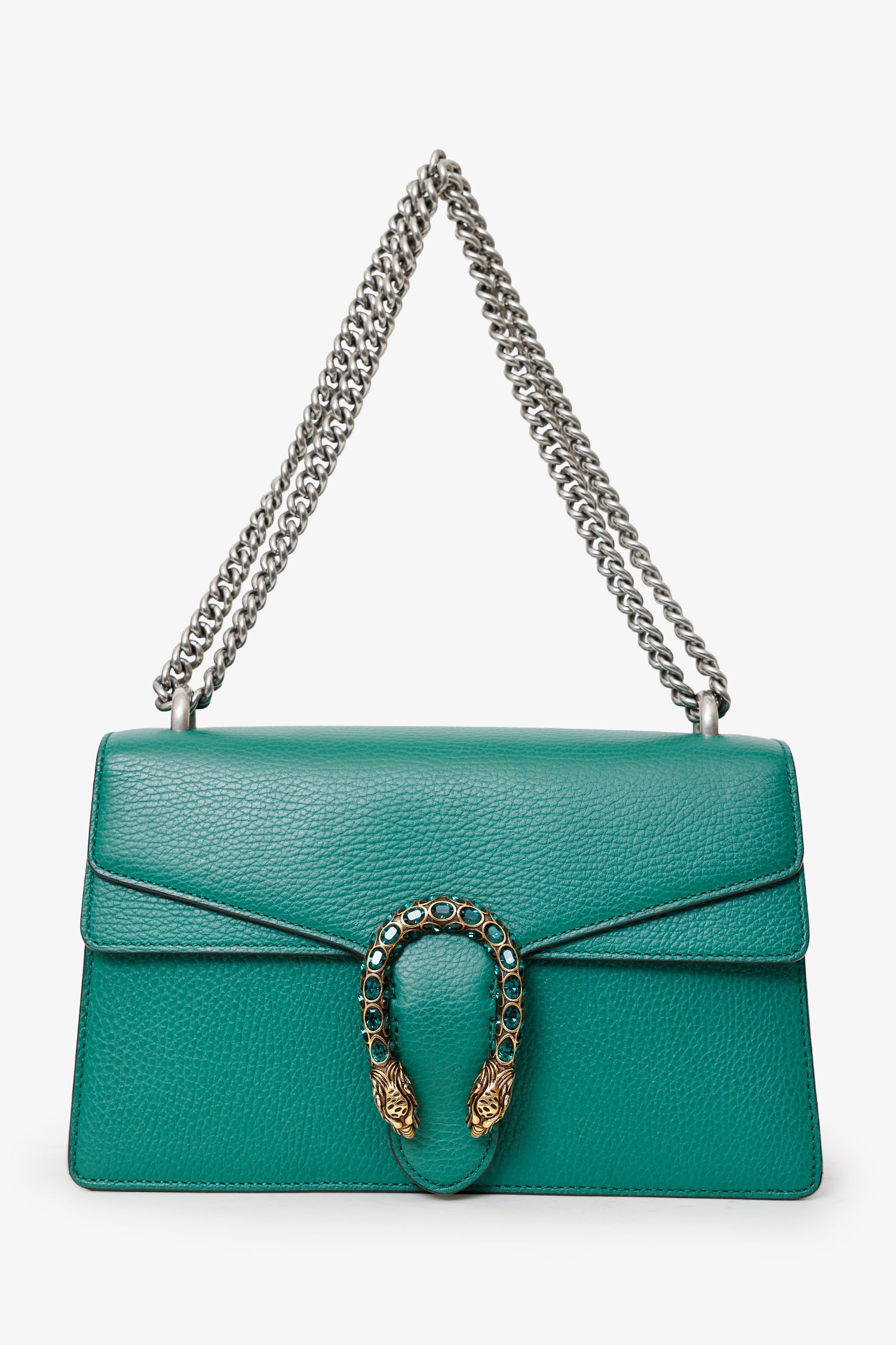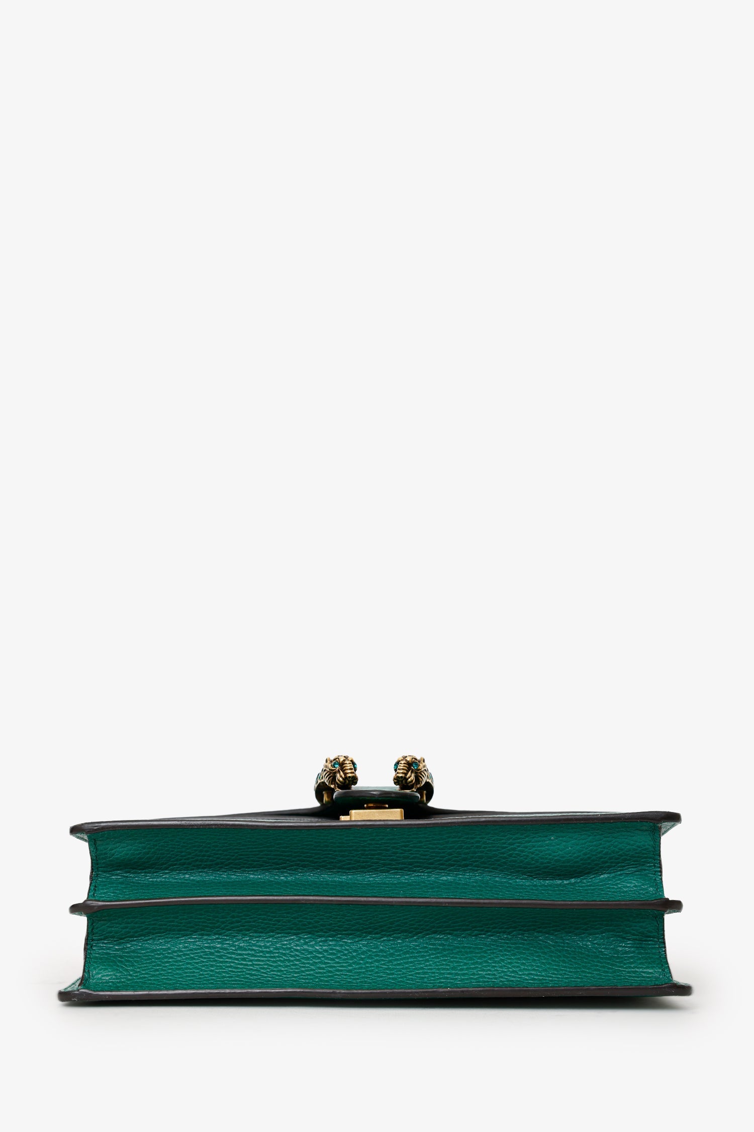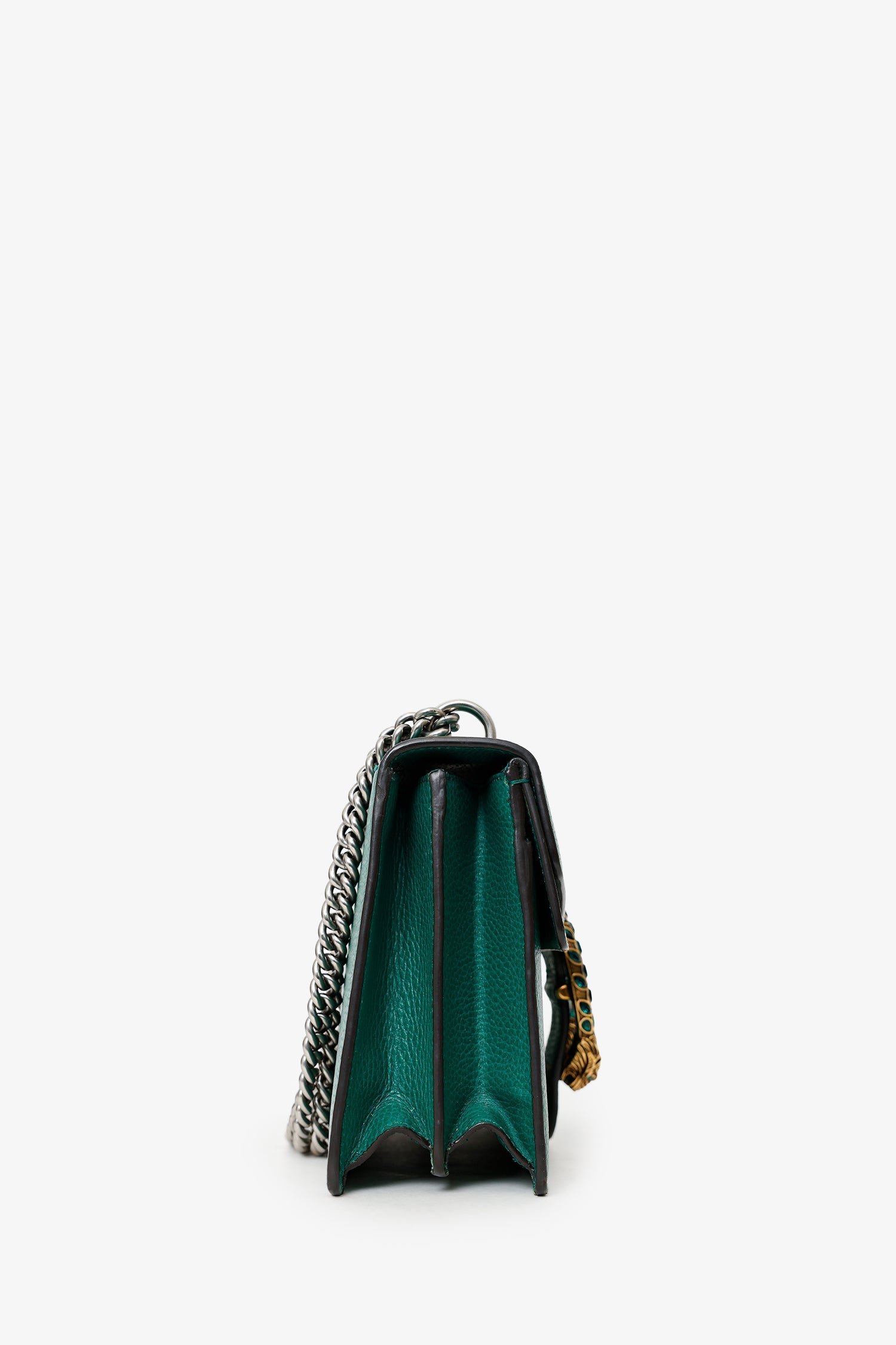 Gucci Green Leather Dionysus Medium Shoulder Bag. Front-fold-over-flap with push-clasp closure. Chain link shoulder strap. Lined interior with 4 pockets; 1 front-fold-over-flap, 2 slip, and 1 zip-up. Gold and silver-tone hardware. Tonal stitching.