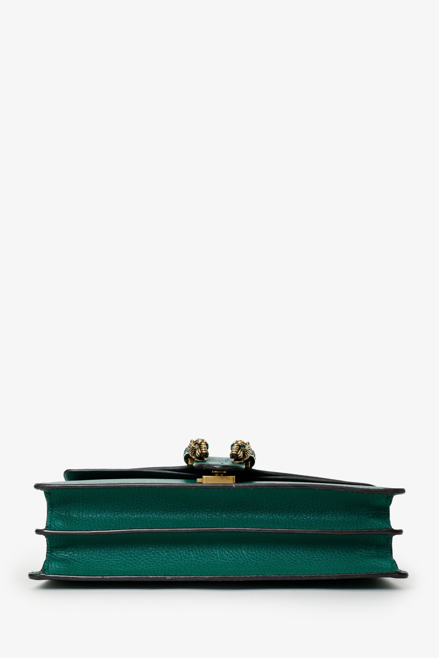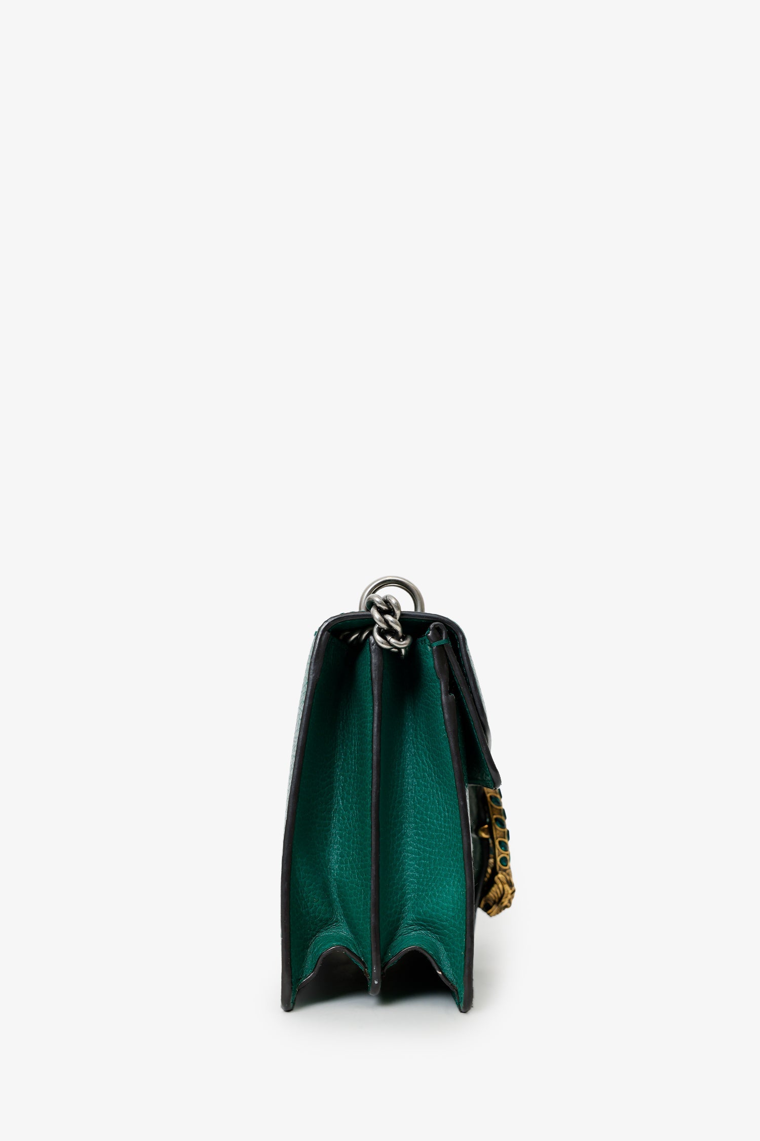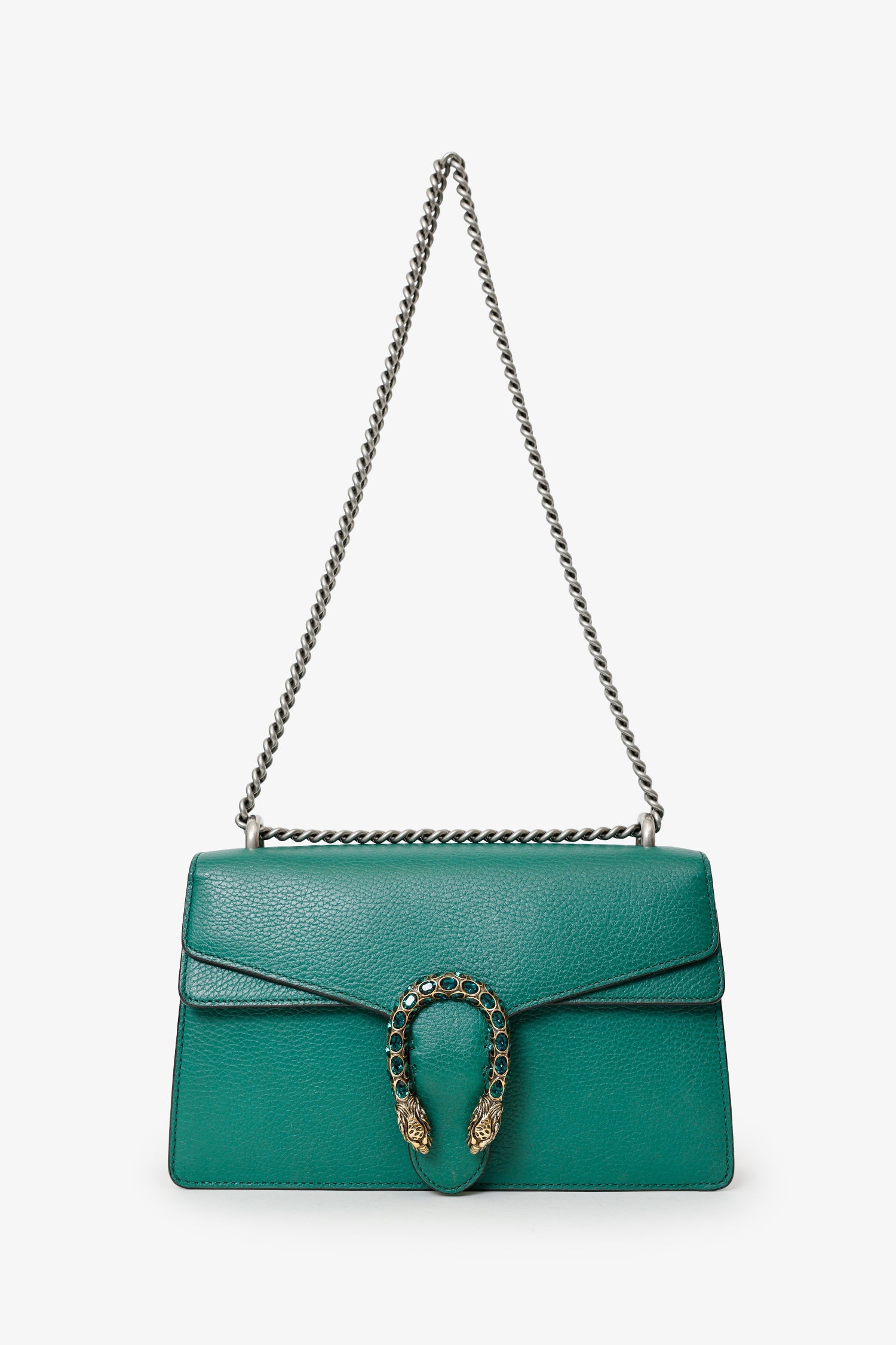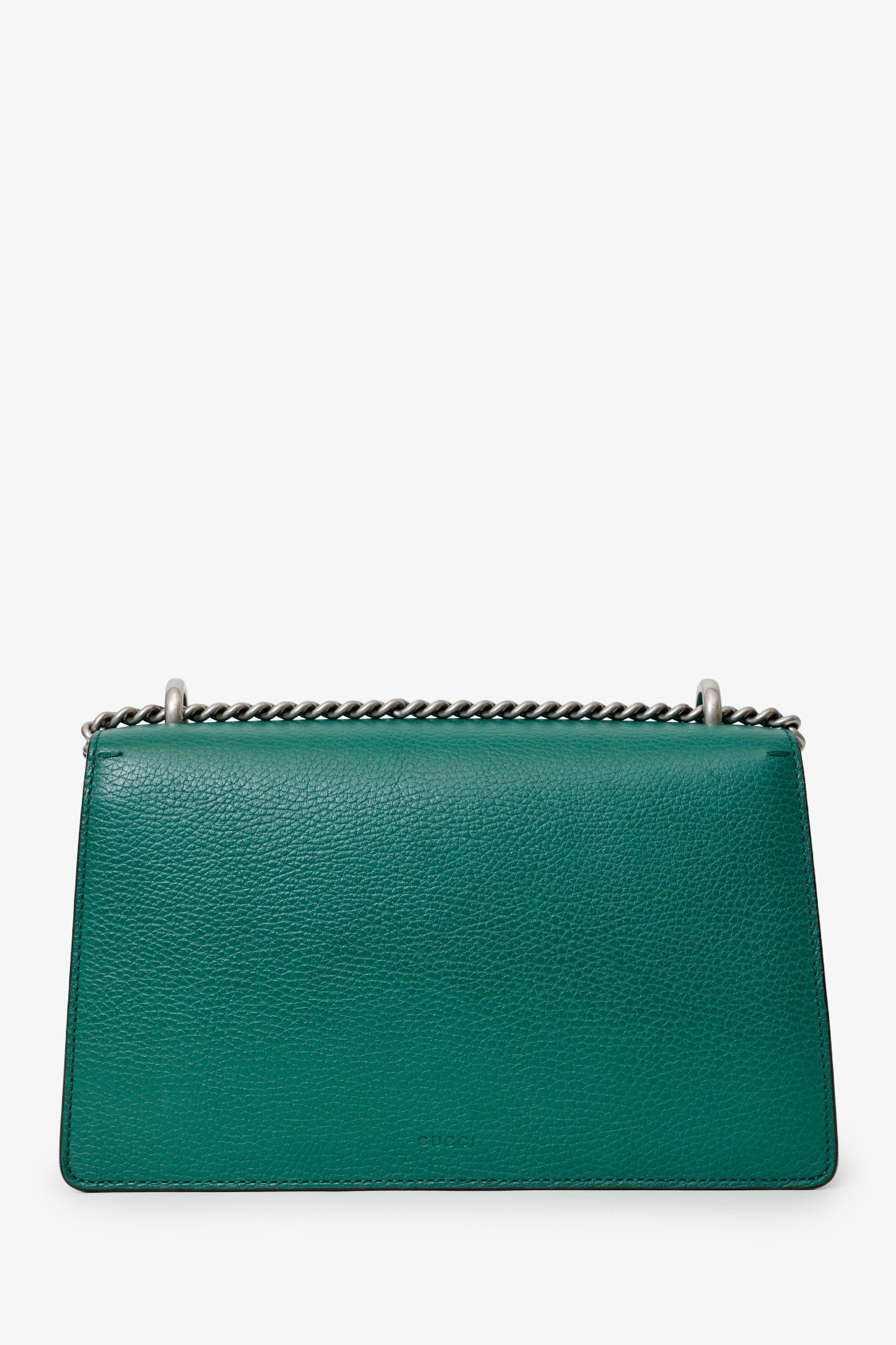 Gucci Green Leather Dionysus Medium Shoulder Bag. Front fold-over flap with push-clasp closure. Chain link shoulder strap. Lined interior with 4 pockets; 1 front-fold-over-flap, 2 slip, and 1 zip-up. Gold and silver-tone hardware. Tonal stitching.