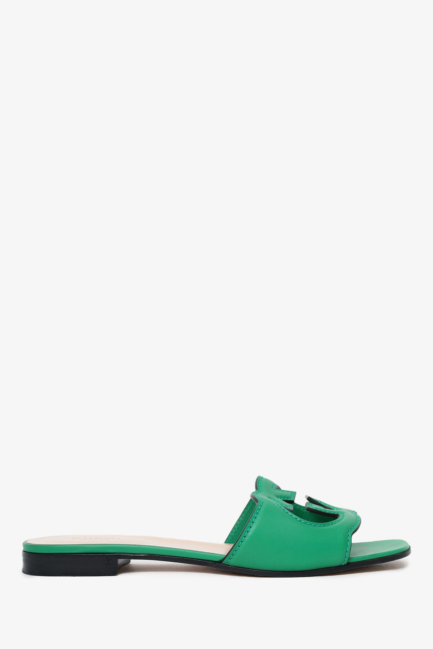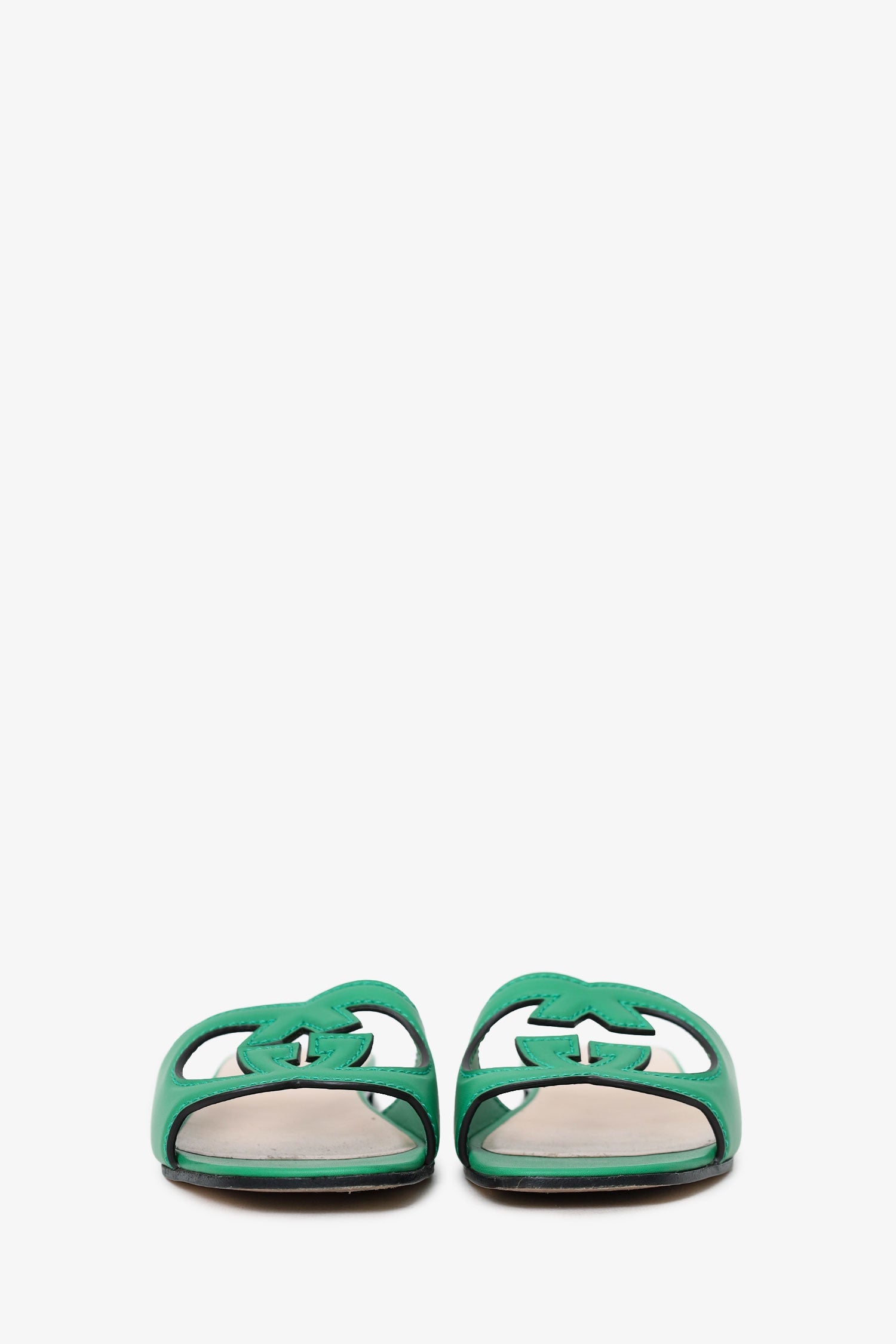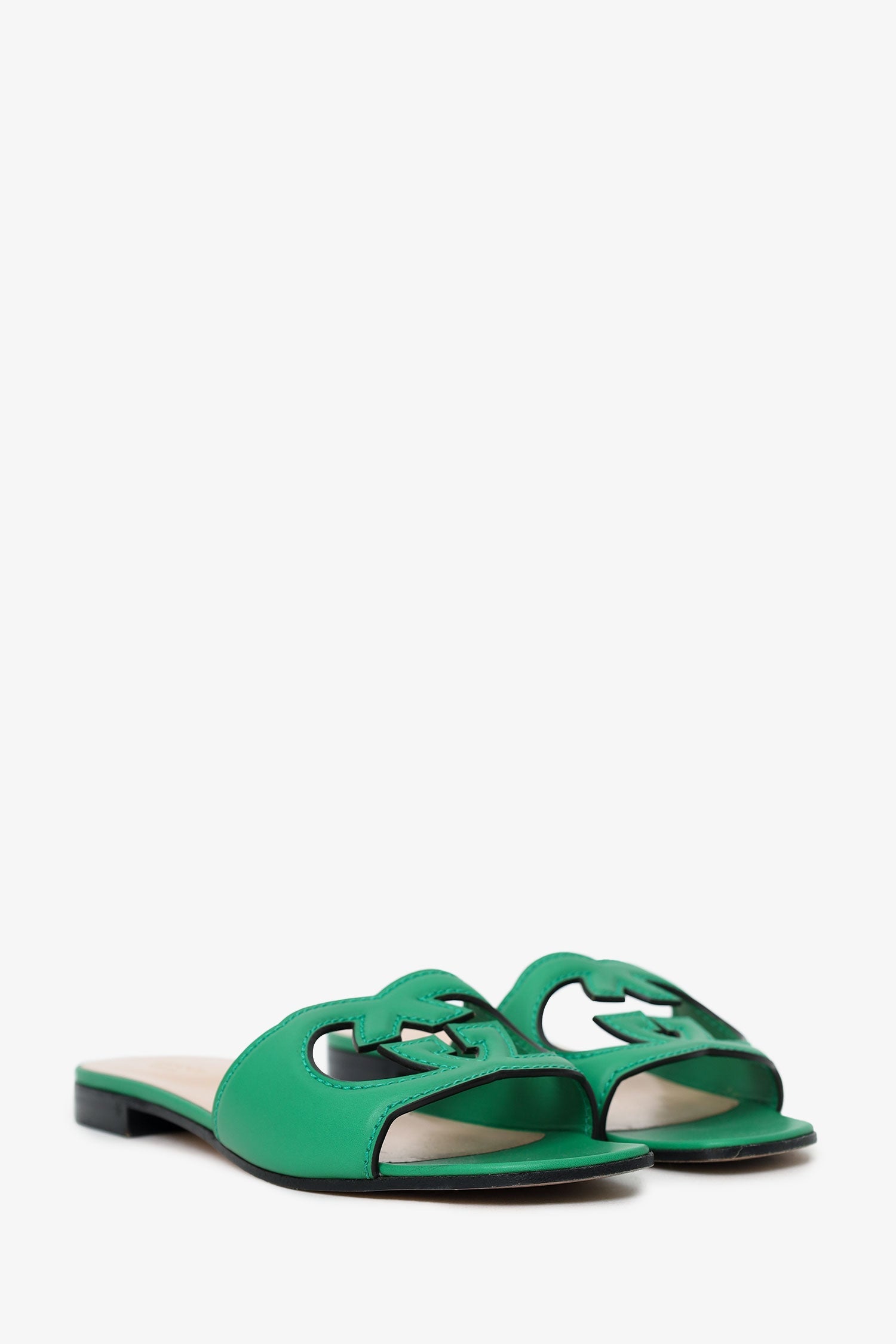 Gucci Green Leather Interlocking G Cut-Out Sandals. Slip-on. Rounded-square toe. Logo vamp. Tonal stitching.