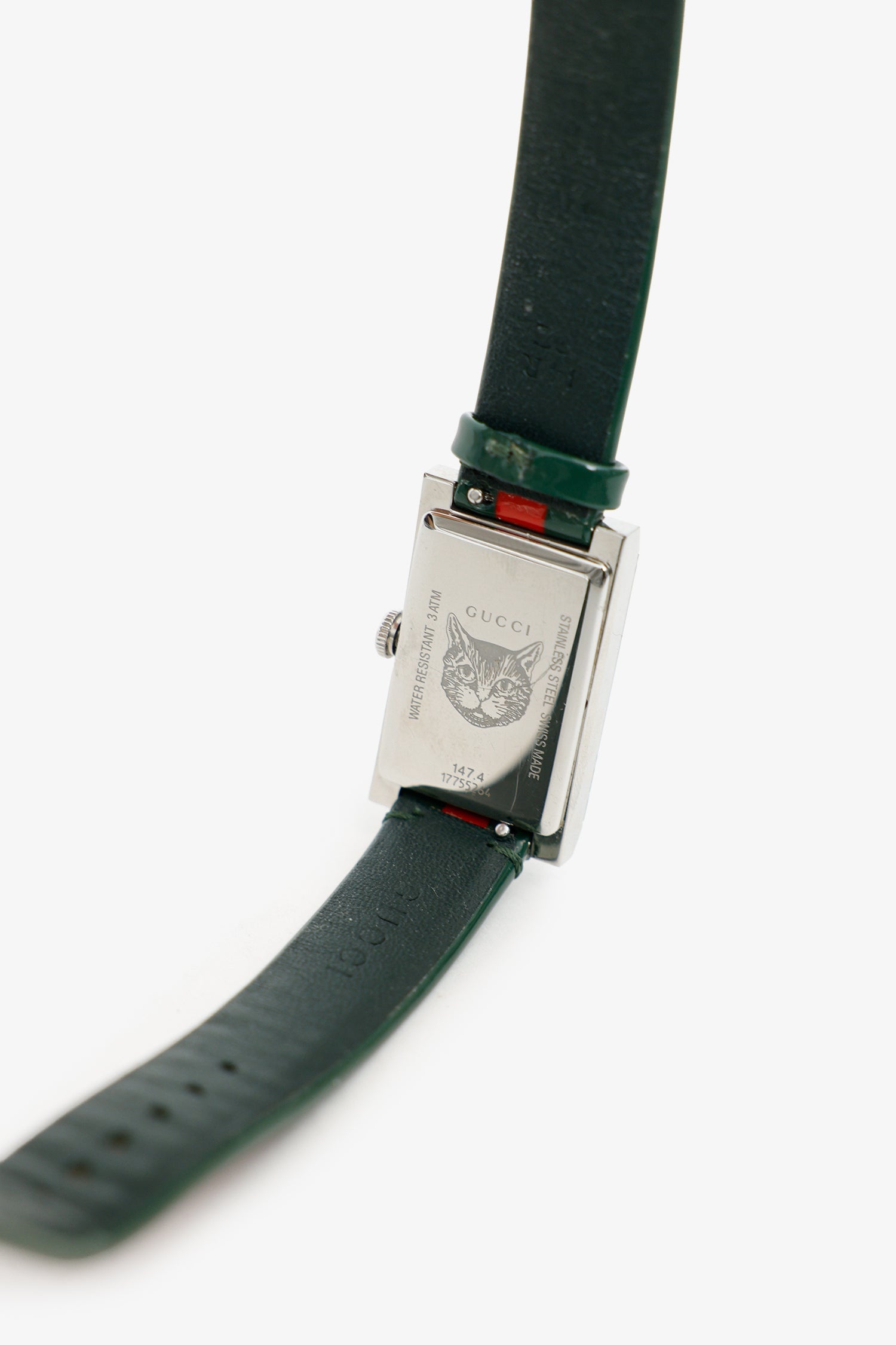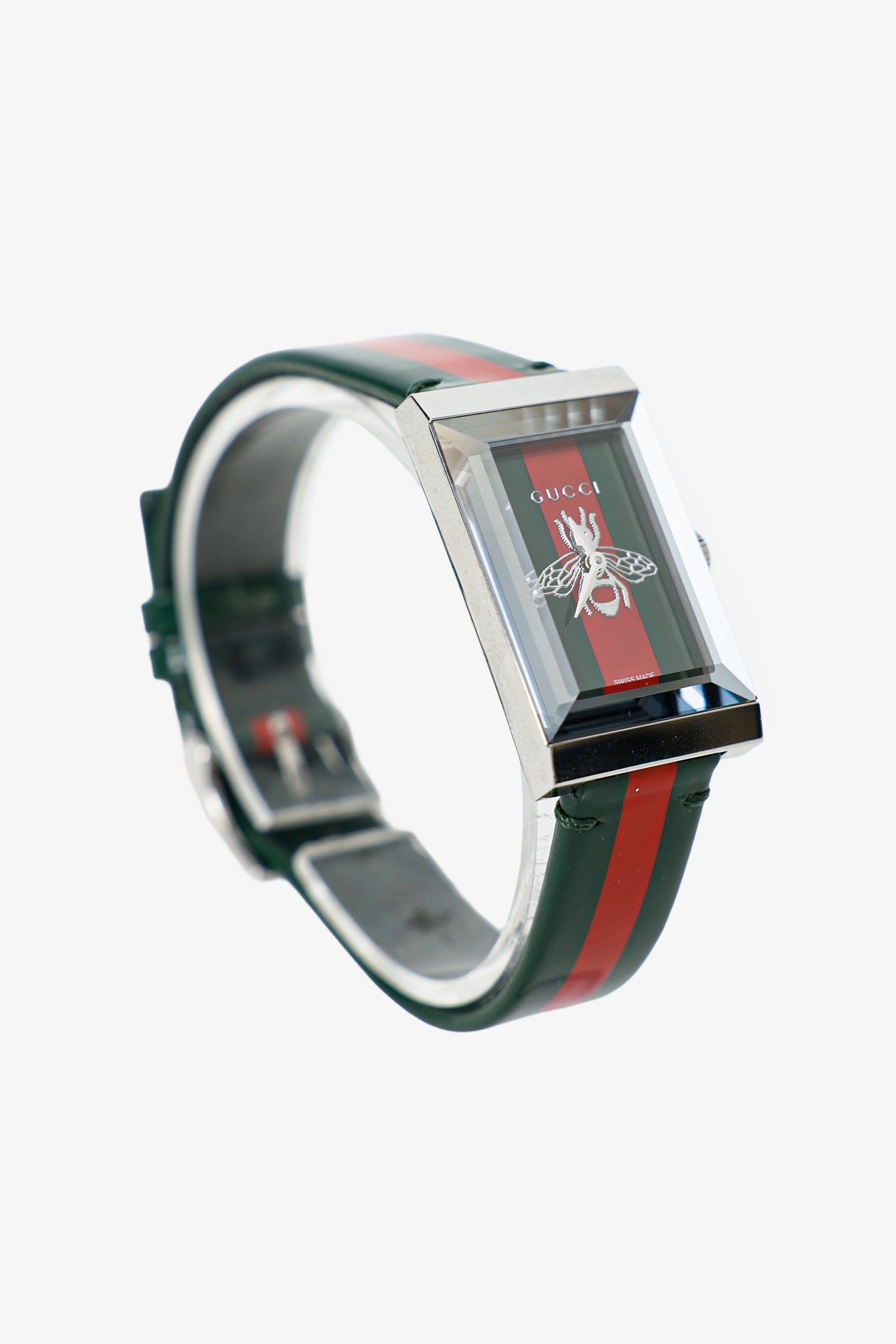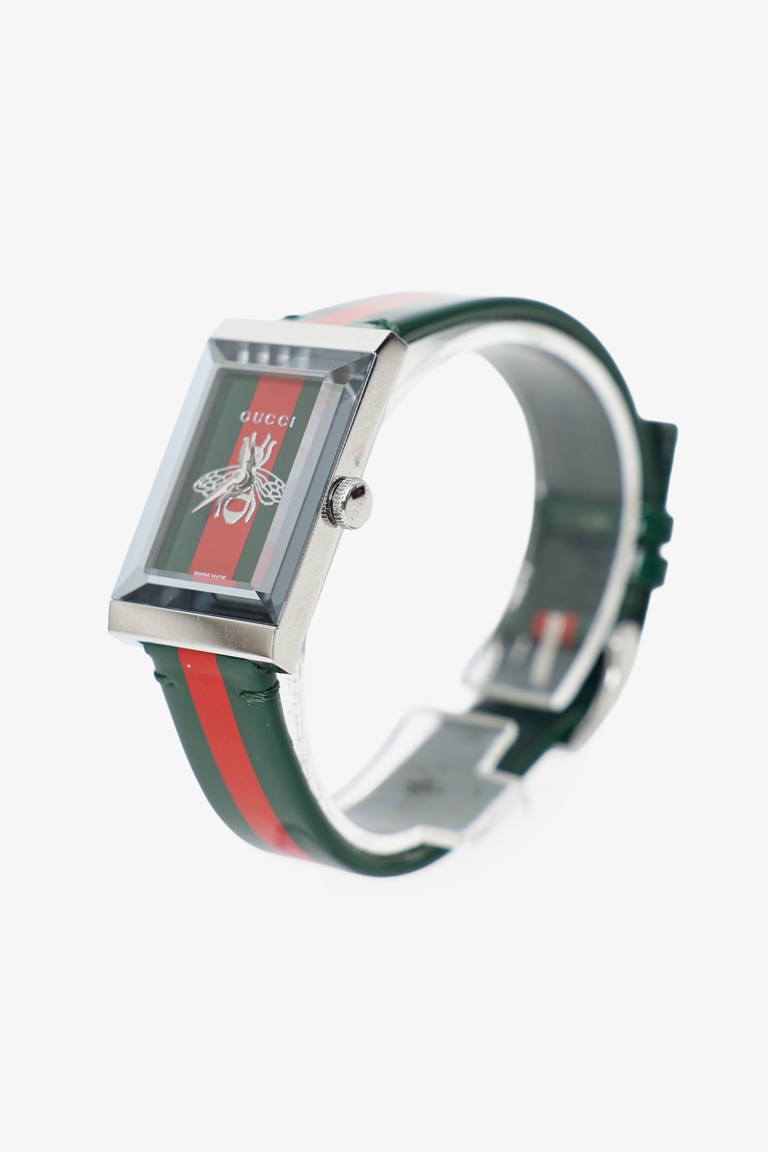 Gucci Green/Red Web G-Frame 21mm Watch. Rear adjustable pull-through buckle closure. Swiss made. Silver-tone hardware.