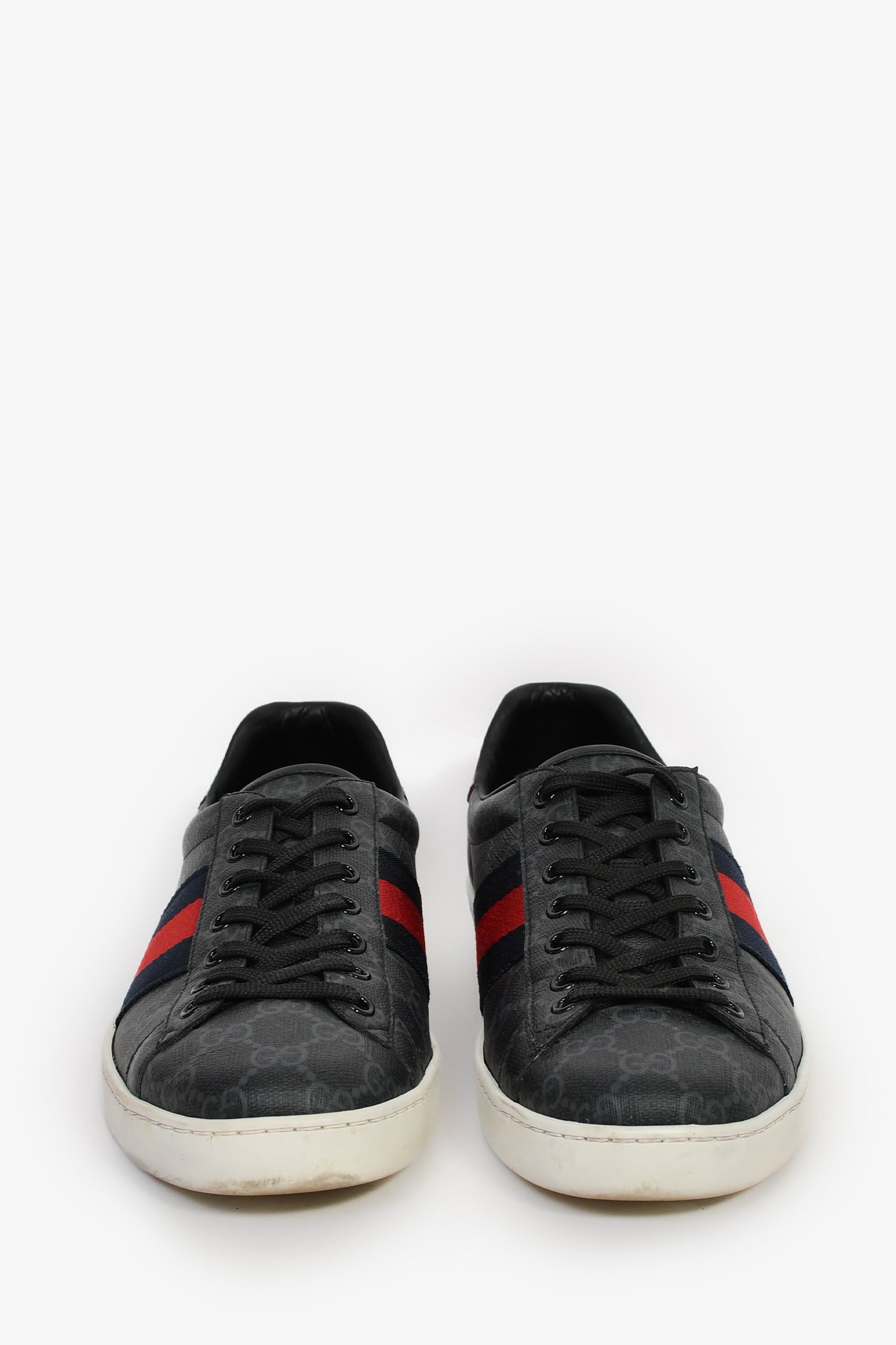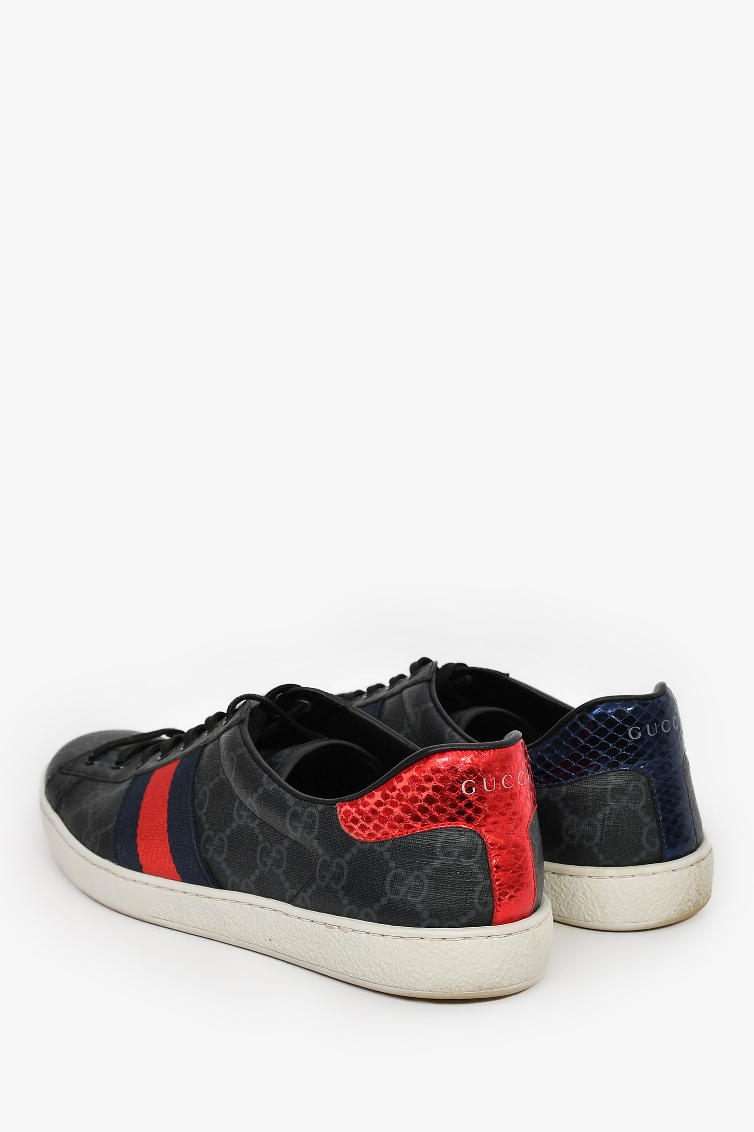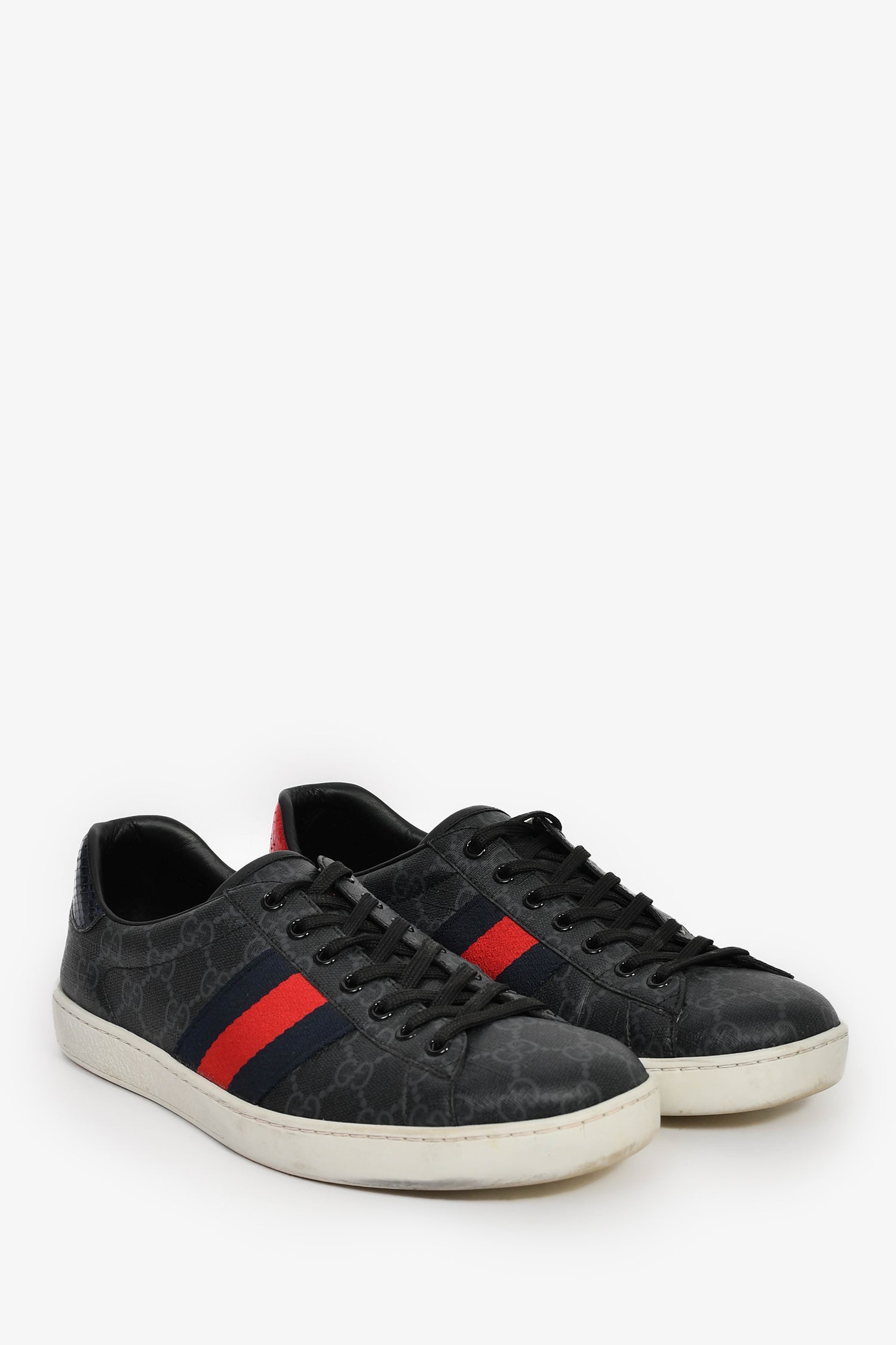 Gucci Grey Canvas GG Supreme Web Snake Embossed Detail 'Ace' Sneakers. Slip-on. Round toe. Lace-up closure. Tonal stitching.