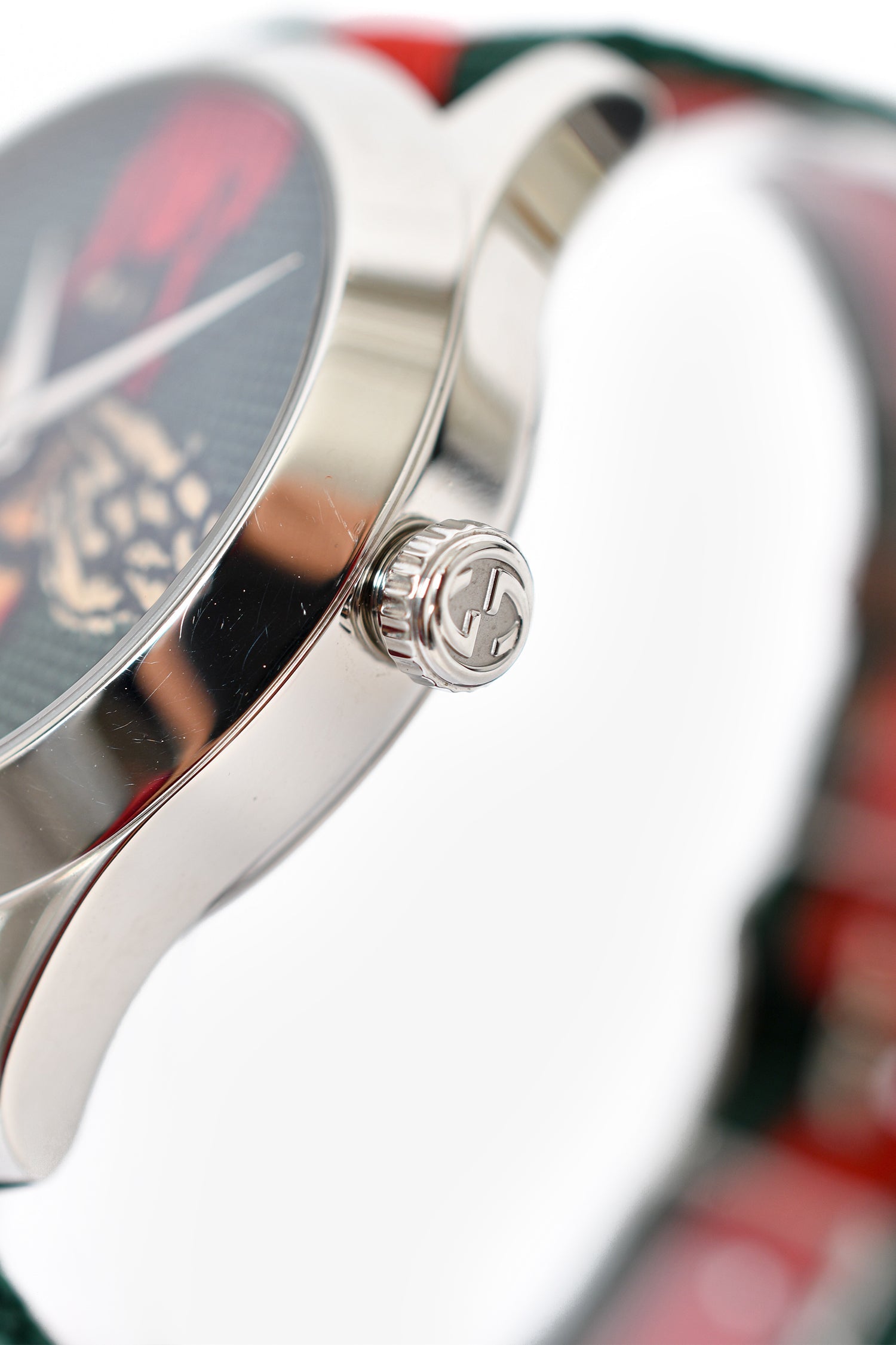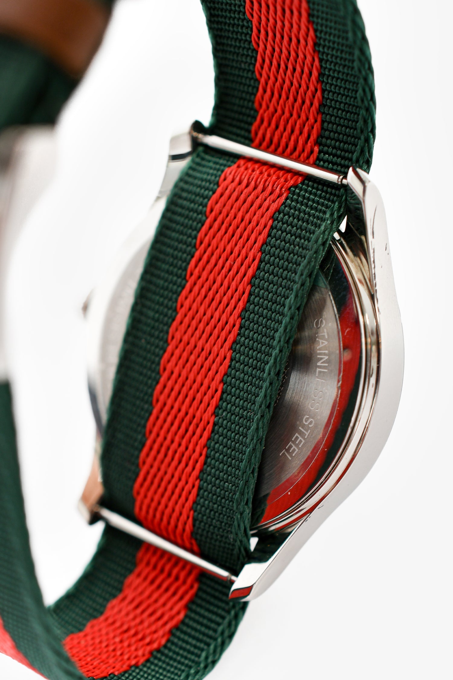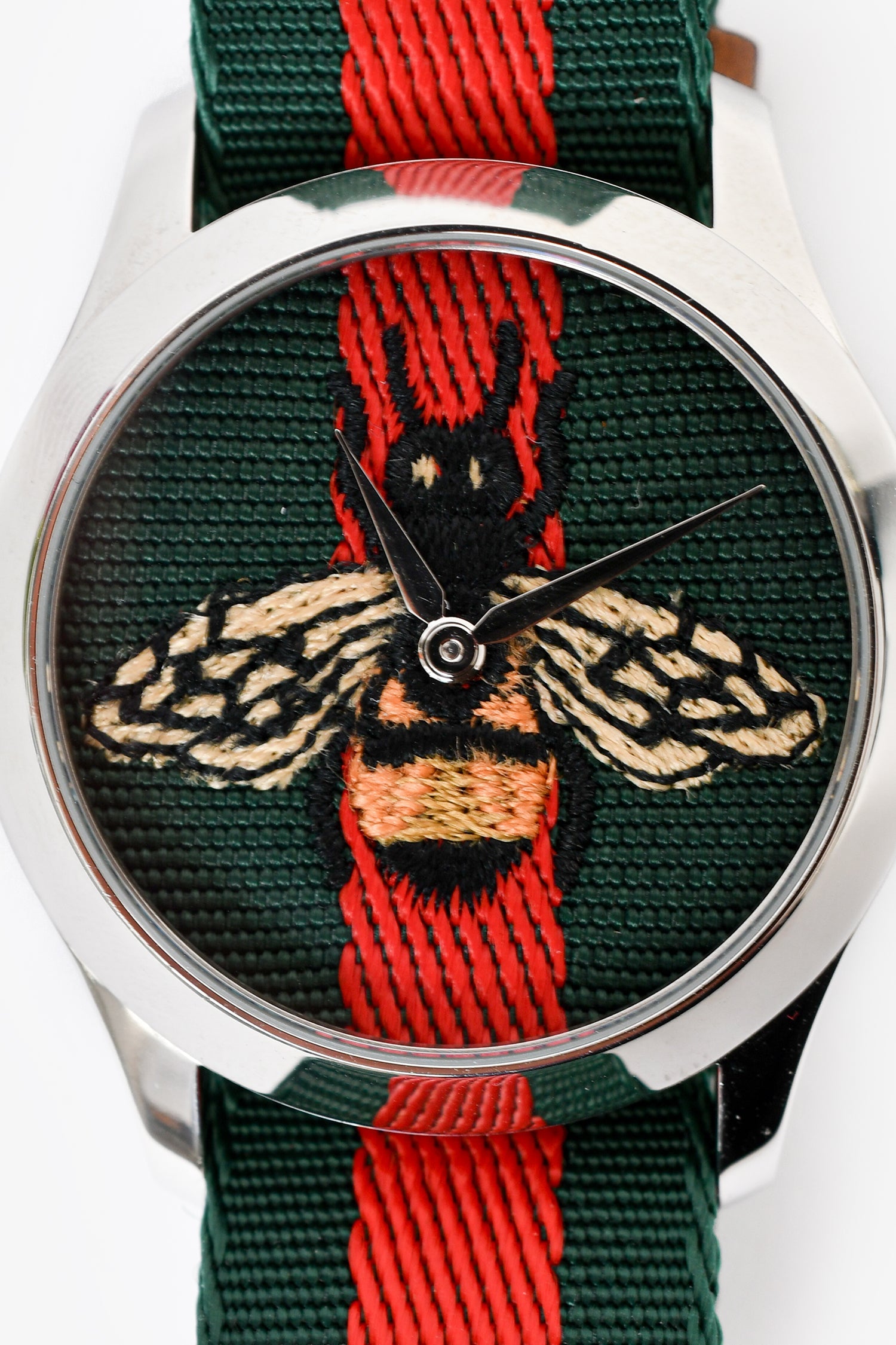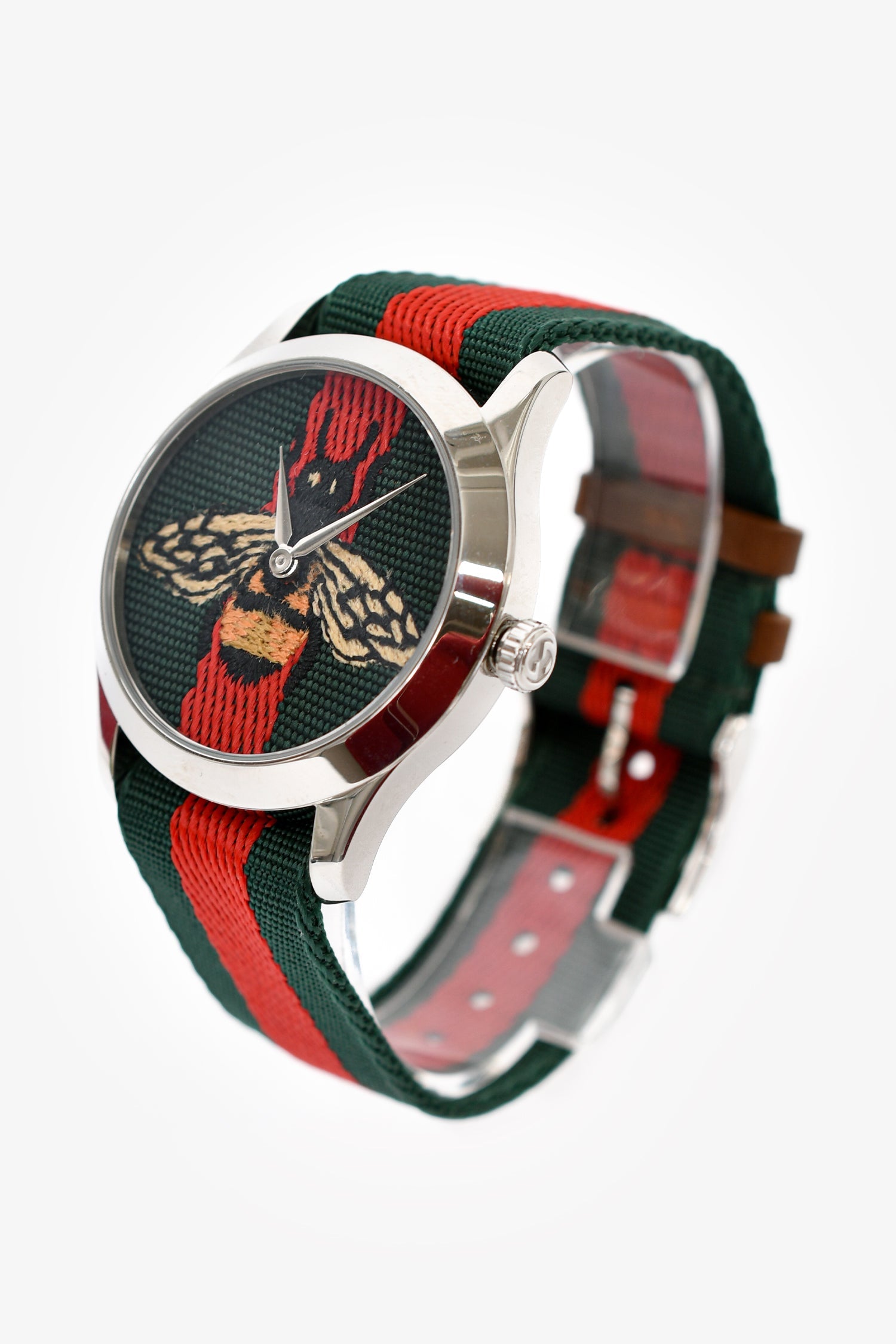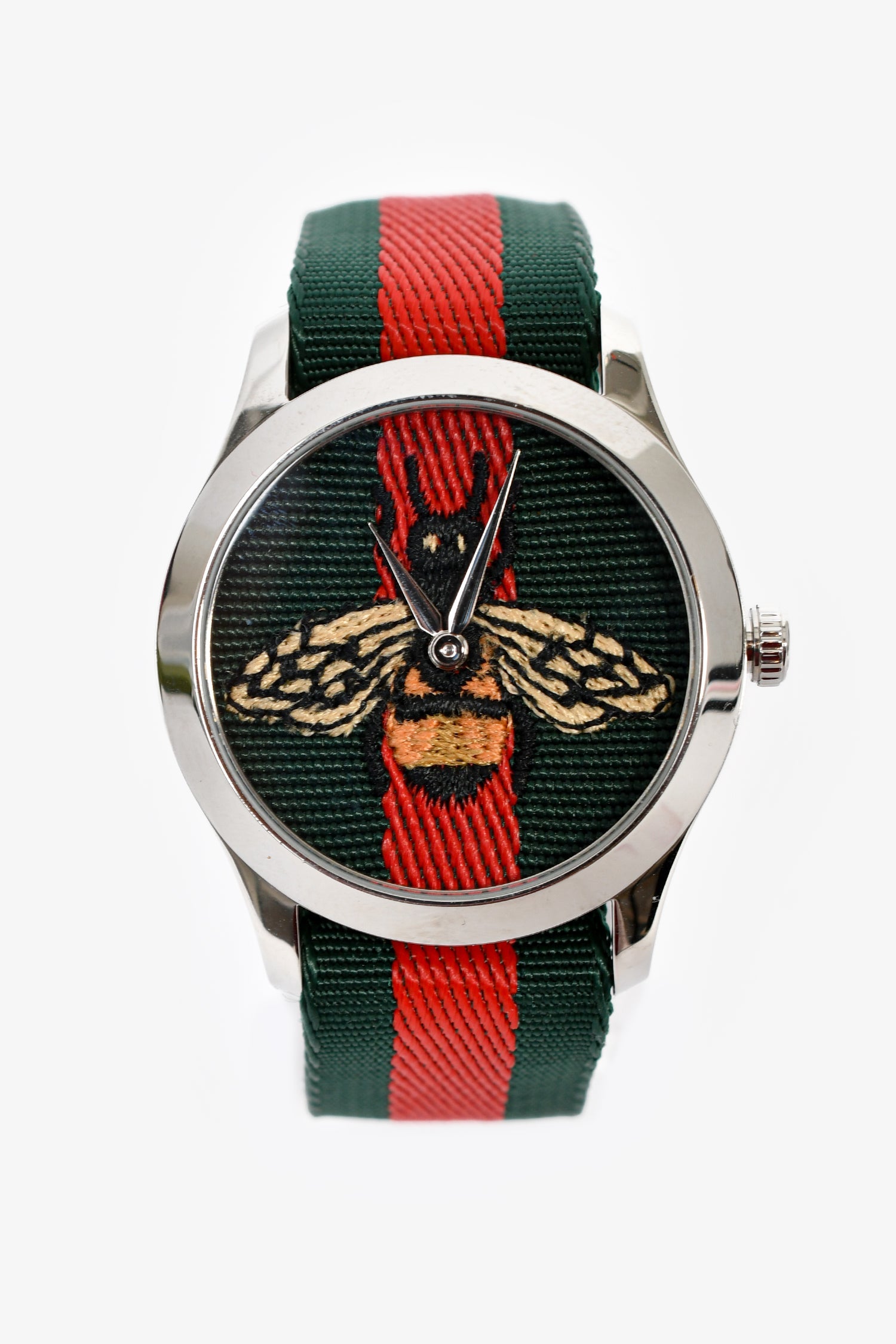 Gucci Red and Green Le Marché Des Merveilles Bee Motif Watch. Round watch face. Adjustable strap. Quartz movement. Silver-tone hardware. Tonal stitching.