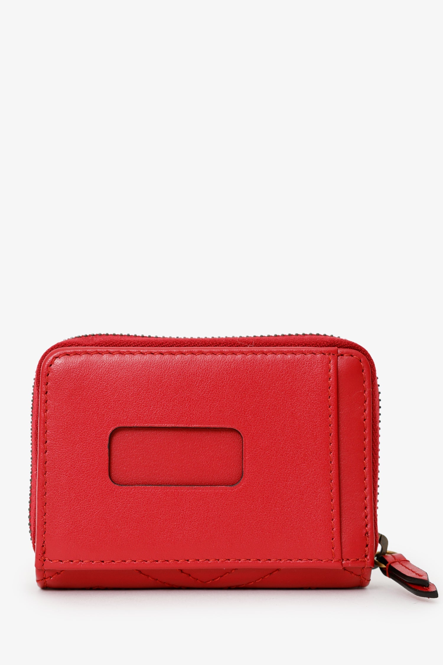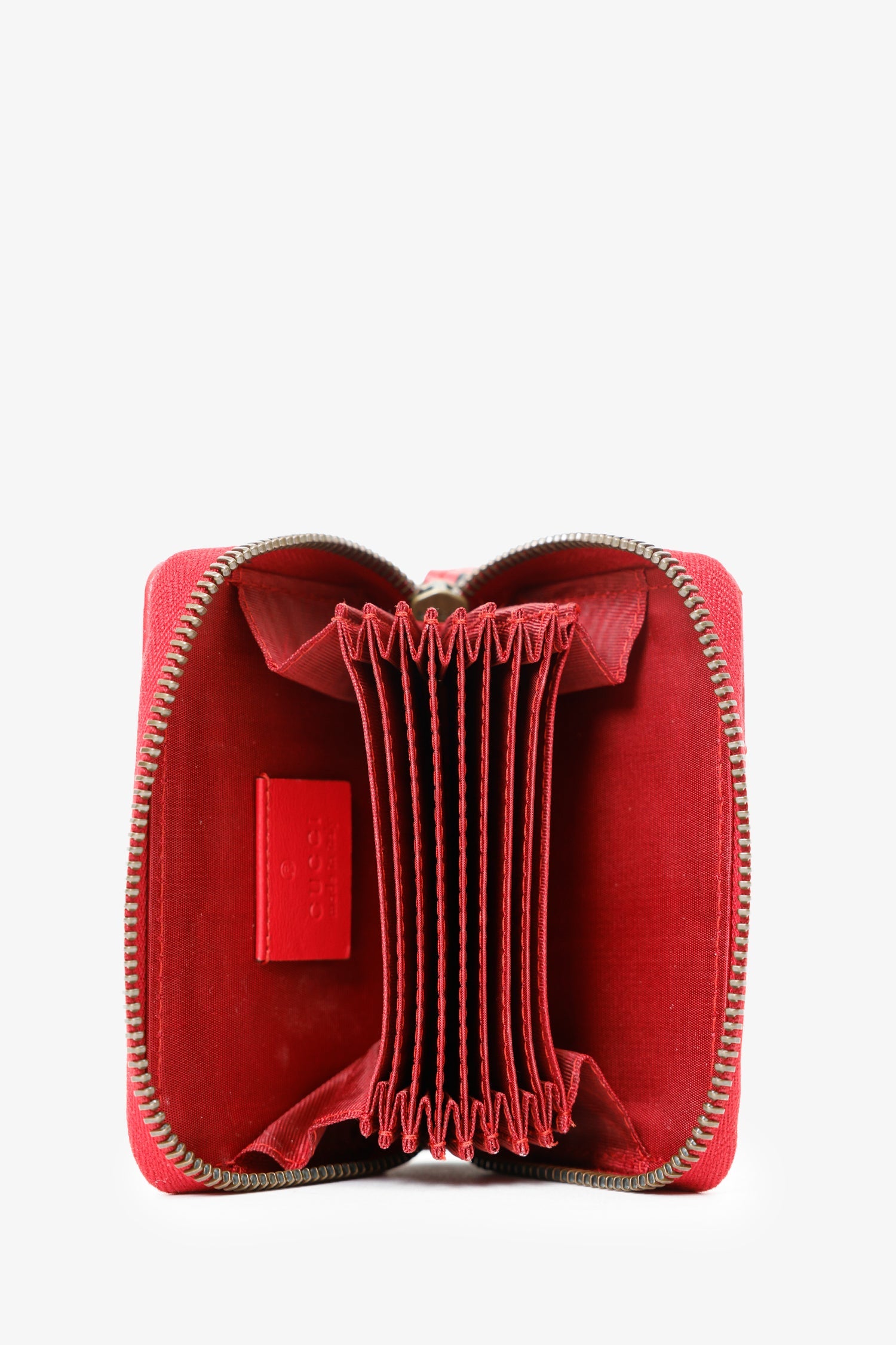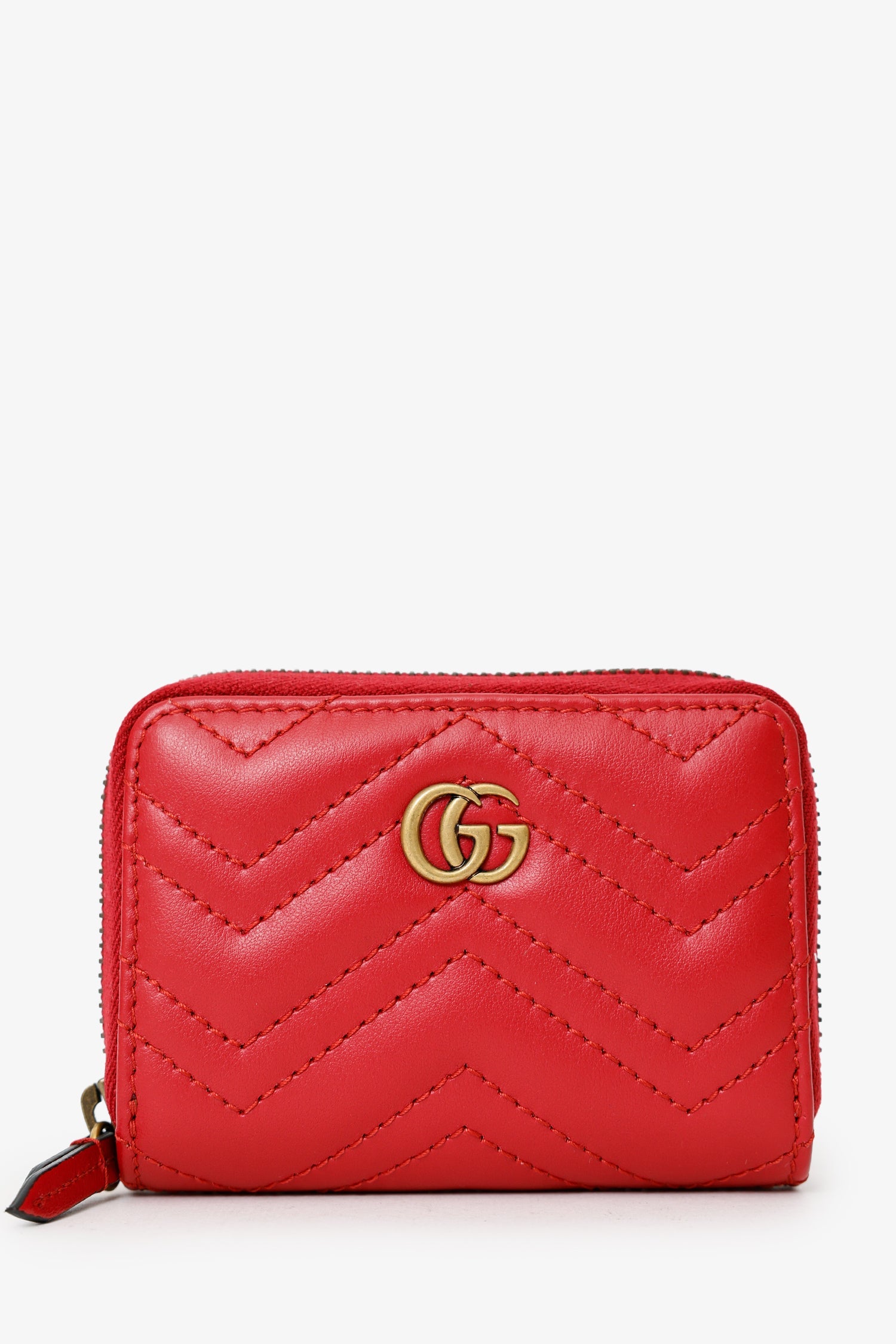 Gucci Red Leather GG Marmont Zippy Wallet. Top zip closure. Rear card slot. Lined interior with 10 accordion-style pockets. Brass-tone hardware. Tonal stitching.