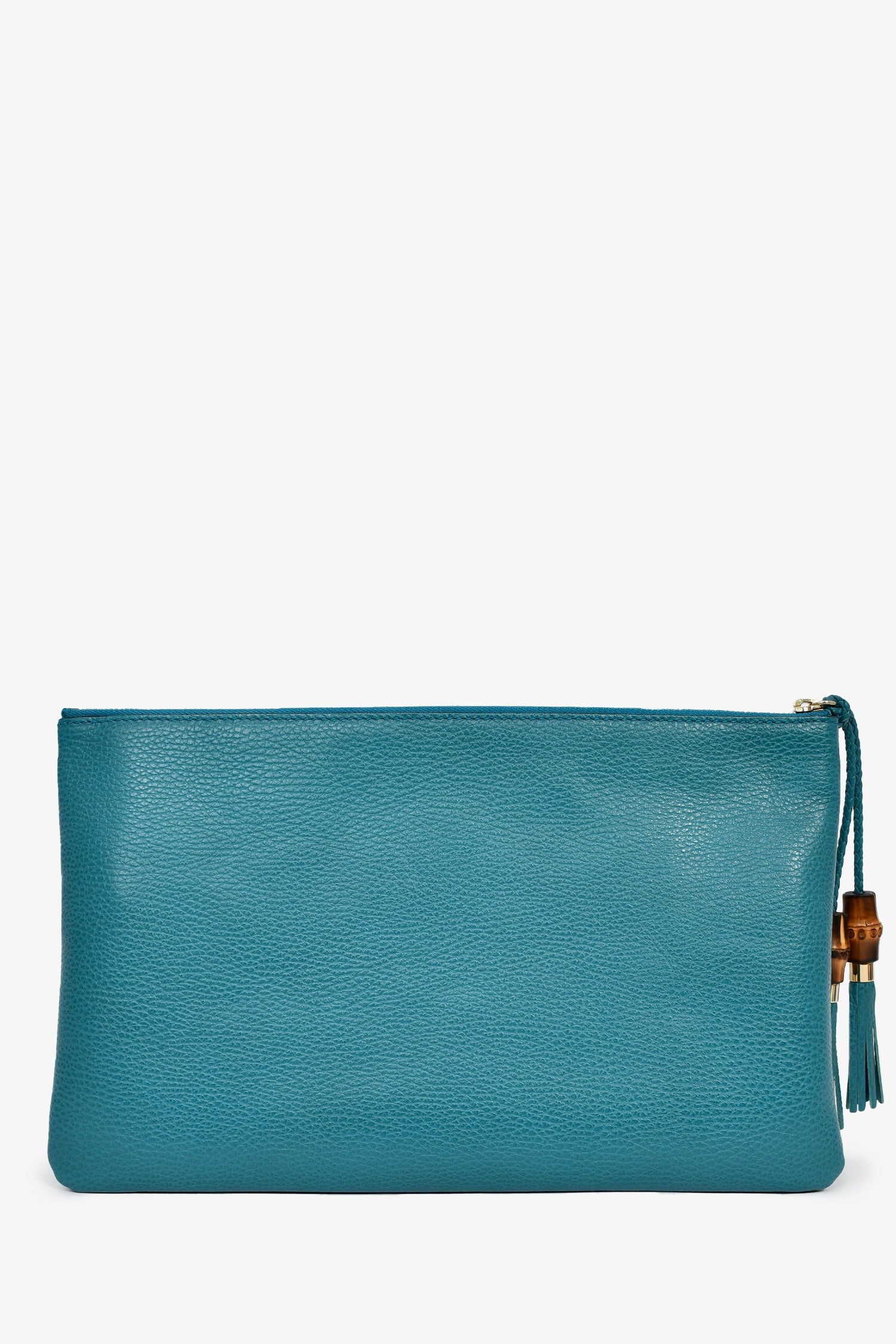 Gucci Turquoise Pebbled Leather Bamboo Tassel Clutch. Top zip closure. Lined interior with a slip compartment. Gold-tone hardware. Tonal stitching.