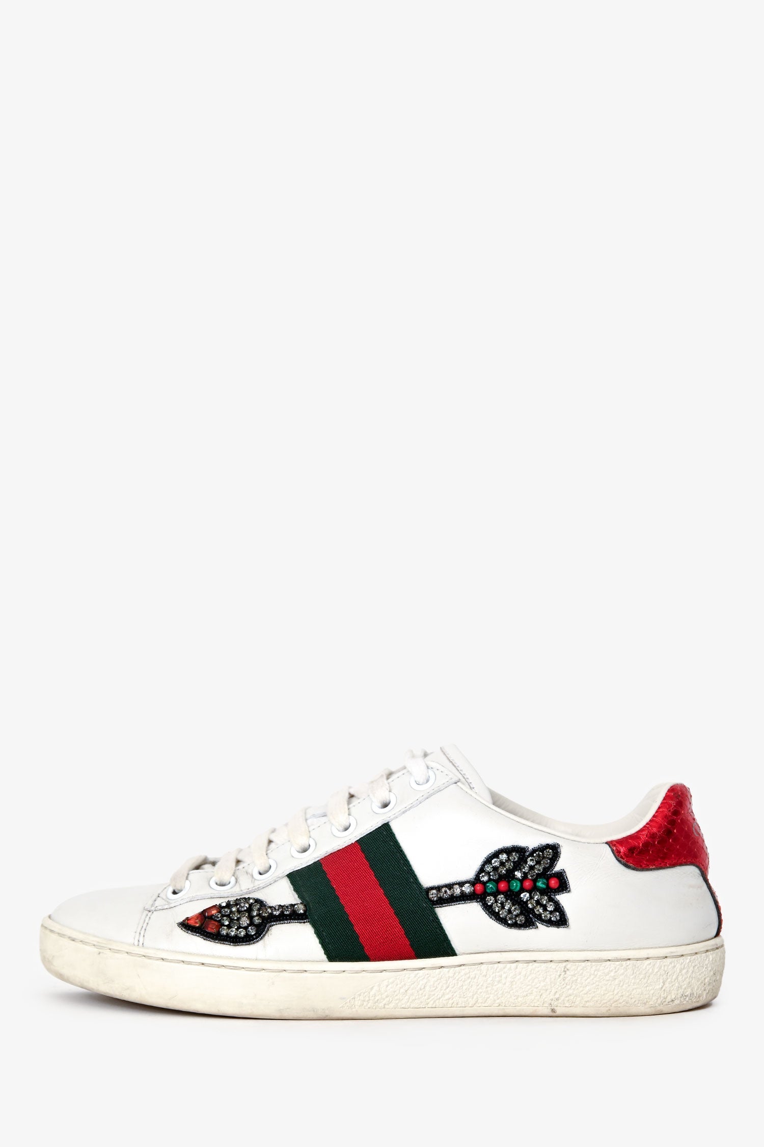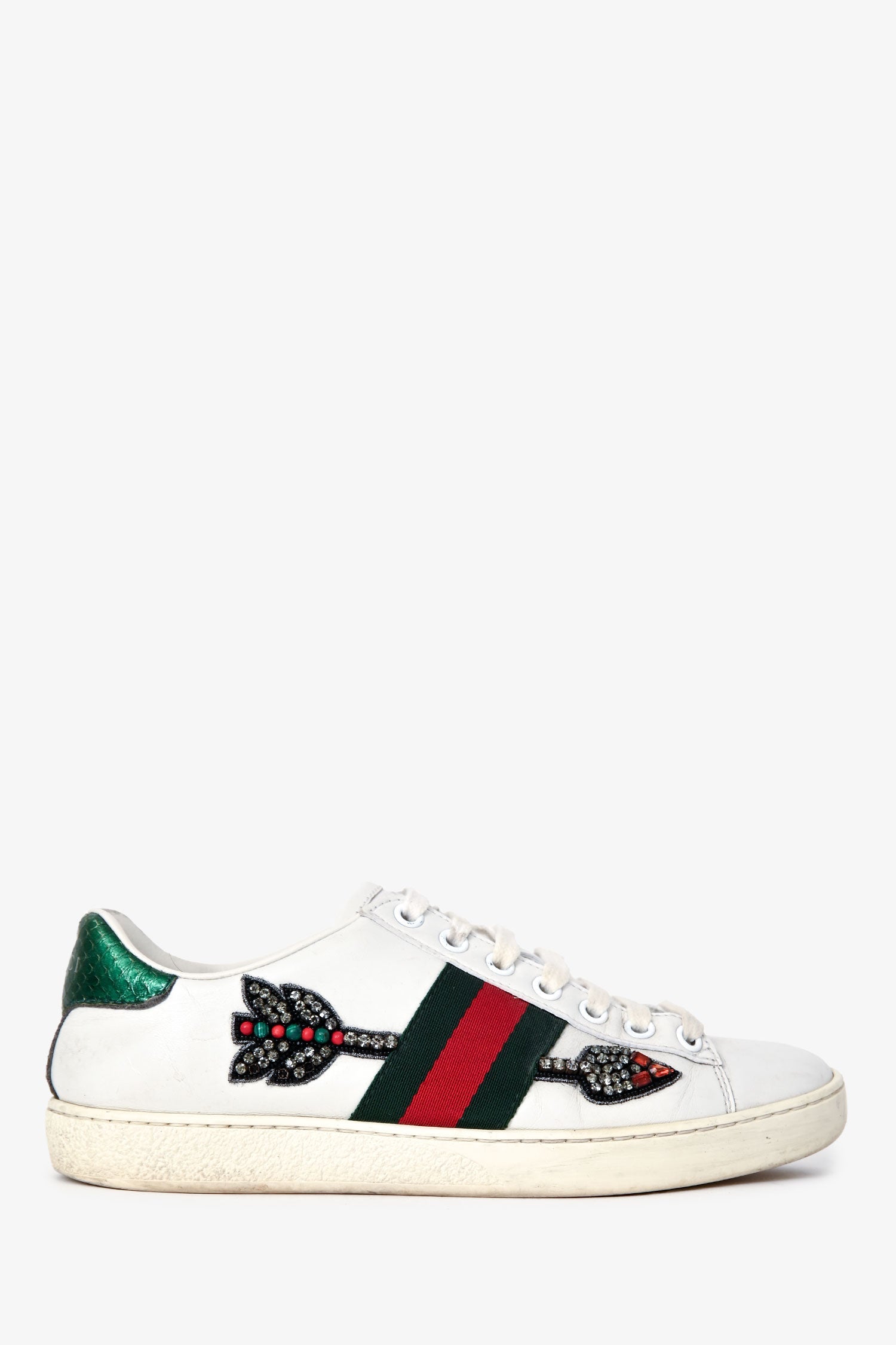 Gucci White Leather Web Arrow Ace Sneakers. Lace-up. Round toe. Leather-lined interior and insole. Rubber sole. Silver-tone hardware. Tonal stitching.